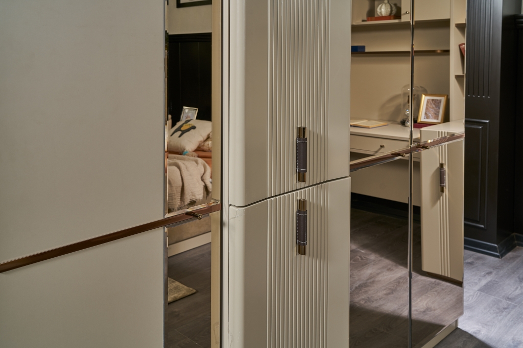Ložnicová sestava CREA je jedním z nejkrásnějších příkladů, který podtrhuje dokonalou harmonii bílé a béžové barvy. Její design září jako hvězda a stává se nejoblíbenější sadou s vysoce uklidňujícím účinkem. Na čalounění je použita měkká tkanina s texturou, která ještě zvyšuje pohodlí. Design čela postele, nočních stolků, moderní komody a bronzových kovových detailů vizuálně doplňuje výrobek a podtrhuje jeho jedinečný styl a půvab. Nábytková sada CREA se Vám prezentuje kreativitou, decentní elegancí, příjemným povrchem, vzdušností a lehkostí bílé barvy v prostoru. Spojení antracitového zlata s dekorem šedého mramoru na úchytkách a jemným vertikálním zdobením čela nábytku umocňuje estetický dojem a přivádí lehkost života do domova Vašich dětí.