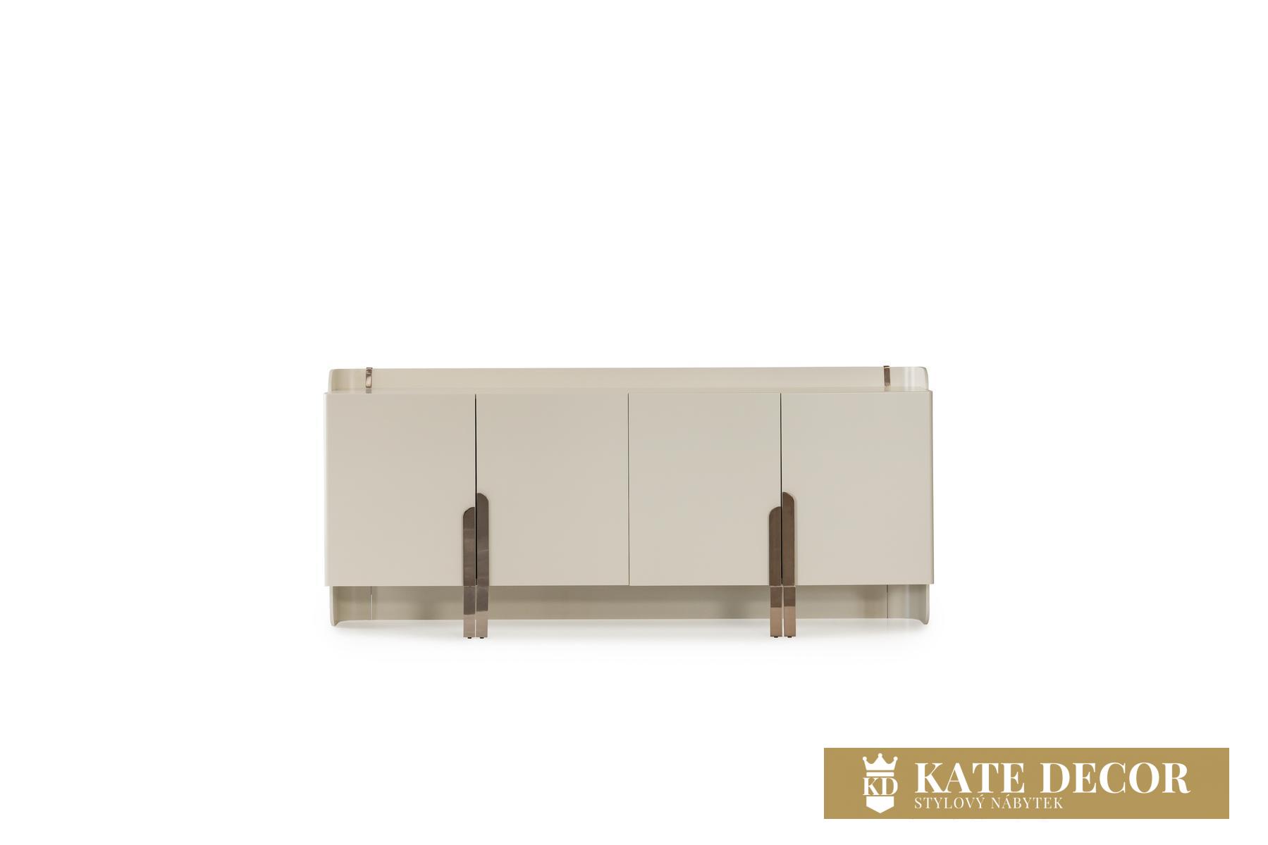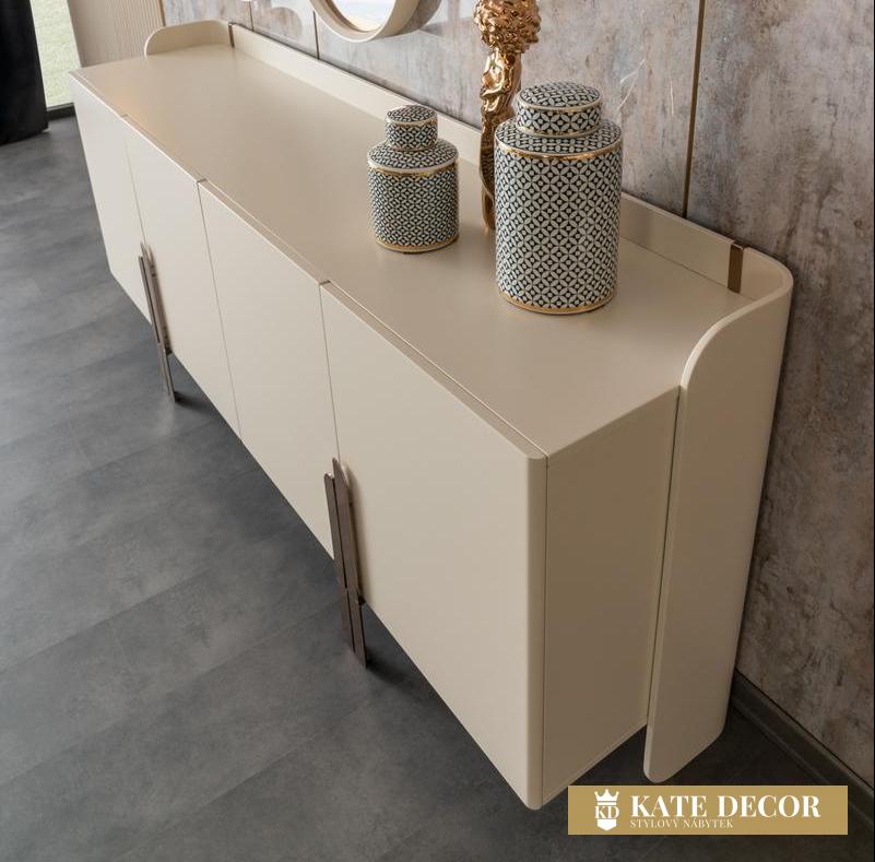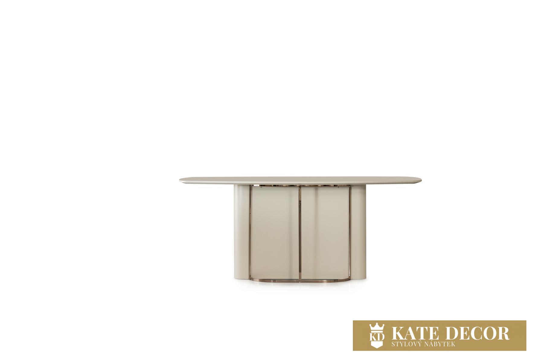 Umění je především o osobním vkusu, touze a vyjádření. Abyste mohli zažít klid, musí být vše ve Vaší domácnosti propojeno v dokonalé harmonii, a to je možné pouze s jídelnou BEYONCE. Svým stylem Vám nabízí nepřekonatelné pohodlí i svůdný vzhled. Sada je vyrobena z materiálů MDF, vysoce kvalitních mechanismů a měkké textilie odolné proti skvrnám, což zaručuje dlouhodobé používání bez deformací. Velmi milá a komfortní bělostná barva sestavy BEYONCE vnáší do Vašeho pokoje stabilitu a vyrovnanost energie. Exkluzivitu zvyšuje kontrast mezi matem příjemné textilie a vysokým leskem nábytku. Zrcadlo komody i atypičnost zlaceného kovu nohou dělá dojem antigravitační lehkosti v prostoru. Zajímavým prvkem je použití stejného motivu jako úchytek komody. Celkový příjemný dojem navozuje střídmost linií, decentní, ale přesto rafinované originální zdobení.