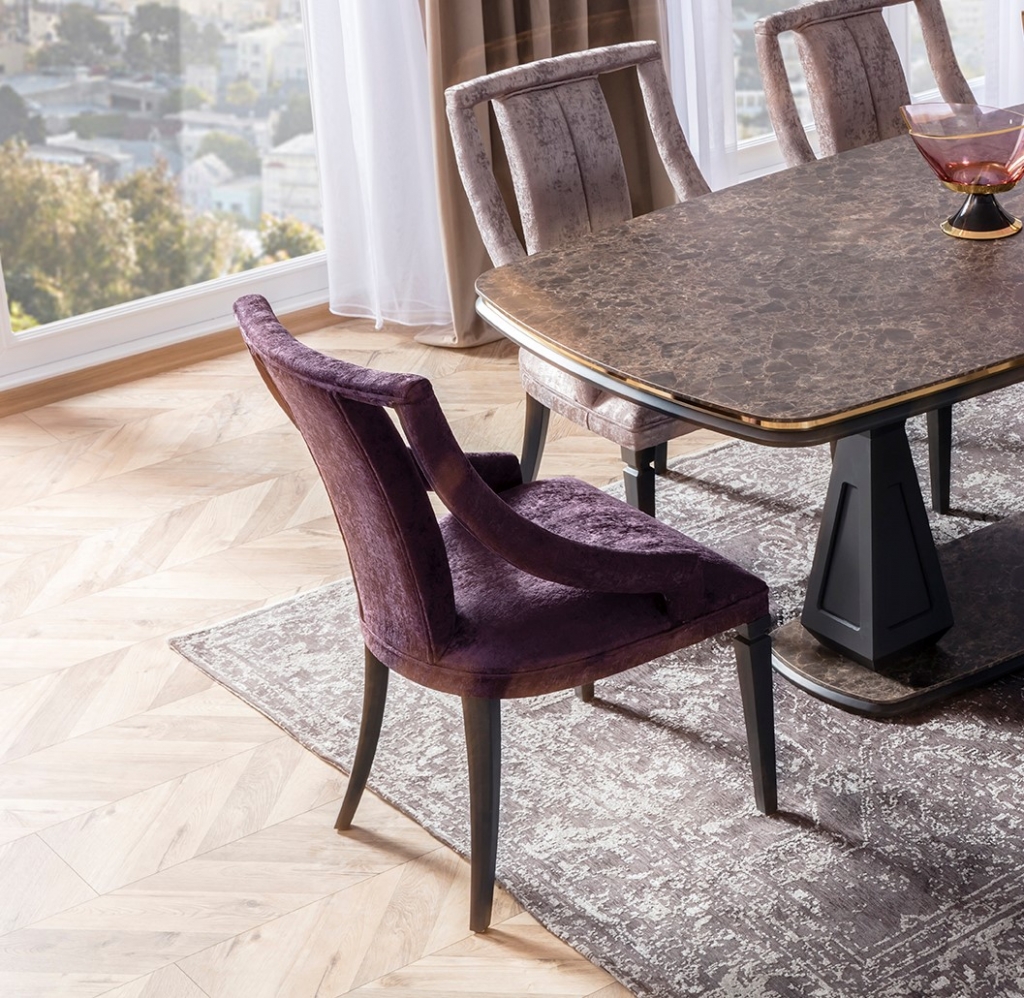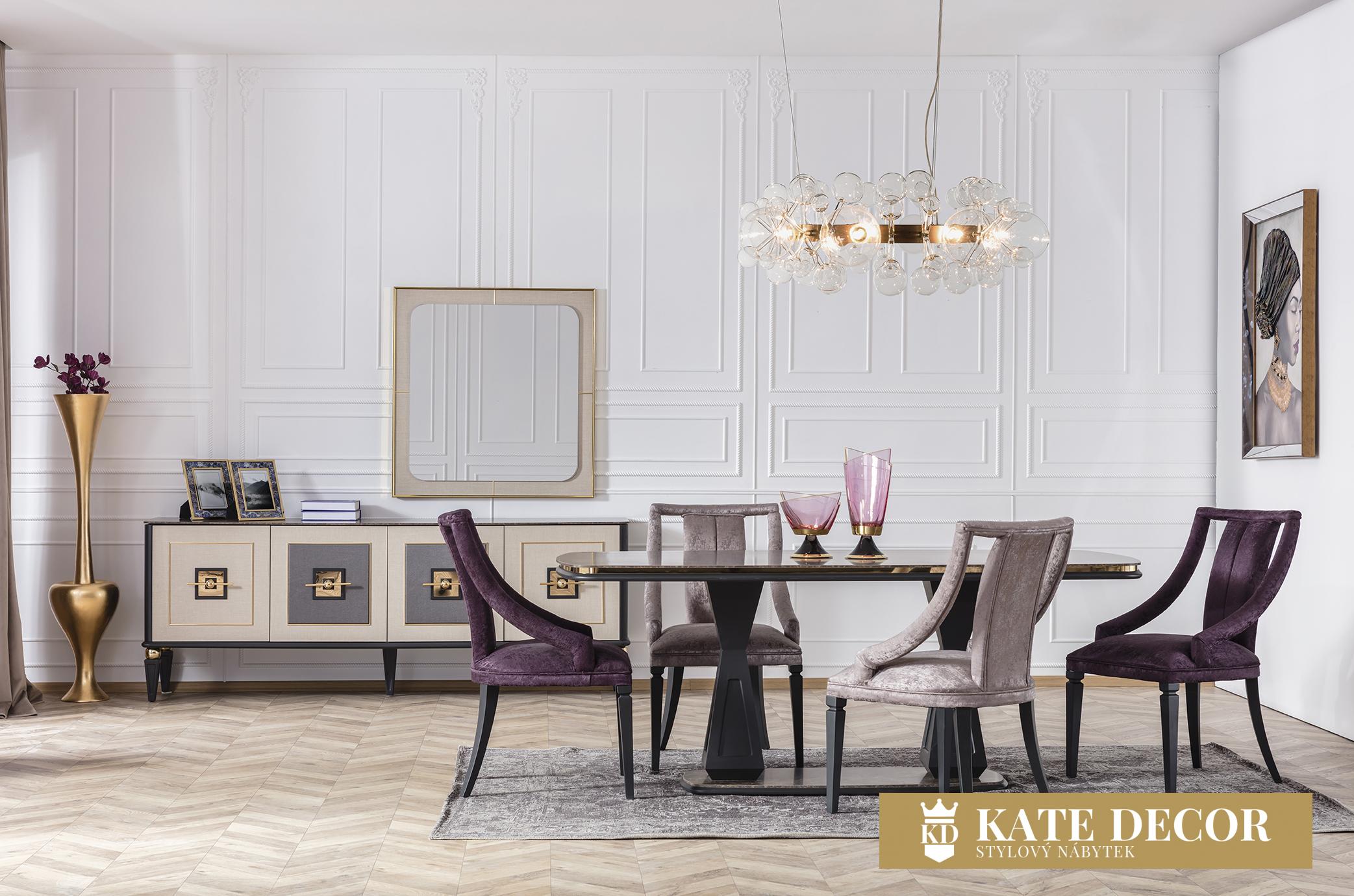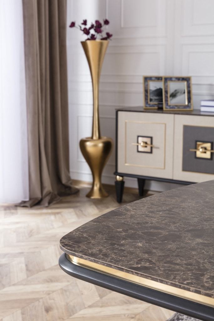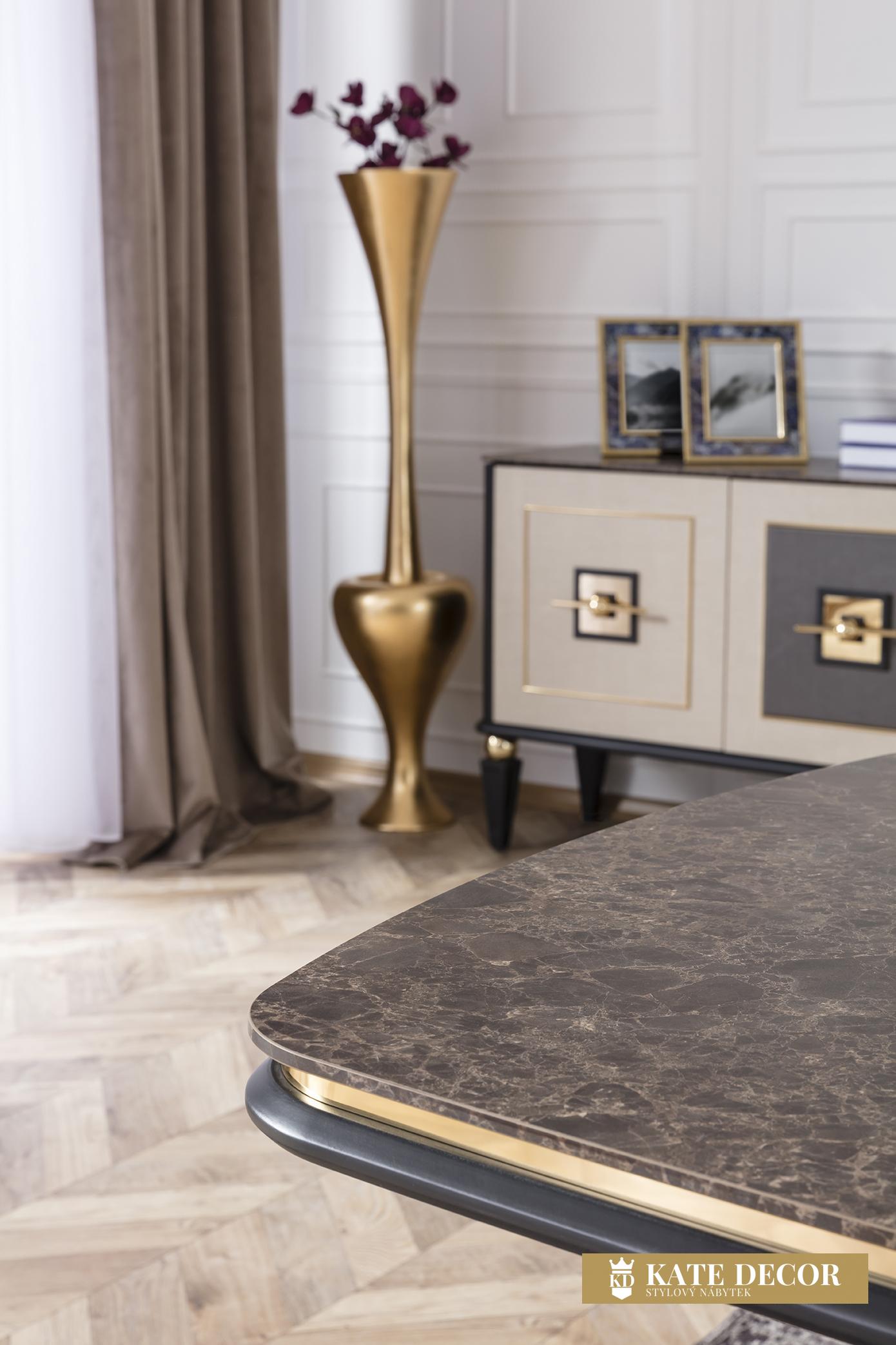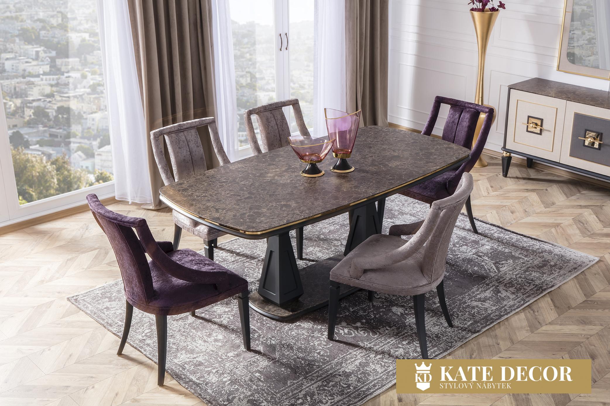 Jídelna GOLD potěší okouzlujícím, jemným a decentním designem. Je připraven poskytnout vám maximální pohodlí, útulnost a styl. Sada je jedním z našich nejudržitelnějších produktů, což zaručují vysoce kvalitní materiály a mechanismy použité při její výrobě. U čalounění se dává přednost měkké strukturované dovážené tkanině, díky níž se zvyšuje odolnost proti skvrnám a výrobky lze používat mnoho let bez deformace. Moderní zlacené detaily, mramorový dekor a harmonické barvy dotvářejí vizuální stránku soupravy a podtrhují její exkluzivitu.