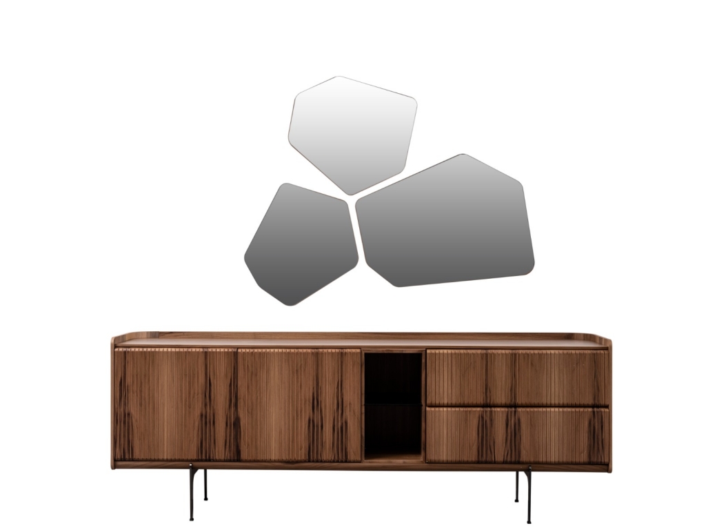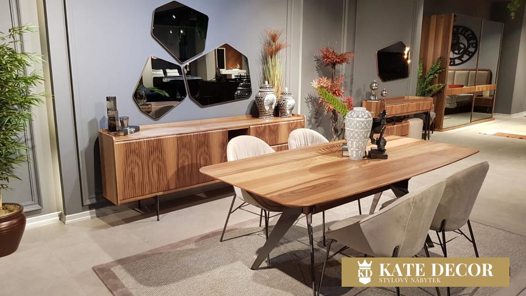 Díky integrované struktuře přírodního dřeva s dekorativními motivy vzniká dynamický jedinečný design. Použití barvy dřeva při řemeslném zpracování vytváří úžasný vzhled jídelny TOKIO. Výběr vysokých nohou nejen podtrhuje jedinečnost soupravy, ale také zajišťuje snadné čištění. Funkčnost jídelního setu zvyšuje dostatek úložného prostoru v příborníku. Nábytková sada TOKIO přináší spojení kovu a přírodního dřeva. Japonská lehkost a vzdušnost nábytku nebrání proudění energií a svým jedinečným designem dodá Vašemu domovu útulnost. Přírodní dekor i barva patří k velmi oblíbeným a stále nadčasovým prvkům. Vyniká nejen svým stylem, ale i uklidňujícím účinkem. Dojem umocňuje stylové zrcadlo v antracitovém odstínu. Sestava TOKIO má smysl pro detail a pravidelné střídání motivu, řád, vyváženost a harmonii. Poskytne Vám ideální soukromý prostor pro regeneraci Vaší vnitřní síly s nádechem moudrosti i zdobnosti dálného Východu.