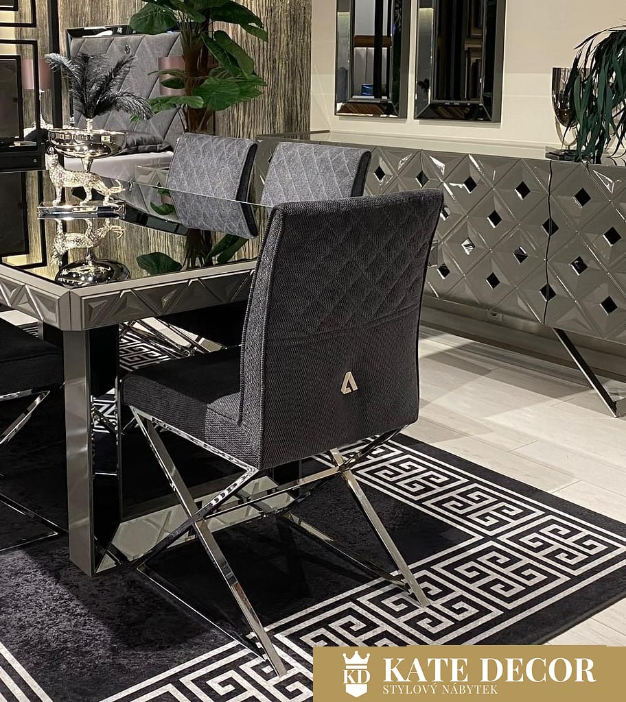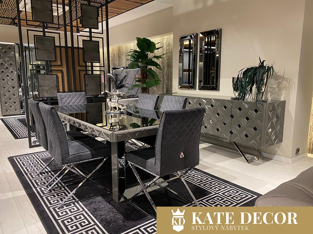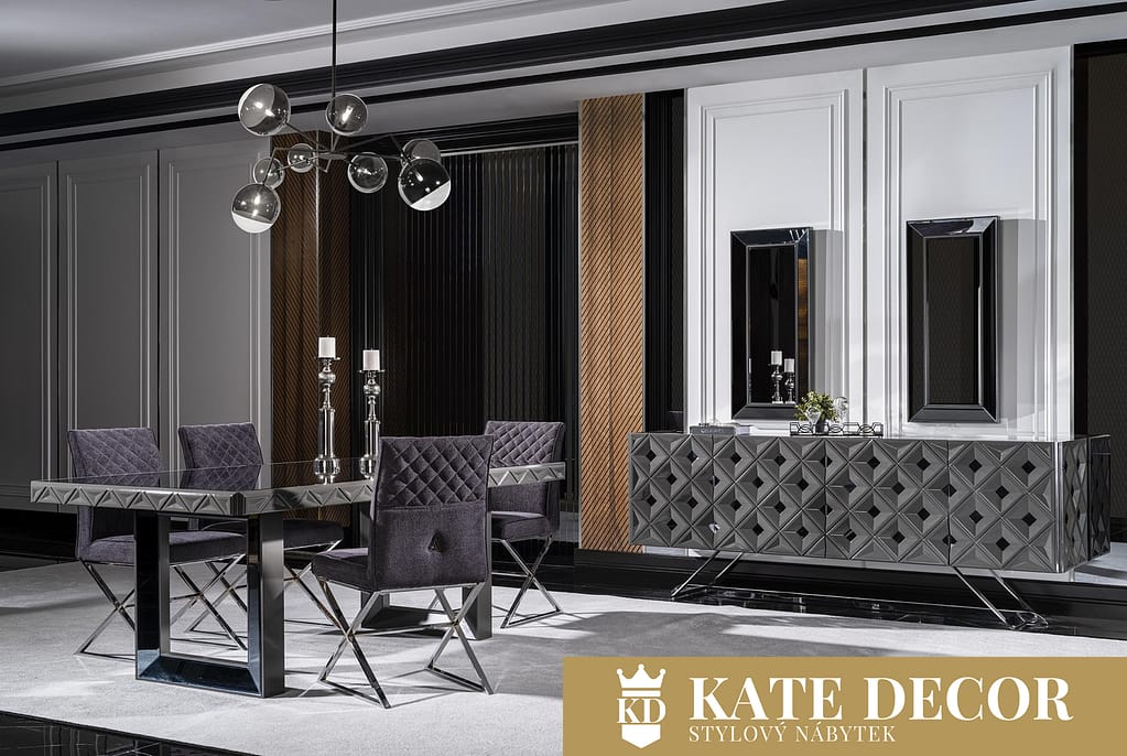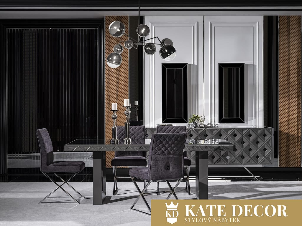 Jídelna VIONA se vyznačuje výrazným designem a je připravena stát se nepostradatelnou součástí Vašeho domova. Úžasná harmonie ecru a černé barvy vytváří okouzlující atmosféru a umocňuje jejich uklidňující účinek. Kromě útulné atmosféry získá Váš pokoj spolu se zrcadlovými aplikacemi, antracitovými detaily a jedinečným designem stylový a estetický vzhled. Sada je vyrobena z materiálů MDF, vysoce kvalitních mechanismů a měkké textilie odolné proti skvrnám, což zaručuje dlouhodobé používání bez deformací.