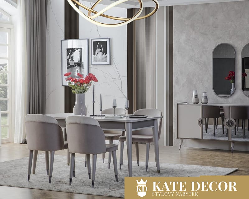Jídelna VIONA se vyznačuje výrazným designem a je připravena stát se nepostradatelnou součástí Vašeho domova. Úžasná harmonie ecru a černé barvy vytváří okouzlující atmosféru a umocňuje jejich uklidňující účinek. Kromě útulné atmosféry získá Váš pokoj spolu se zrcadlovými aplikacemi, antracitovými detaily a jedinečným designem stylový a estetický vzhled. Sada je vyrobena z materiálů MDF, vysoce kvalitních mechanismů a měkké textilie odolné proti skvrnám, což zaručuje dlouhodobé používání bez deformací.
