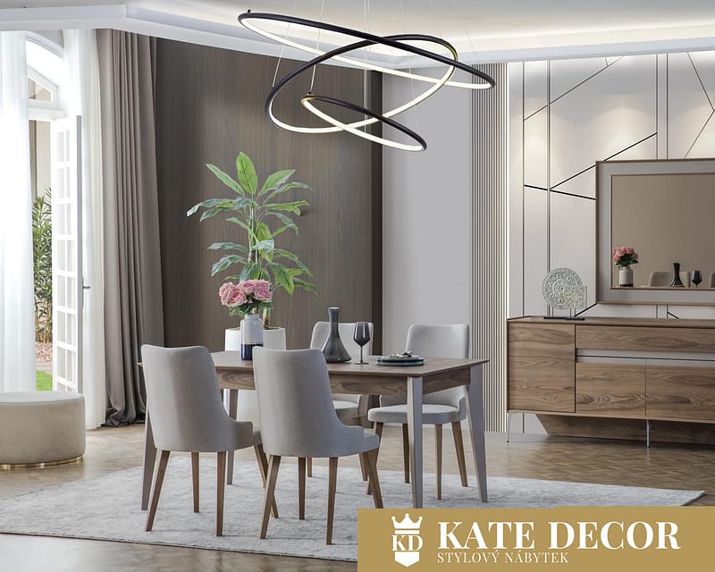 Jídelna VIONA se vyznačuje výrazným designem a je připravena stát se nepostradatelnou součástí Vašeho domova. Úžasná harmonie ecru a černé barvy vytváří okouzlující atmosféru a umocňuje jejich uklidňující účinek. Kromě útulné atmosféry získá Váš pokoj spolu se zrcadlovými aplikacemi, antracitovými detaily a jedinečným designem stylový a estetický vzhled. Sada je vyrobena z materiálů MDF, vysoce kvalitních mechanismů a měkké textilie odolné proti skvrnám, což zaručuje dlouhodobé používání bez deformací.