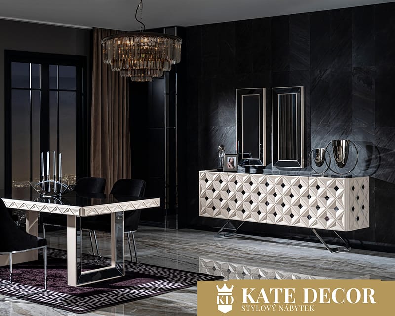 Jídelna VIONA se vyznačuje výrazným designem a je připravena stát se nepostradatelnou součástí Vašeho domova. Úžasná harmonie ecru a černé barvy vytváří okouzlující atmosféru a umocňuje jejich uklidňující účinek. Kromě útulné atmosféry získá Váš pokoj spolu se zrcadlovými aplikacemi, antracitovými detaily a jedinečným designem stylový a estetický vzhled. Sada je vyrobena z materiálů MDF, vysoce kvalitních mechanismů a měkké textilie odolné proti skvrnám, což zaručuje dlouhodobé používání bez deformací.