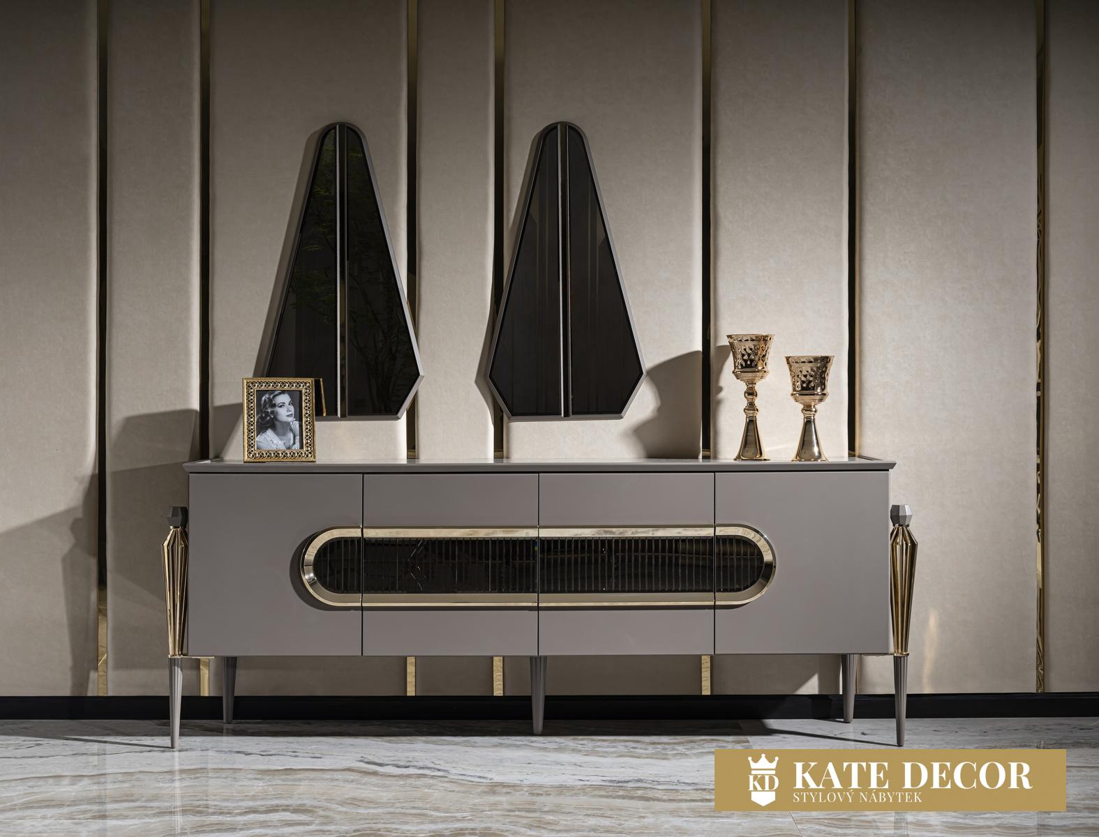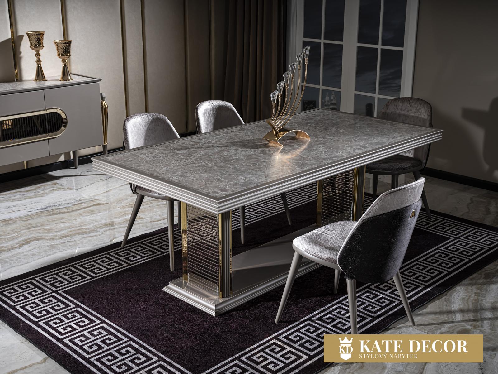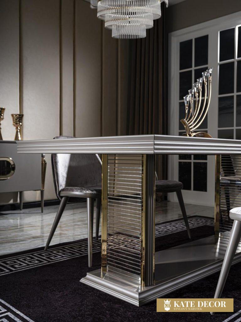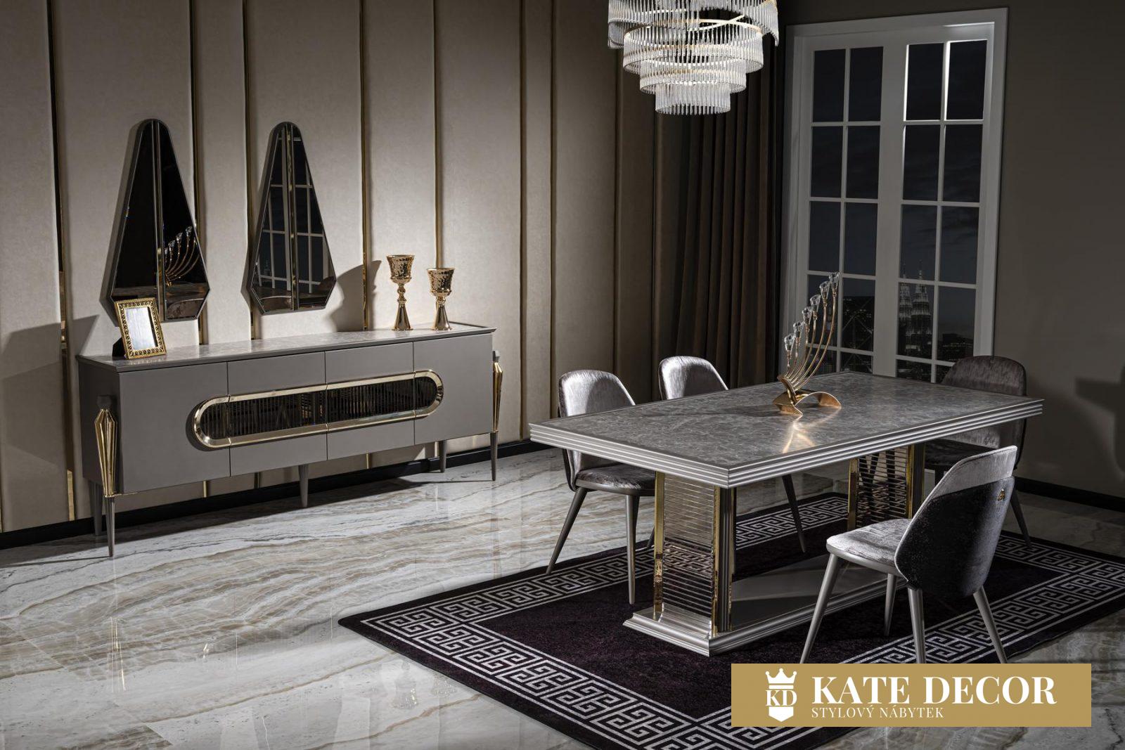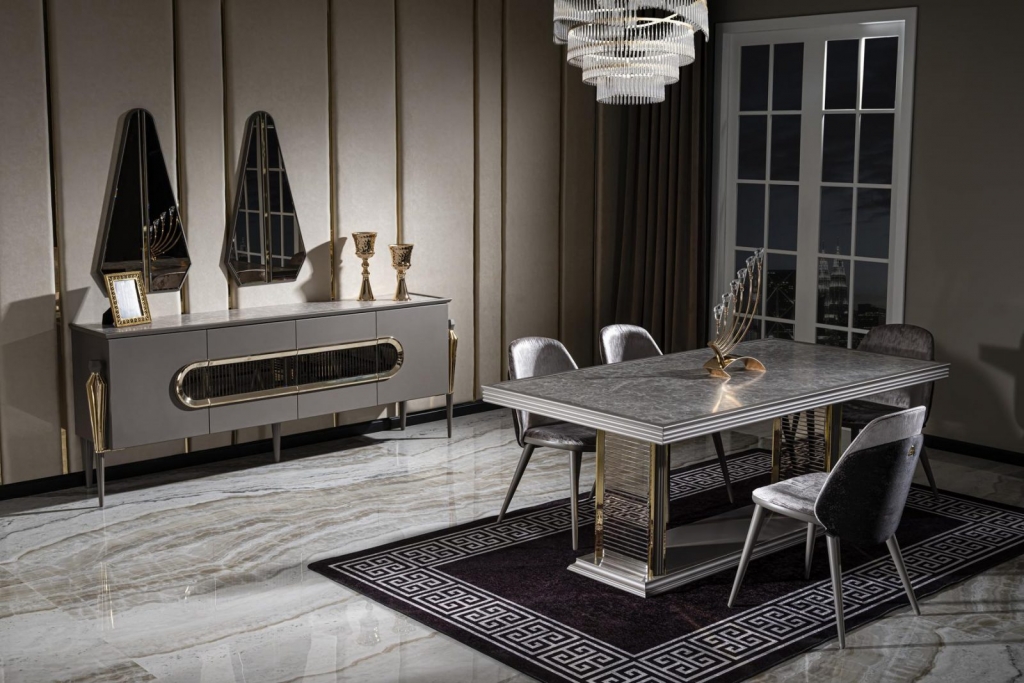 Jídelna LUX MIMOZA je navržena tak, aby podtrhla půvab tmavých barev a dodala Vašemu pokoji styl a eleganci. Splňuje všechny Vaše požadavky na pohodlí, styl a udržitelnost. Sada je vyrobena s velkou přesností, jsou dodrženy všechny pokyny a podmínky. Výrobek má certifikaci TSE (Turecký normalizační institut). Použité materiály a mechanismy patří k nejpreferovanějším a nejstabilnějším typům, díky čemuž Vám s velkou jistotou zaručujeme dlouhodobé používání výrobků. Netradiční a výrazné designové prvky, kombinace materiálů i přítomnost antracitově zlatých aplikací vytvářejí ojedinělou a zajímavou nábytkovou sestavu, z níž každý kus jednotlivě může být okouzlující solitér. Příjemná šedá barva ve spojení se zlatými prvky a horní deska v dekoru leštěné žuly i atypičnost nohou, to vše jsou luxusní a výjimečné detaily nábytku LUX MIMOZA přinášejících do Vašeho domova ojedinělý styl a vytříbený vkus prémiové třídy.