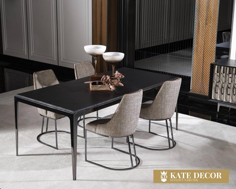 Jídelna BERETTA, která díky svým jedinečným designovým detailům odhaluje modernost a sofistikovanost, je připravena vytvořit stylovou kombinací detailů poutavou místnost. Je vyjádřením letošních módních a dekoračních trendů. Díky němu si můžete splnit své sny o moderním a stylovém pokoji. Jídelna BERETTA, obohacená o jemné detaily a pohodlí, Vám dává možnost vytvořit relaxační a vyrovnaný obytný prostor. Jídelní stůl BERETTA působí vesmírným dojmem. Je vyroben z vysoce kvalitních materiálů odolných proti poškrábání. Kovové nohy připomínaví vesmírný modul, který nadnáší lesklou desku s motivem mramoru připodobněnou k hvězdné mlhovině. Lehkost a vzdušnost nechává proudit Vaše energie a povznáší je ke hvězdám.