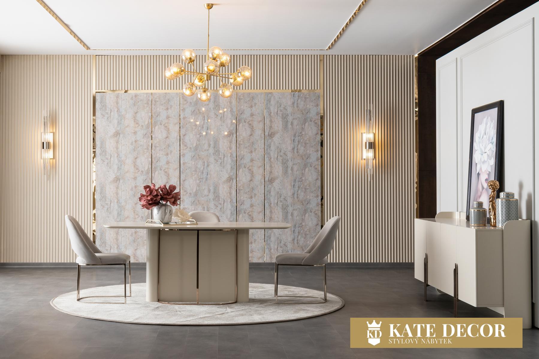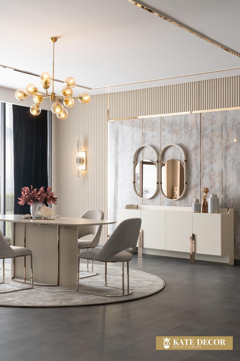 Umění je především o osobním vkusu, touze a vyjádření. Abyste mohli zažít klid, musí být vše ve Vaší domácnosti propojeno v dokonalé harmonii, a to je možné pouze s jídelnou BEYONCE. Svým stylem Vám nabídne nepřekonatelné pohodlí i svůdný vzhled. Sada je vyrobena z materiálů MDF, vysoce kvalitních mechanismů a měkké textilie odolné proti skvrnám, což zaručuje dlouhodobé používání bez deformací. Velmi milá a komfortní bělostná barva sestavy BEYONCE vnáší do Vašeho pokoje stabilitu a vyrovnanost energie. Atypičnost patinovaného kovu nohou dělá dojem antigravitační lehkosti v prostoru.
