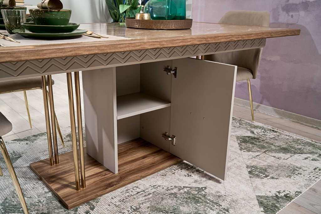 Jídelna ELSA je jednou z nejkrásnějších ukázek ruční práce, která navždy zůstane ve vzpomínkách Vašich hostů i Vás samotných. Je vyrobena z prvotřídní jemné lakované dřevotřískové desky, odolné proti poškrábání. Jeho elegantní stůl, stylové židle a konzolové zrcadlo dodají Vašemu pokoji příjemnou akustiku a stylový vzhled. Funkčnost jídelny zvyšují četné skříně a dostatek úložného prostoru, který poskytuje příborník. Výběr jídelny ELSA vnese do Vašeho domova kouzlo a okouzlující atmosféru. Krásný přírodní dekor i odstín, zrcadlové aplikace, zlato a leštěný mramor jsou známkou luxusu. Stůl s lehkostí podpírají zlacené kovové nohy s centrálním úložným prostorem v zajímavé stylizaci.