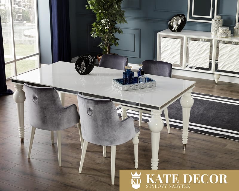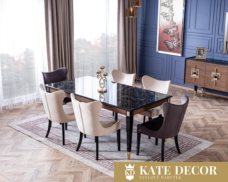 Jídelna ZEN GOLD, která kombinuje designový koncept s výraznými antracitovými detaily, je svým stylem připravena stát se nepostradatelnou součástí Vašeho domova a zůstat ve vzpomínkách Vašich hostů. Je vyrobena z kvalitního materiálu MDF, který je odolný proti poškrábání. Elegantní stůl, stylové židle a konzolové zrcadlo vnesou do Vašeho pokoje půvab a šarm. Stůl ZEN GOLD je díky kombinaci moderních a elegantních kovových detailů a barevnému nádechu navržen tak, aby ozdobil a dodal Vašemu domovu styl a jedinečnost originality i vkusu. Detaily, tónování i designové akcenty zlata zdůrazňují ladnost, která se snoubí s velkolepostí i zajímavé stylizaci nohou. Kvalita materiálů a design vytváří stylový a luxusní dojem.