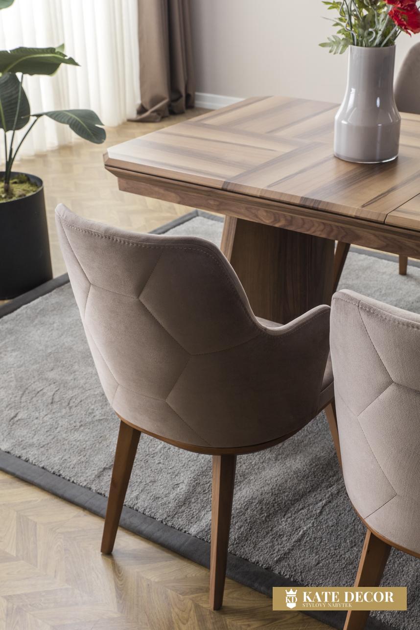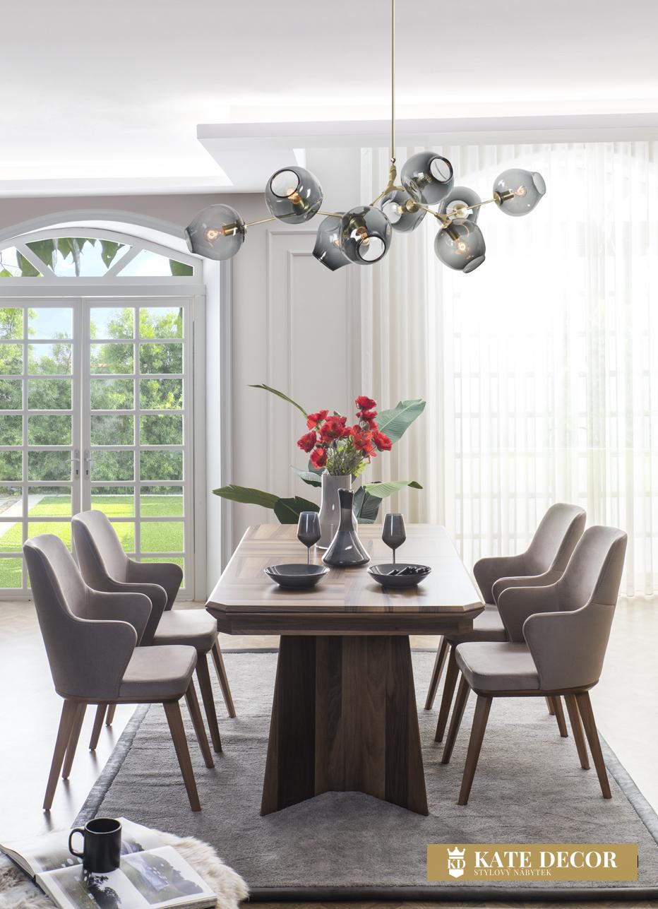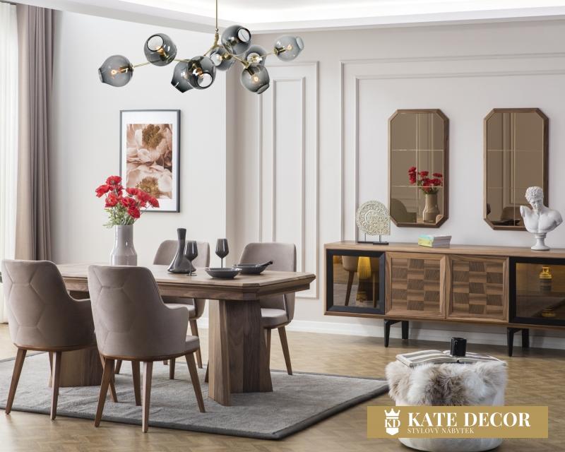 Jídelna ARYA je jedním z nejkrásnějších příkladů ručně vyráběného nábytku, který navždy zůstane ve vzpomínkách Vašich hostů i Vás samotných. Jeho elegantní stůl a stylové židle dodají Vašemu pokoji příjemnou akustiku a stylový vzhled. Funkčnost jídelny zvyšuje několik skříněk a dostatek úložného prostoru pro bufet. Výběr jídelny ARYA s povrchovou úpravou v ořechovém dřevě Vás vybízí ke stolování v přírodě a ke klidnému a relaxačnímu působení Vašeho domova.