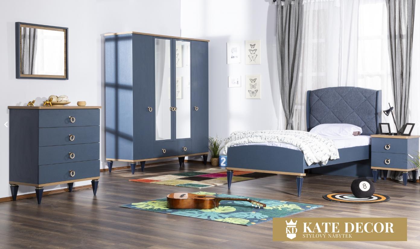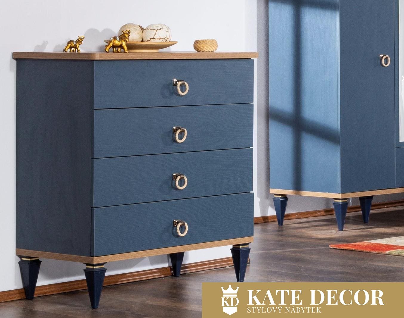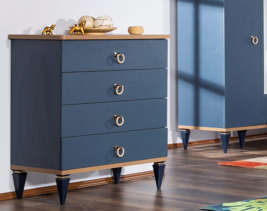 Detail jemného zlacení nohou, modré odstíny nábytku ve spojení s kovem úchytek ve tvaru kruhu a přírodním odstínem i vzorem dřeva působí harmonicky na každou duši a to i tu dětskou. Připomíná tak plachetnici na klidném moři, ztišující mysl Vašeho dítěte a pomůže ukolébat jeho sny a přivézt jej do bezpečného přístavu Vašeho domova.