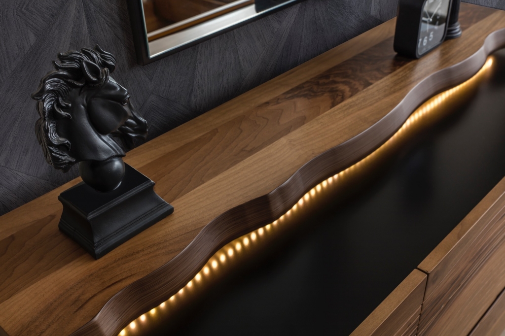 Představujeme jedinečný design OPTIMUS. Dřevěné aplikace a zrcadlo vytvářejí moderní produkt, který zůstane navždy ve vzpomínkách jeho milovníků. Ložnice byla navržena s velkou precizností. Je připraven splnit všechny Vaše sny o teplém útulném a zároveň stylovém pokoji. Pocit života v klidu a maximálním pohodlí je nepopsatelný. Sada OPTIMUS Vám umožní pocítit tyto emoce v každém koutě Vašeho domova. Komoda OPTIMUS dodá Vašemu domovu útulnost a praktičnost a tím lehkost života. Při výrobě se upřednostňují tmavé tóny, které výrobku dodávají na solidnosti. Modernost a příjemný dojem potrhují jemné detaily, zdobené čelo a efektní LED osvětlení v teplém spektru. Zvýšená deska přináší pocit masivu a kontaktu s krásou přírody i dekorem dřeva. Nábytková sada OPTIMUS i každý jednotlivý solitér vyniká svým stylem, funkčností, ale i uklidňujícím účinkem.