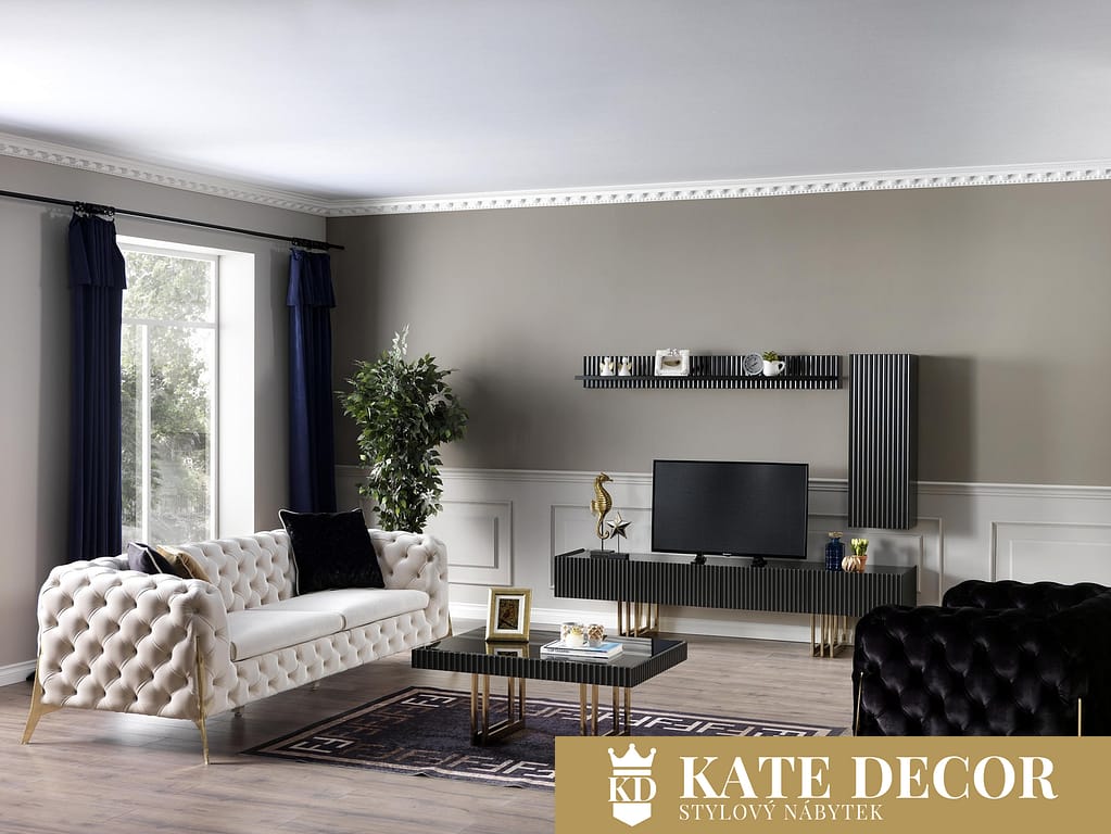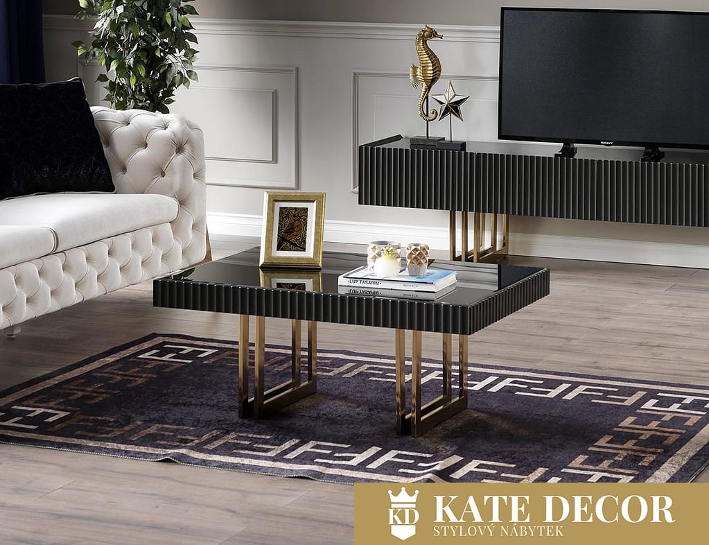 Lákavá sestava SENFONI, kam tento konferenční stolek náleží přináší do Vašeho domova nevšední styl. Černá barva hluboké noci se zlatými nohami působí jako příjemný luxus. Oslnivým design, tmavé sklo stolků, stylové čelo, podnoží i vertikální detaily s jednoduchými liniemi dekoru působí lehce i velmi elegantně.