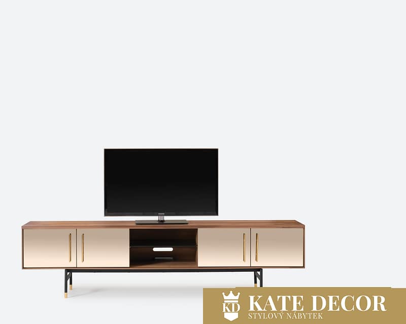 Lákavá sestava SENFONI, kam tento konferenční stolek náleží přináší do Vašeho domova nevšední styl. Černá barva hluboké noci se zlatými nohami působí jako příjemný luxus. Oslnivým design, tmavé sklo stolků, stylové čelo, podnoží i vertikální detaily s jednoduchými liniemi dekoru působí lehce i velmi elegantně.