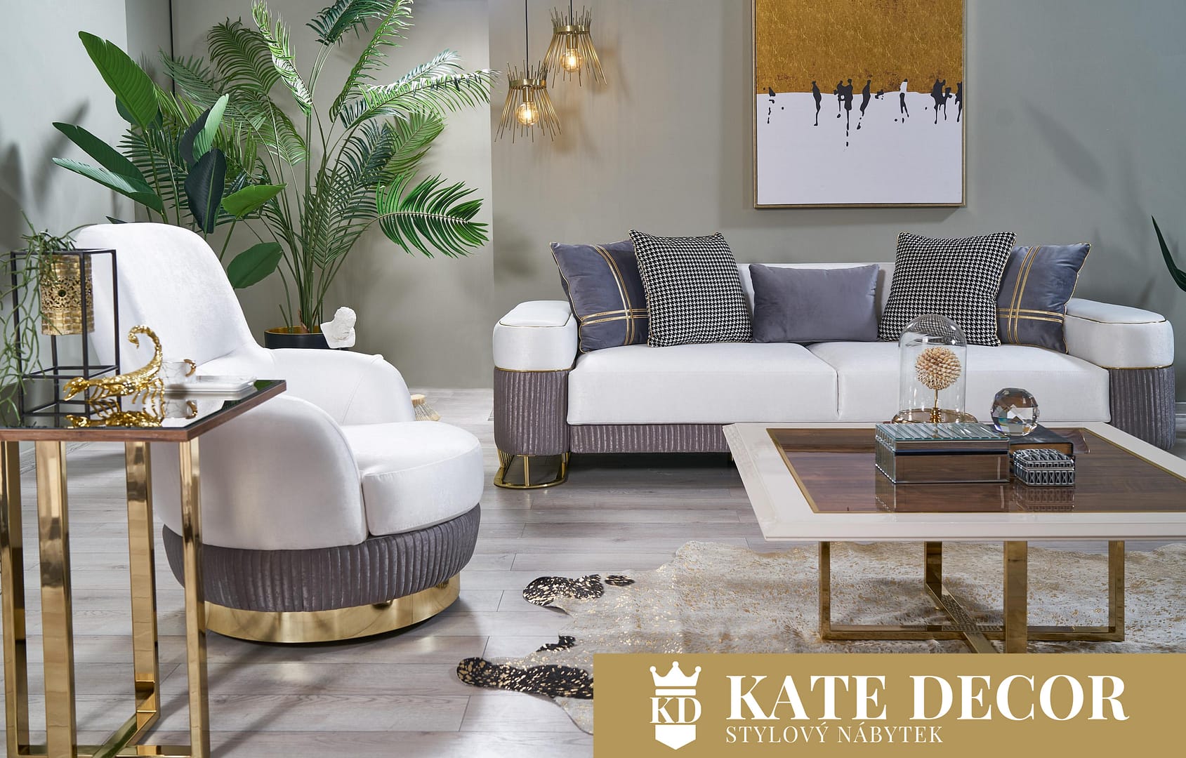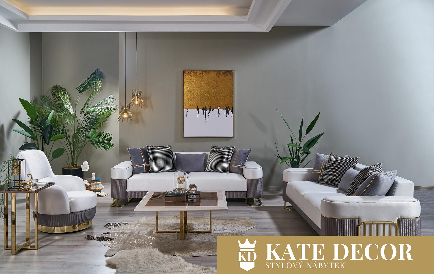 S potěšením Vám představujeme naši novou speciálně navrženou obývací sestavu VIEN. Díky svému jedinečnému designu je připraven dodat Vašemu pokoji vizi a šarm. Vysoké zlacené nohy v kombinaci s kovovými detaily na koncích pohovky činí výrobek atraktivním a nenahraditelným. Dekor s kapitováním ve spodní části, jedinečná barevná harmonie a zlacení soupravě vizuální přitažlivost a styl.