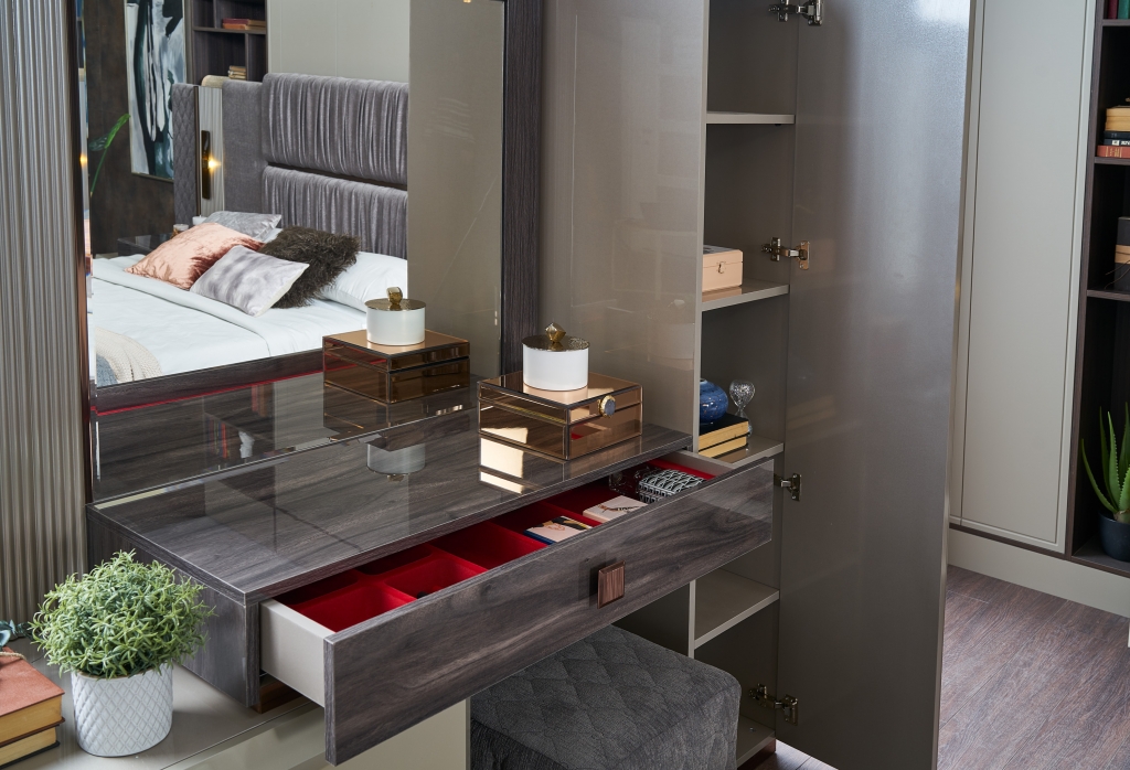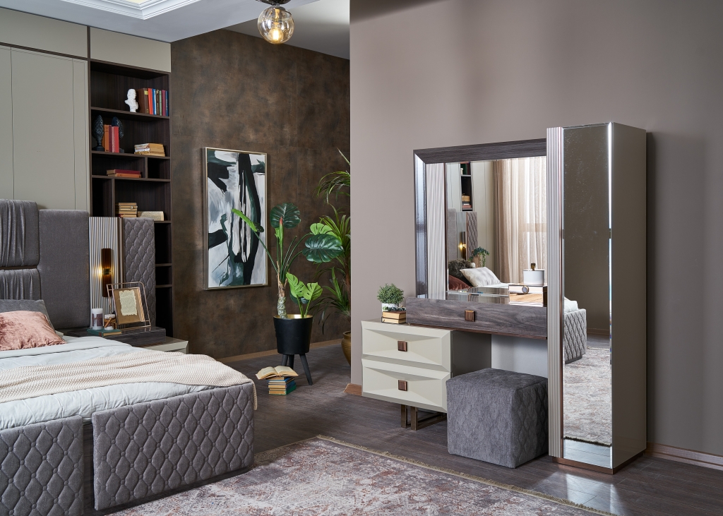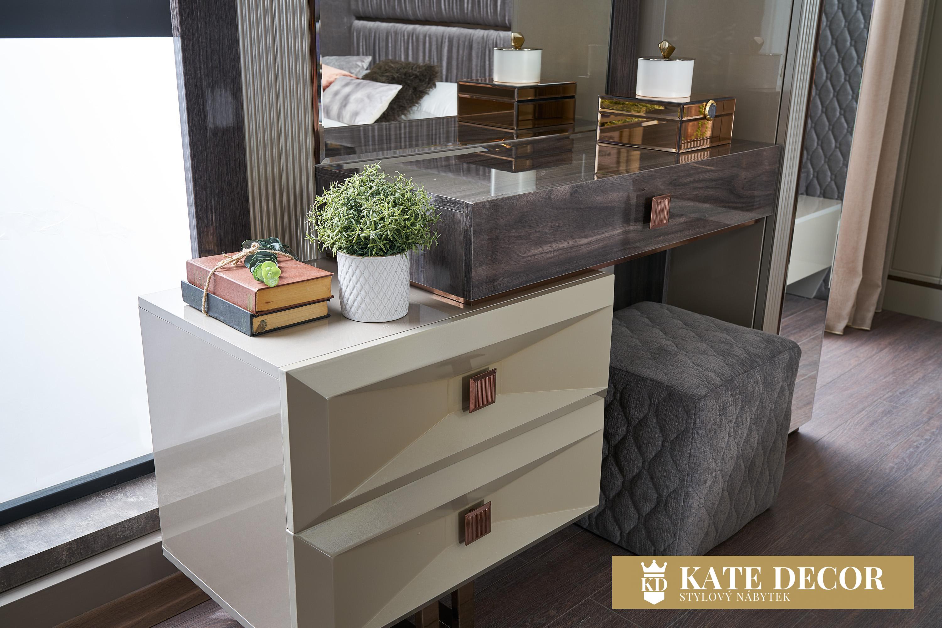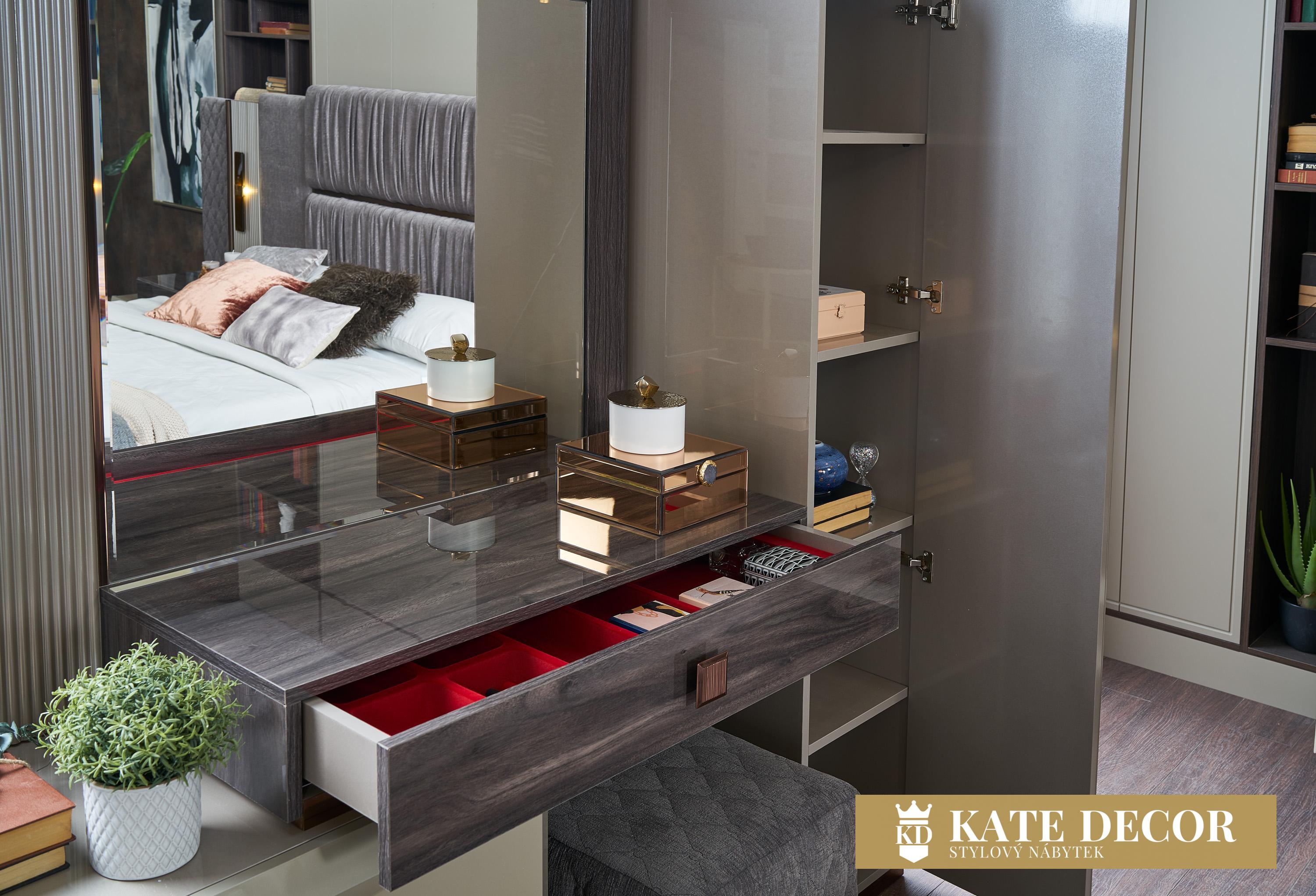 Z naší jedinečně navržené ložnice DANTE nebudete moci spustit oči. Přináší Vám nadčasovou eleganci a luxus spojený s technologií moderní doby. Vysoký lesk šatní skříně, zlaté aplikace i antracitové úchytky spolu s odstínem šedé působí svěže. Zabudované zlaté LED osvětlení v teplém spektru, uvolněná atmosféra, příjemný zklidňující šedý odstín textilie, propracované detaily a zdobení čela to vše vytváří harmonii, klid a eleganci. Správné a stabilní spojení čalouněného čela se základnou zaručuje spokojené užívání po mnoho let. Speciálně navržené rošty poskytují bezpečí. Velkoryse pojatý úložný prostor postele otvírá trvanlivý a lehce ovladatelný zvedací mechanismus.