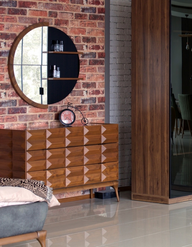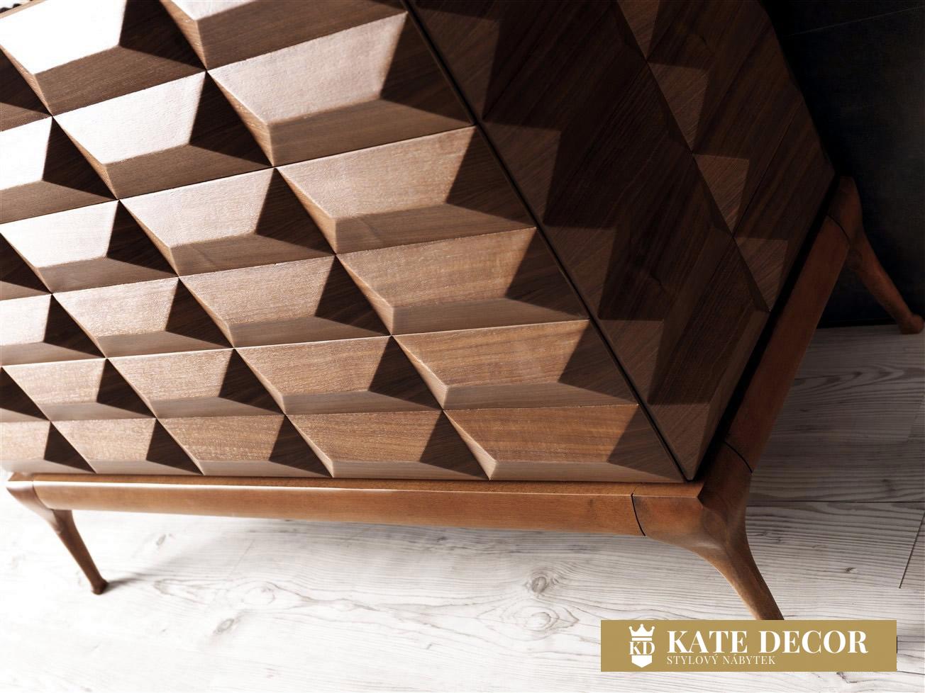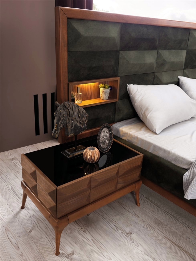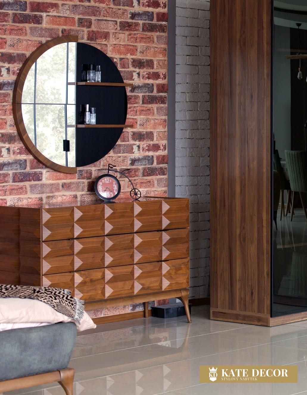 Společnost KATEDECOR s potěšením představuje svou novou speciálně navrženou ložnici DIANA. Díky svému jedinečnému designu je připraven dodat Vašemu pokoji vizi a šarm. Estetické dřevěné nohy, detailně propracovaná látka, reflexní dveře skříně a jedinečná barevná harmonie dotvářejí vzhled soupravy a činí z ní jeden z našich nejoblíbenějších produktů. Kromě stylu se ložnice vyznačuje také jedinečným komfortem a útulností, které zajišťuje použití měkkých hub a látek prvotřídní kvality na čele postele a preference barvy dřeva a látky při její výrobě. Elegance, technologie a odlehčený luxus v moderním stylu, tím vším je pro Vás ložnicová sestava DIANA OŘECH ideálním objevem. Geometrické tvary čela postele, lehkost nohou, měkká textilie na dotyk a decentní LED osvětlení v teplém spektru vytváří útulnost. Výjimečný design, čisté linie, ořechové dřevo, černé sklo nočního stolku i kovové rámy dveří šatní skříně s kouřovým sklem lákají k relaxaci přímo v prémiové třídě.