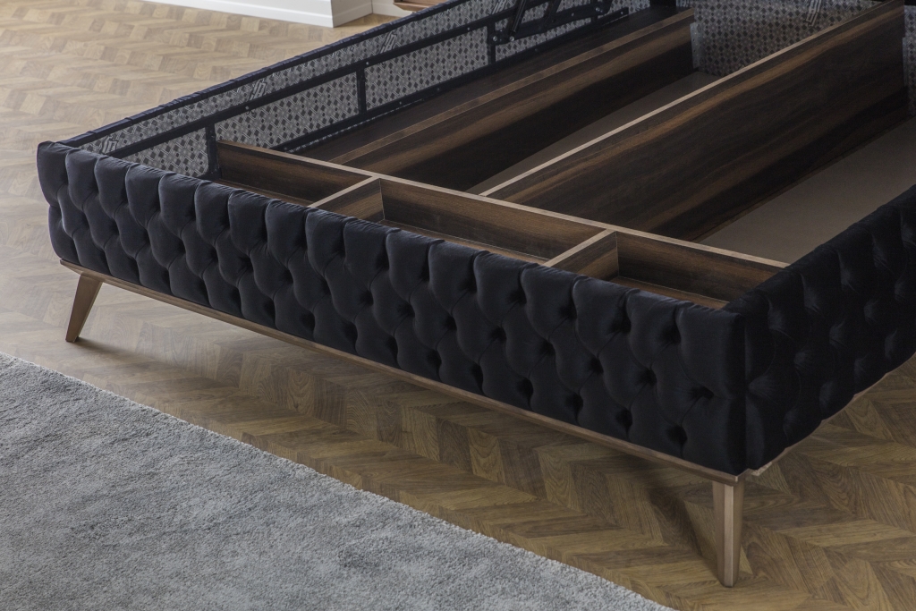 Model, který už jen svým vzhledem prozrazuje ruční práci. Detaily, nuance a všechny vlastnosti jsou důkazem této vytříbenosti. Použití laserových dekorů na zrcadlech a skříňkách, LED osvětlení na nočních stolcích a barevná harmonie zdobí soupravu a činí ji středem pozornosti. Povrchy cedrových dřevotřískových desek byly opracovány pod úhlem 45 stupňů, což svědčí o jejich třídě, odolnosti a rafinovanosti. Základní mechanismus spolu s velkou šatní skříní poskytují dostatek vnitřního úložného prostoru. Do postele byla plně implementována metoda capitoning, která výrobku dodává vizuální váhu a s kouřovými zrcadly se stává nepostradatelným modelem na spaní.