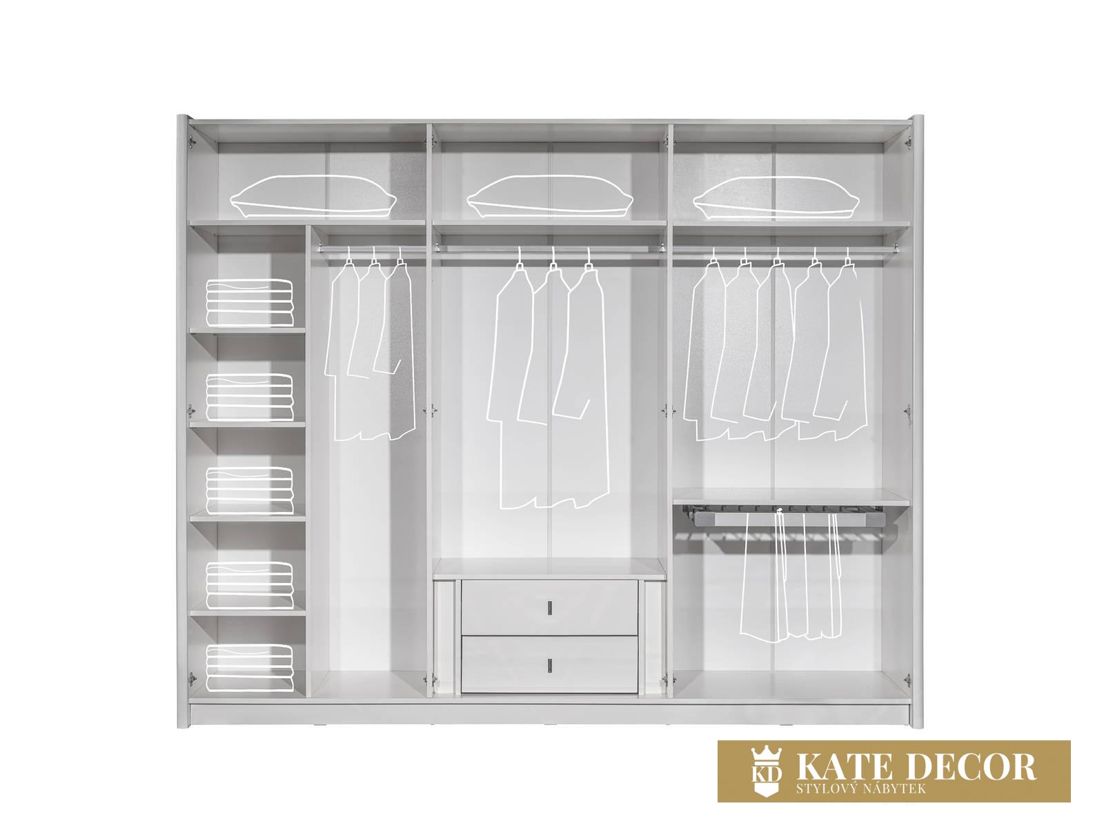 šatní skříň: šířka 260 cm, výška 214,3 cm, hloubka 63,3 cm.