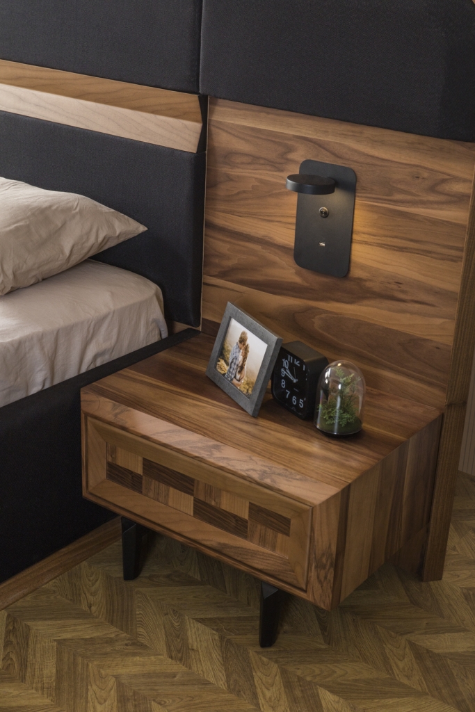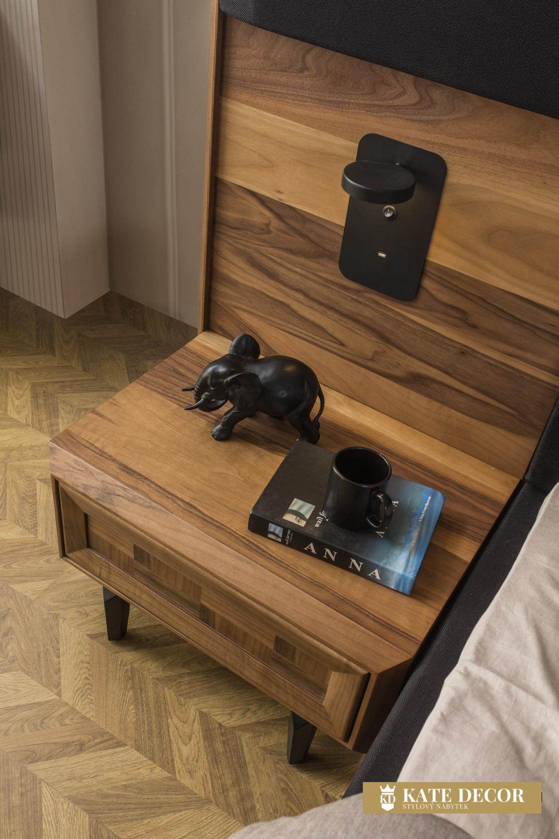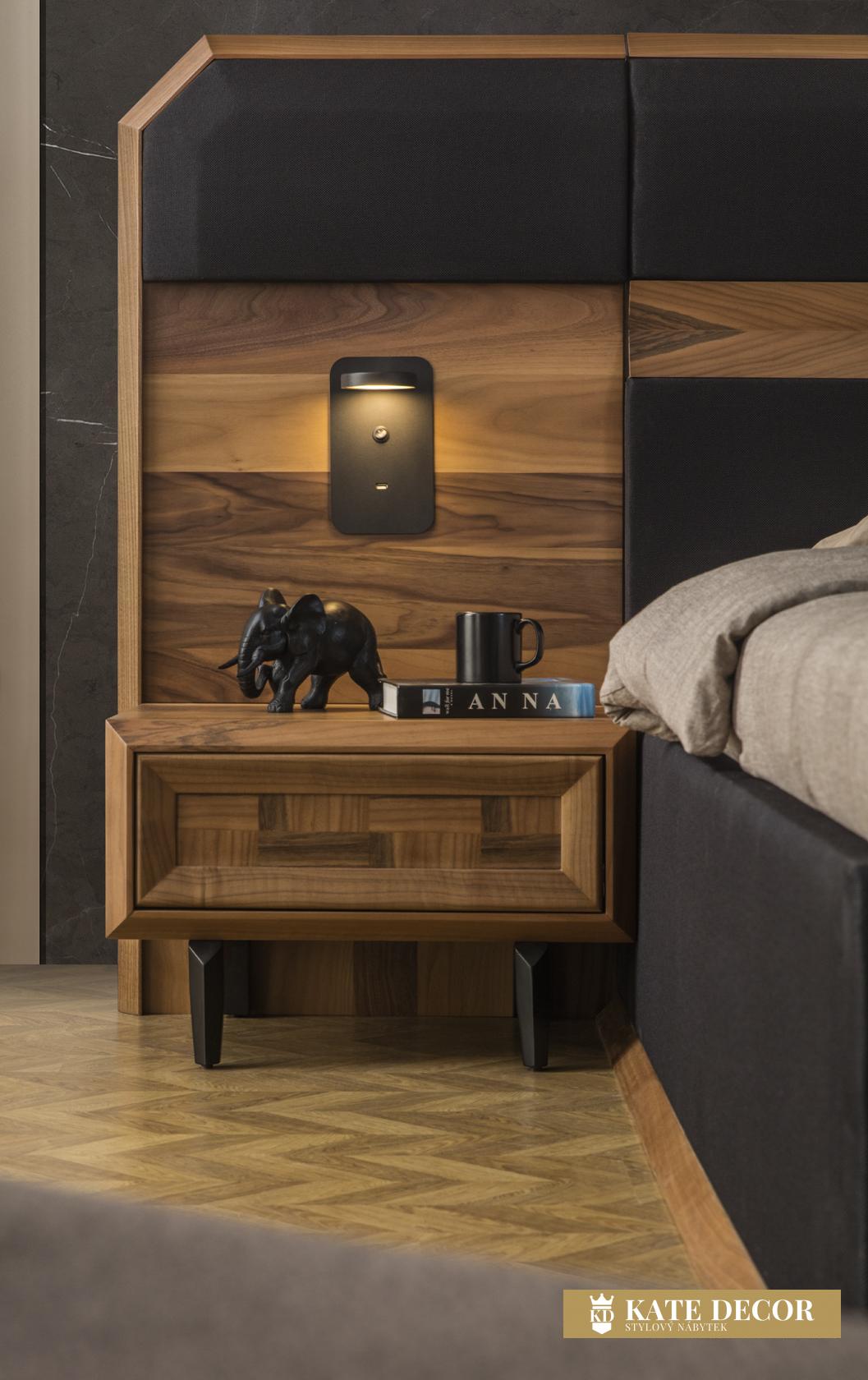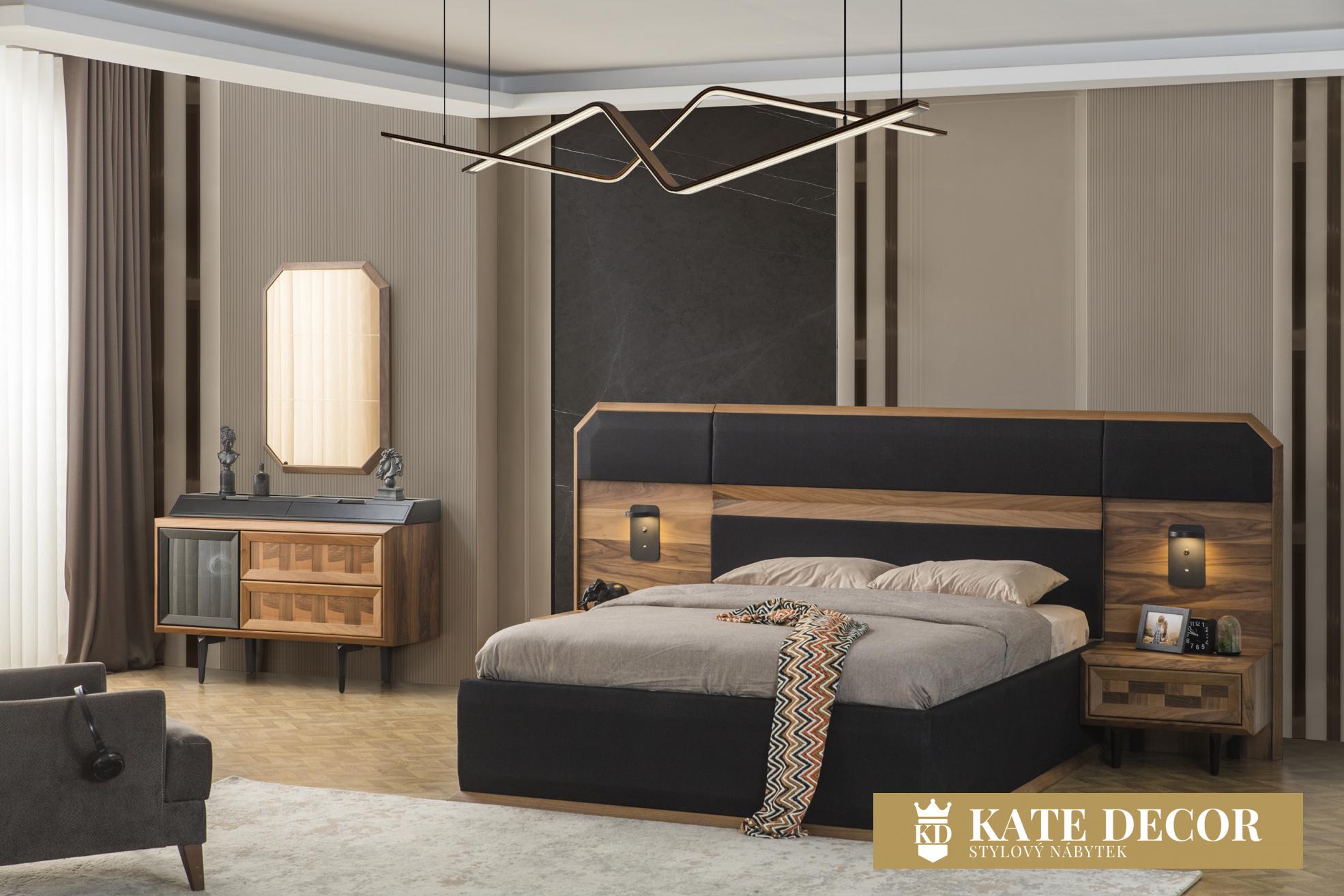 Ložnicová sestava ARYA je jednou z nejkrásnějších ukázek ruční výroby, která zůstane navždy ve Vašich vzpomínkách. Její elegantní postel a stylová šatní skříň dodají Vašemu pokoji příjemnou akustiku a stylový vzhled. Volba ložnice ARYA s ořechovým povrchem Vás zve ke spánku v přírodě a pocitu klidu a relaxace Vašeho domova. Dominantní je zde přirozený dekor letokruhů dřeva, který v kontrastu s čelním kazetovým zdobením dekoru přináší decentní estetiku.