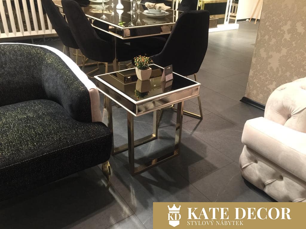 Odkládací stolek DIAMOND je připraven vnést do Vašeho domova styl a lehkost života. Odolná reliéfní zlatě kouřová deska je vyleštěná do velmi vysokého lesku a lemována klasickou elegancí černobílé barvy. Antracitově zlaté nohy působí odlehčeně vůči dominantní desce. Kvalita materiálů a spojení vytváří stylový a luxusní dojem.