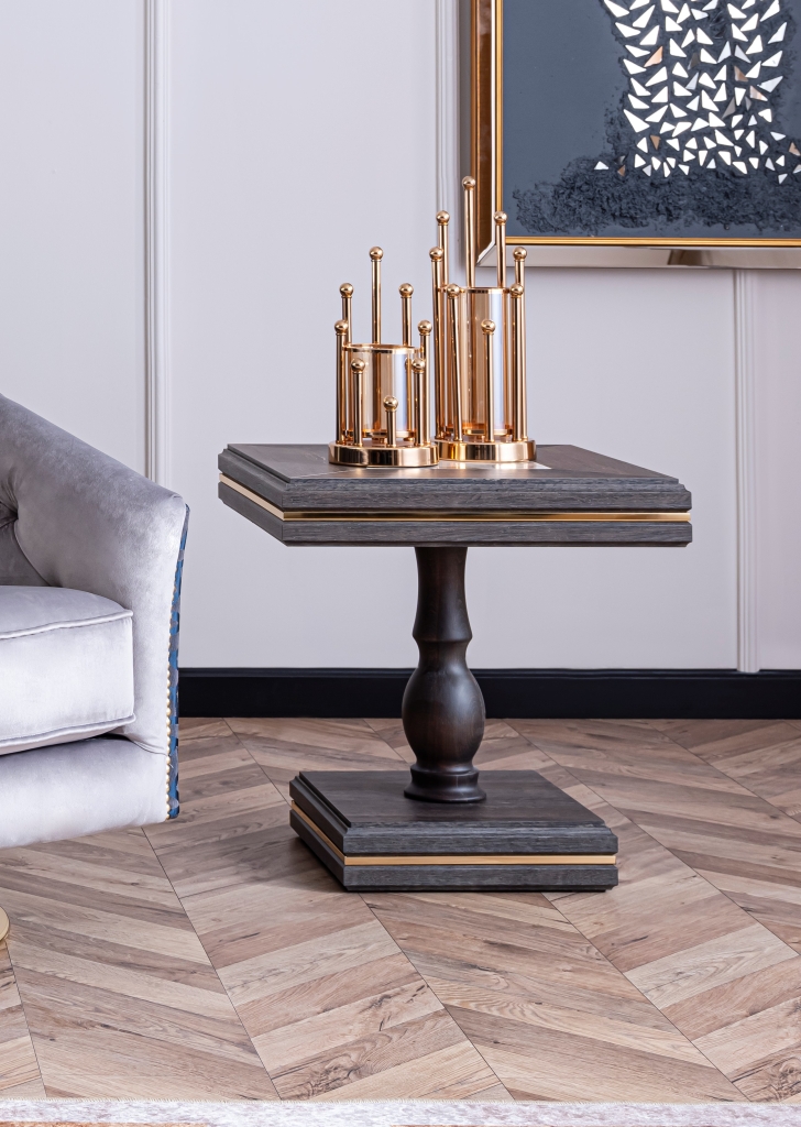 Odkládací stolek MADRID má jedinečný design kombinující klasiku s modernitou. Toto jedinečné spojení vytvoří ve Vašem pokoji harmonii detailů a staví tak stolek i každý další kus z celé kolekce do popředí. Luxusní spojení šedé barvy se zlatými aplikacemi a mramorový dekor zdůrazňuje exklusivitu a trvanlivou kvalitu materiálů. Povrch je příjemný na dotyk a odolný proti poškrábání. Stolek vyniká nejen svým stylem, ale i uklidňujícím účinkem.