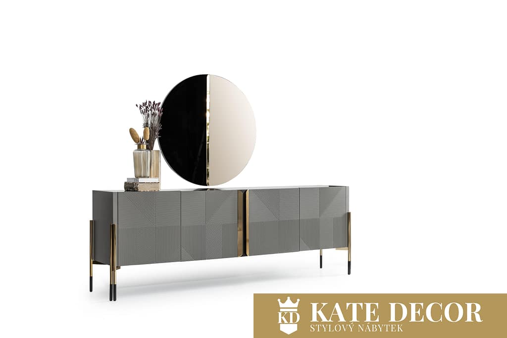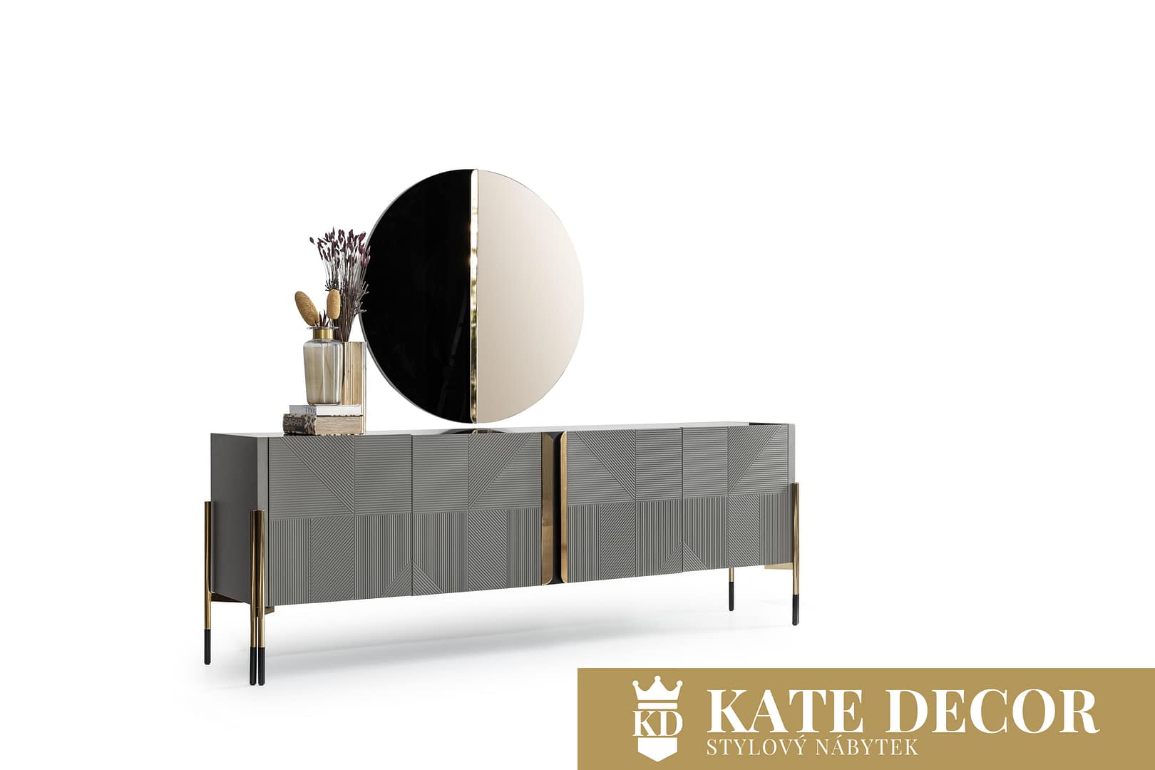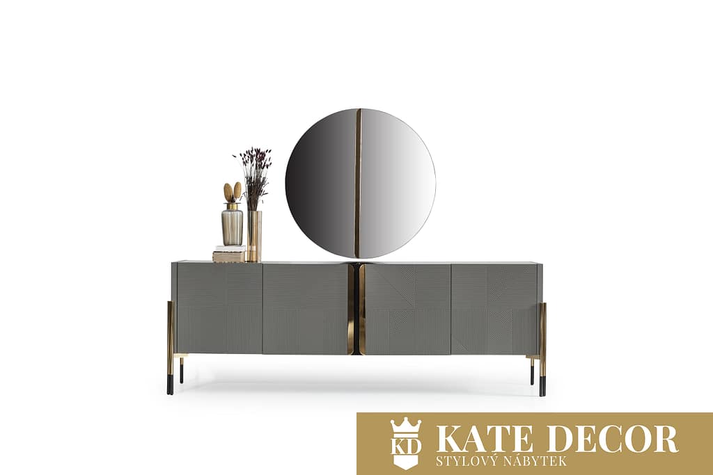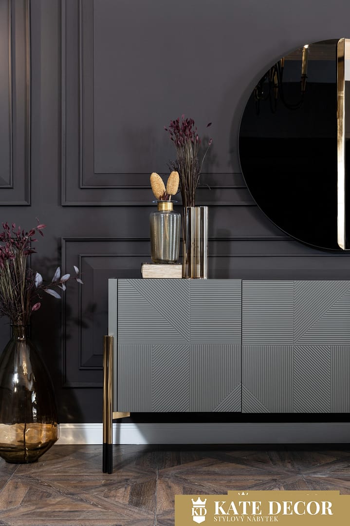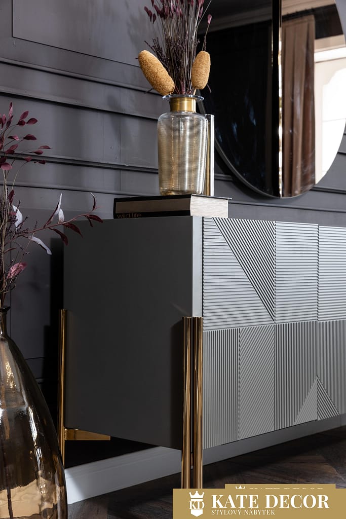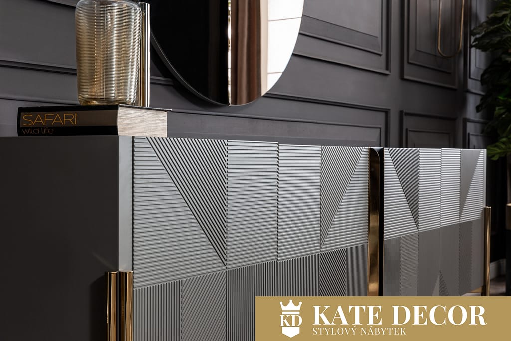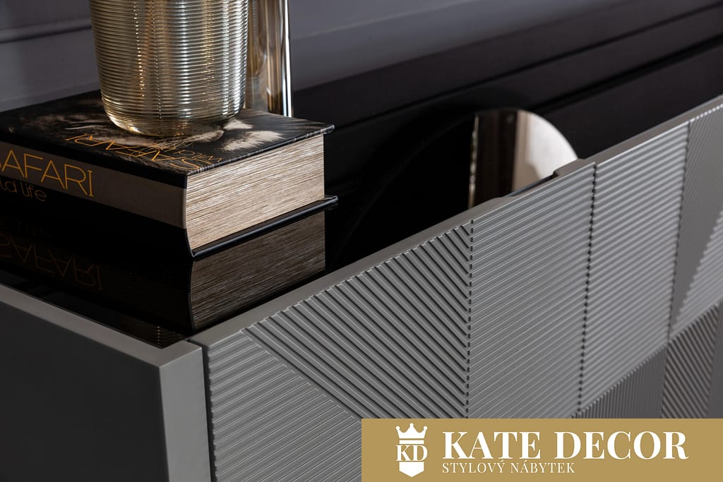 – šedé matně lakované zásuvky s povrchovou úpravou z MDF;