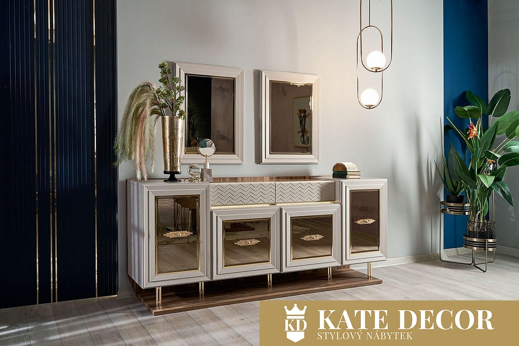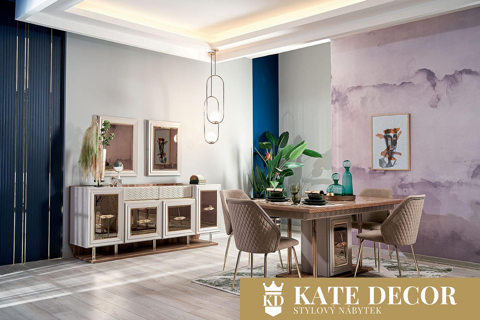 Jídelna ELSA je jedním z nejkrásnějších příkladů ručně vyráběného nábytku, který navždy zůstane ve vzpomínkách vašich hostů i Vás samotných. Je vyroben z jemně lakované dřevotřískové desky prvotřídní kvality, odolné proti poškrábání. Jeho elegantní stůl, stylové židle a konzolové zrcadlo dodají vašemu pokoji příjemný akustický a stylový vzhled. Funkčnost jídelny zvyšuje množství skříněk a dostatek úložného prostoru pro bufet. Výběr jídelny ELSA vnese do Vašeho domova půvab a šarm.