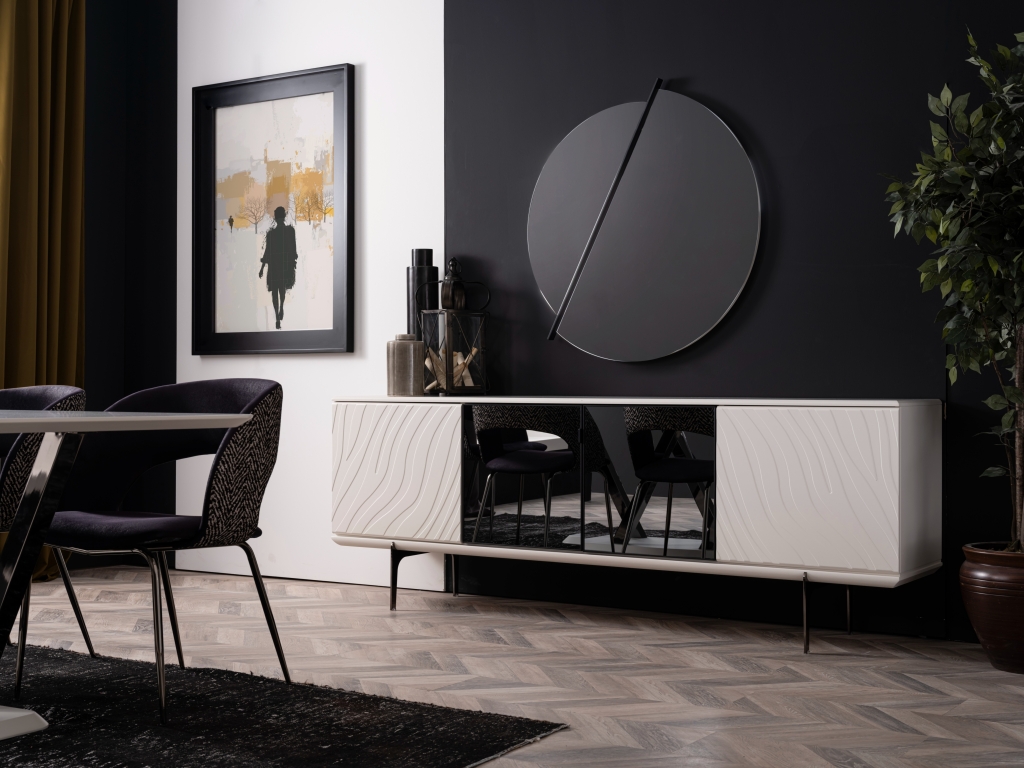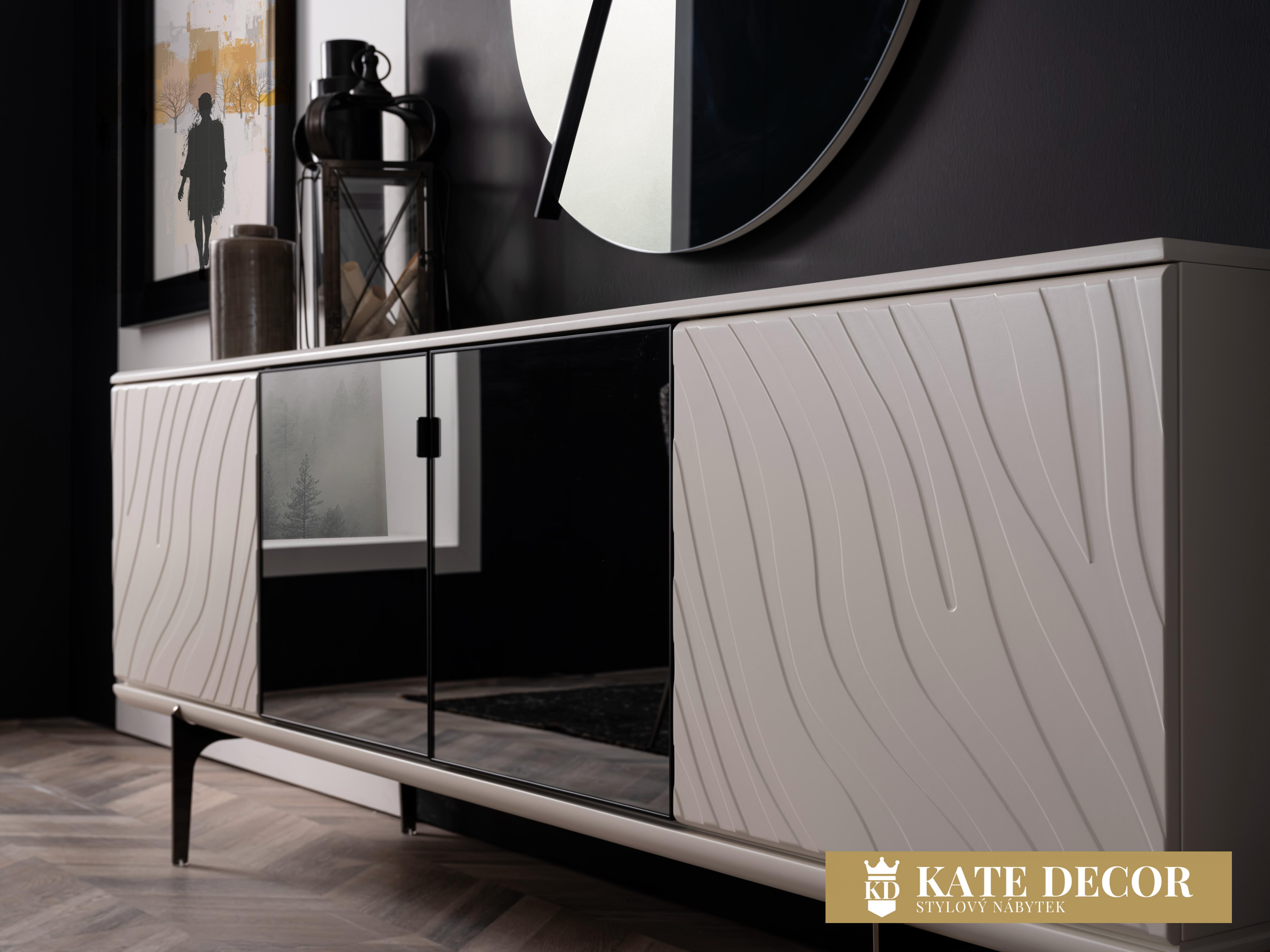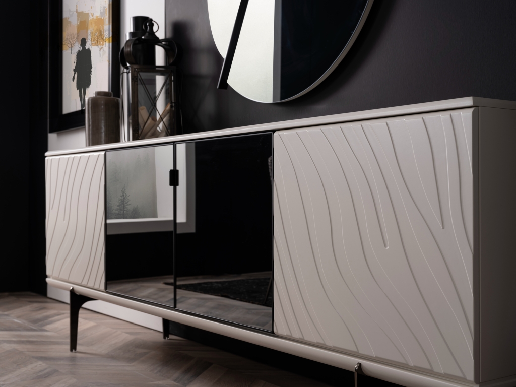 Příborník LIZBON s jedinečnou barvou a motivy je připraven stát se součástí Vašeho domova. Vysoké kovové nohy, jemné detaily a moderní zrcadlo obohatí vzhled výrobku a dodají vašemu pokoji jedinečný design. Její funkčnost zvyšuje více skříněk a dostatek úložného prostoru. Je navržen tak, aby splnil všechna Vaše očekávání.