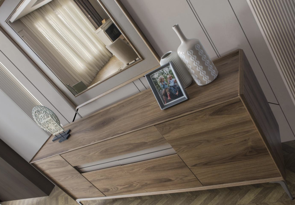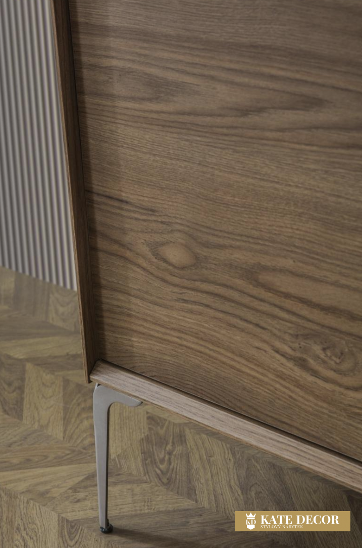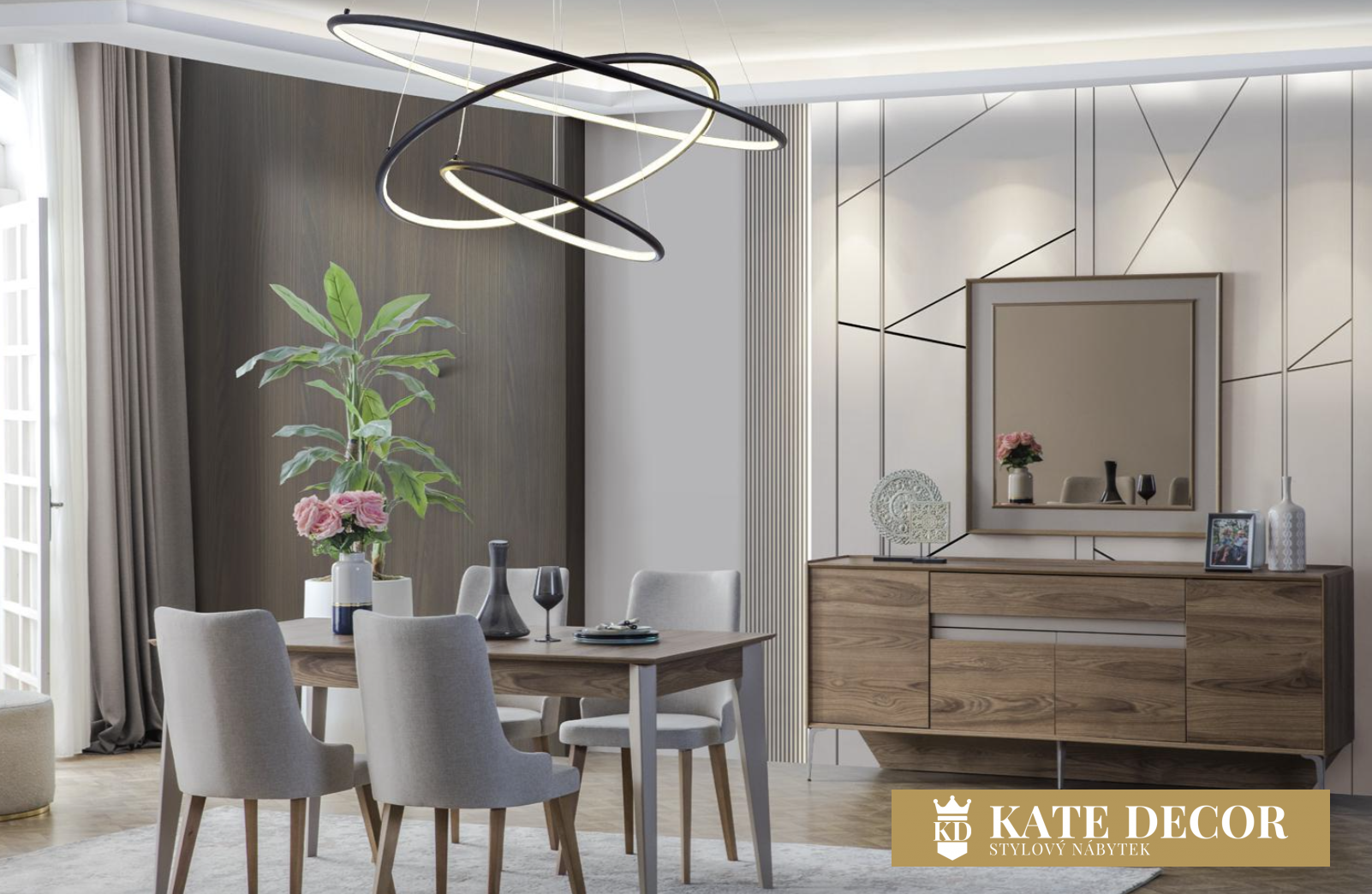 Jídelna MIRA chce být součástí Vašeho domova svým uklidňujícím účinkem. Každá funkce je navržena s velkou precizností. Příborník poskytuje dostatek vnitřního úložného prostoru a hladké zavírání zásuvek a výsuvného stolu zajišťuje snadné používání. Dřevotřísková konstrukce zajišťuje dlouhou životnost sady. Jídelní souprava byla navržena s velkou péčí, aby Vám poskytla styl, pohodlí a praktičnost. Příborník z nábytkové sady MIRA přivádí do Vaší ložnice nádherný přírodní prvek pro příznivce lehkosti života a volnosti ducha. Na dotyk hladký a příjemný povrch má klasicky nadčasový tvar. Dominantní je zde přirozený dekor letokruhů dřeva. Horní deska je zanořena do rámu, aby tak bylo zabráněno nechtěnému pádu drobných předmětů. Dvoubarevná kombinace podporuje přírodní vjem dřeva a dává tak pocit svěžestí, lehkosti a útulnosti.