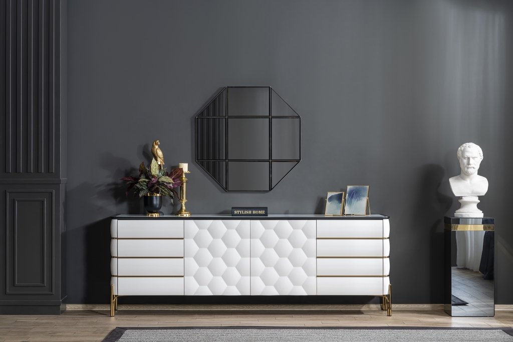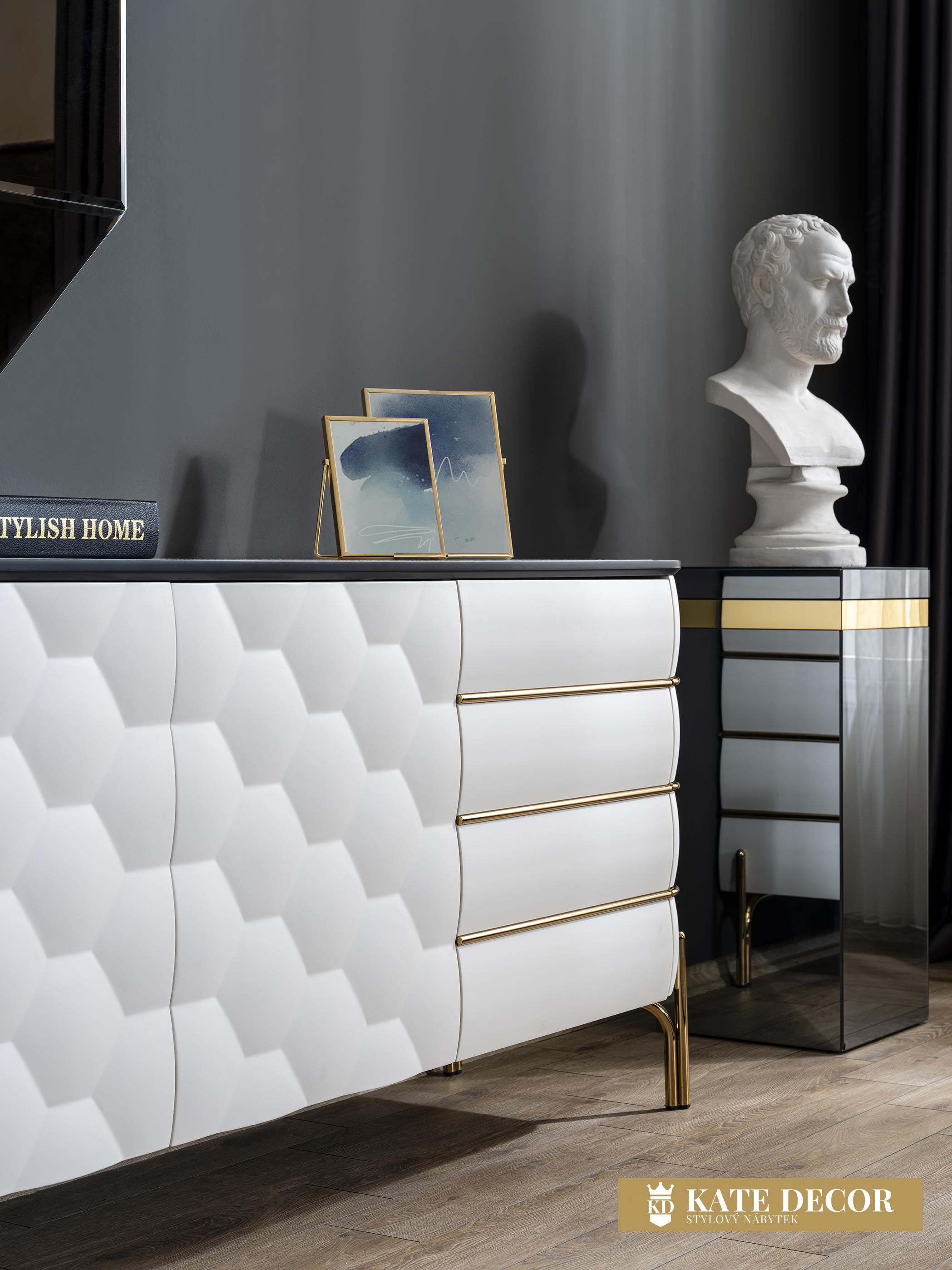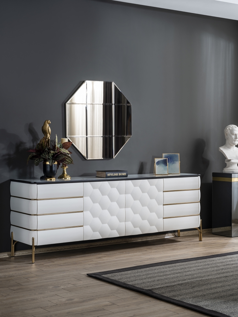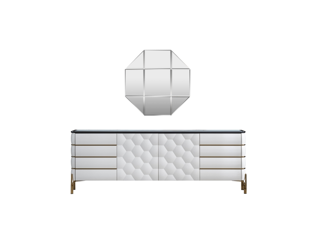 Příborník NIRVANA je připraven ztělesnit svou inspiraci z minulosti do současnosti díky originálním detailům. Styl řemeslného zpracování a preferované detaily vytvoří působivé prostředí, které zůstane ve vzpomínkách každého z Vašich hostů. Kromě stylu je připraven zaujmout své místo i nepopsatelným komfortem a útulností. Příborník je podpírán s překvapující lehkostí zlatých kovových nohou v zajímavé stylizaci. Příjemně hladký povrch, zaoblené hrany, zlaté aplikace, kombinace bělostné barvy a zlata, motiv přírodního vzoru medové plástve, pečlivé zpracování, design i kombinace barev luxusu to vše tvoří vizuální harmonii, která oslní svým půvabem a elegancí.