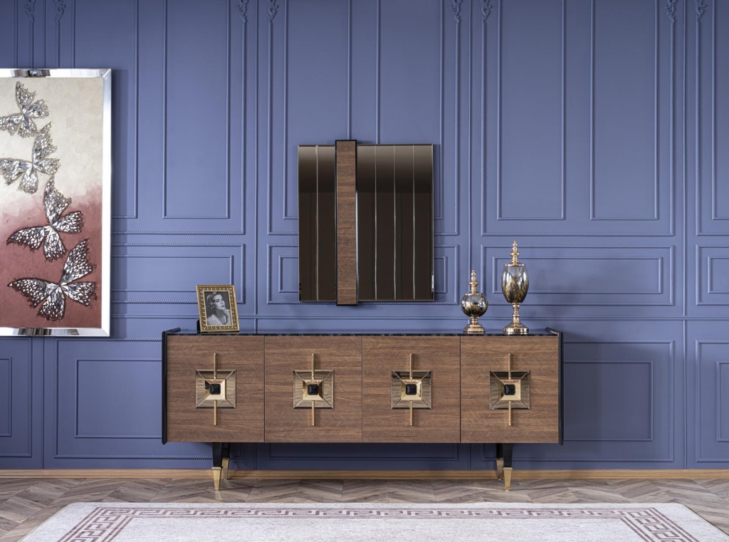 Od speciálně navrženého pařížského příborníku nebudete moci spustit oči. Úžasný design je připraven zaujmout své místo u Vás doma a vytvořit relaxační atmosféru. Zatímco zlaté tóny, mramorové dekorace, antracitové aplikace zrcadel oslňují oči, použitá barva dřeva umocňuje uklidňující účinek a umožňuje užívat si pohodlí. Úžasný pařížský design je připraven u Vás doma vytvořit noblesní i relaxační atmosféru elegantního luxusu nádherného města nad řekou Seinou. Každý jednotlivý kus sestavy PARIS byl navržen individuálně a sám o sobě může být ve Vašem pokoji okouzlujícím solitérem. Úchytky i detail nohou nábytku byl vyhotoven v neobvyklém stylu a tvaru připomínající věže francouzských chrámů. Luxusní kombinace černé a zlaté umocněné množstvím zrcadel i zrcadlových aplikací ve spojení s motivem dekoru vzácného dřeva a horní desky černého mramoru ve vysokém lesku odrážející předměty na ní položené vnáší do Vašeho interiéru okouzlení vznešených paláců v období císařství.