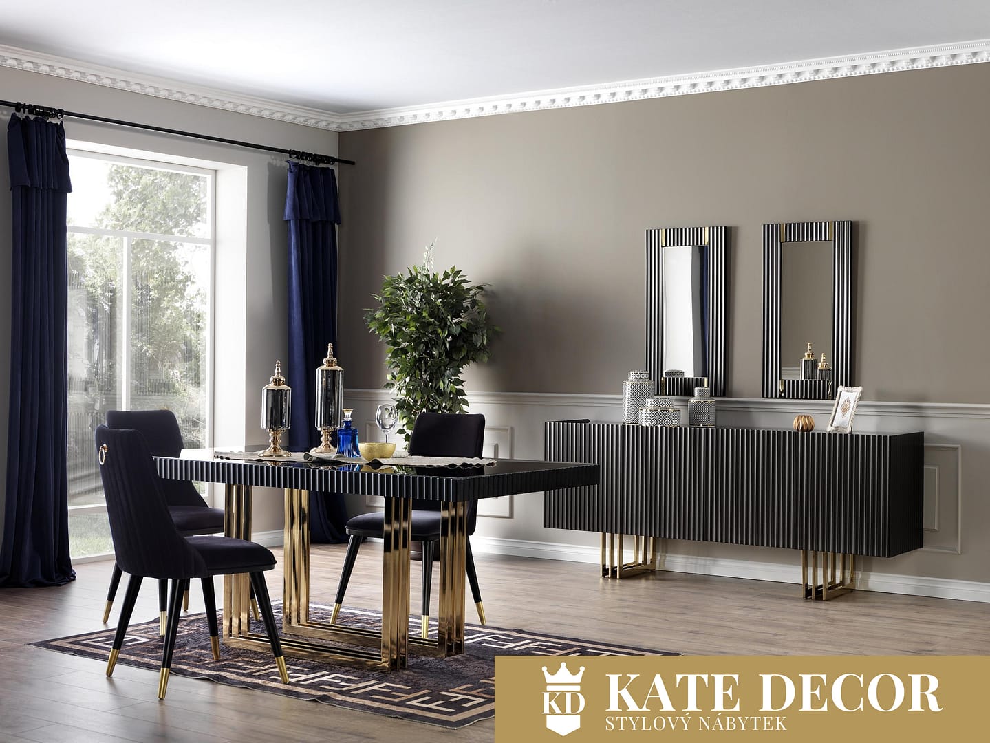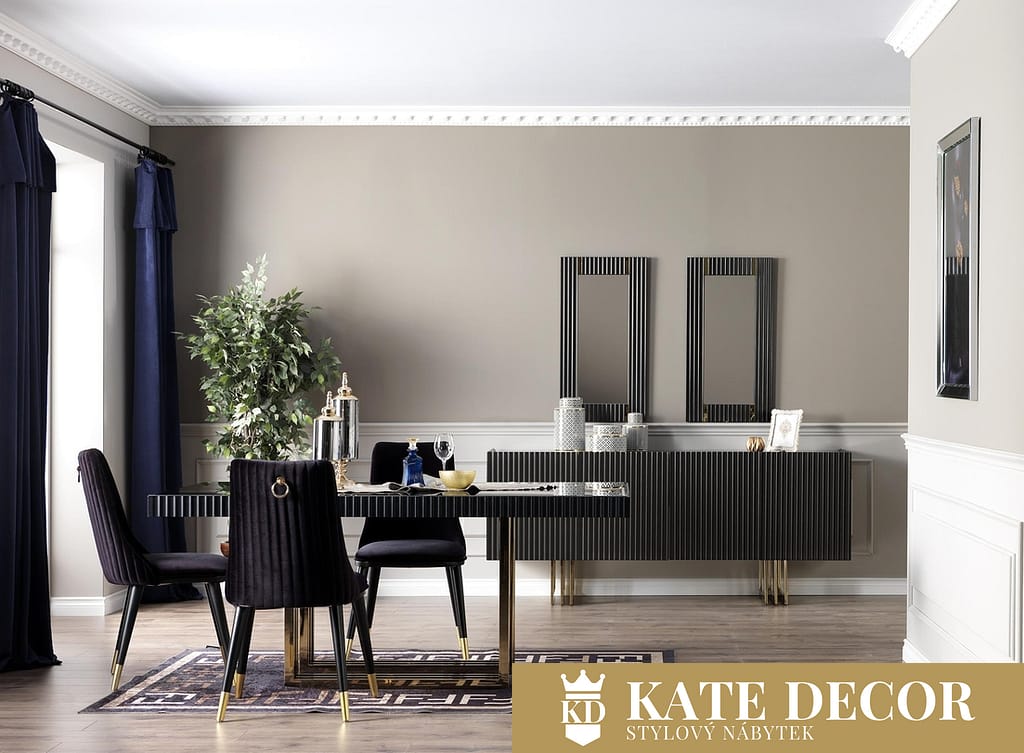 Jídelna SENFONI je připravena vnést do Vašeho domova styl a vytvořit nádhernou atmosféru. Svými detaily, jemnými prvky a půvabem okouzlí všechny Vaše hosty. Kromě vizuální exkluzivity se jídelna vyznačuje vysokou mírou pohodlí a odolnosti. Sada je působivá svým designem a je vyrobena z vysoce kvalitních materiálů a technik. Díky jedinečné barevné harmonii a pozlaceným kovovým nohám zazáří jídelní set SENFONI jako hvězda a dodá Vašemu pokoji estetický vzhled.