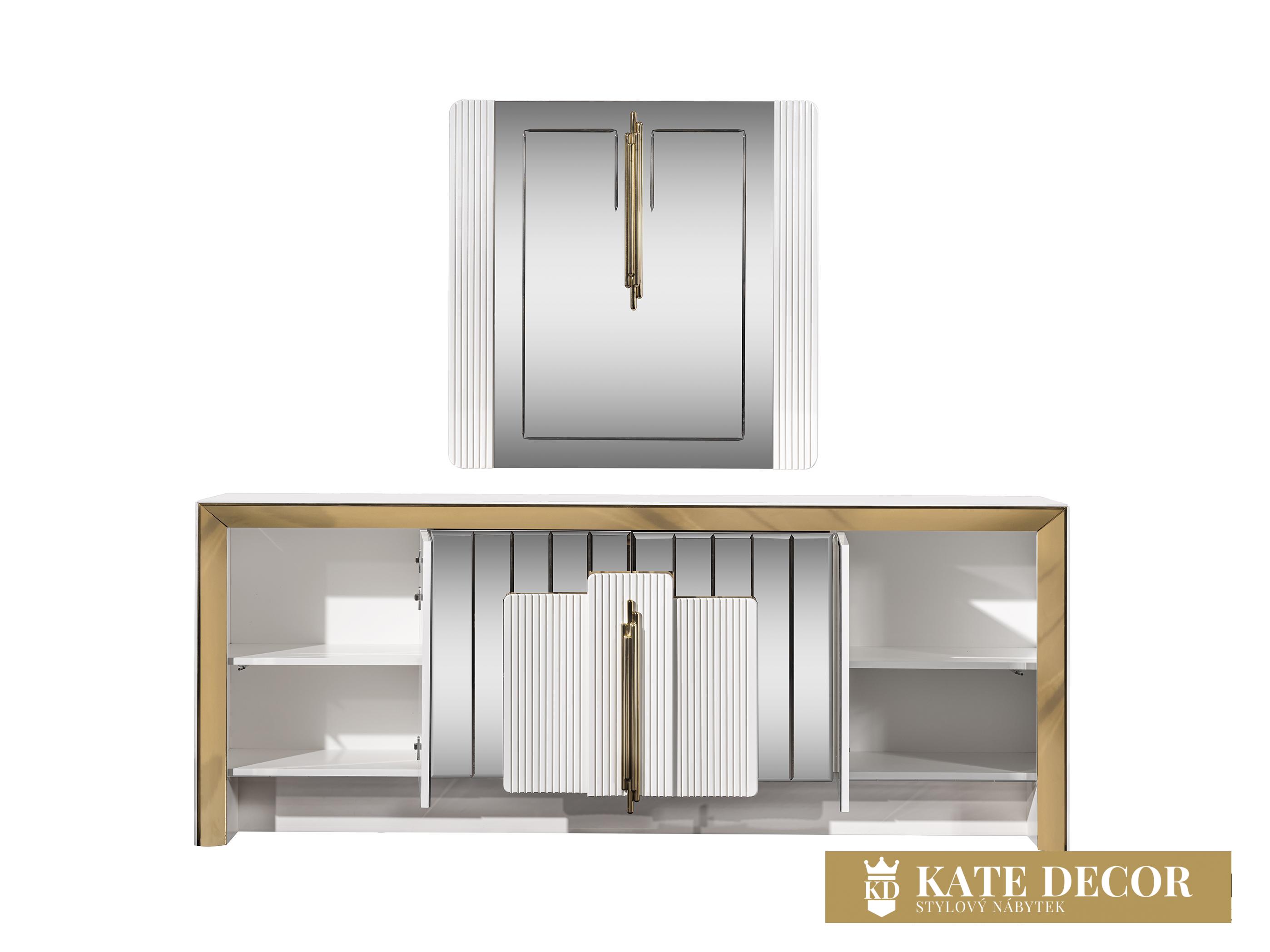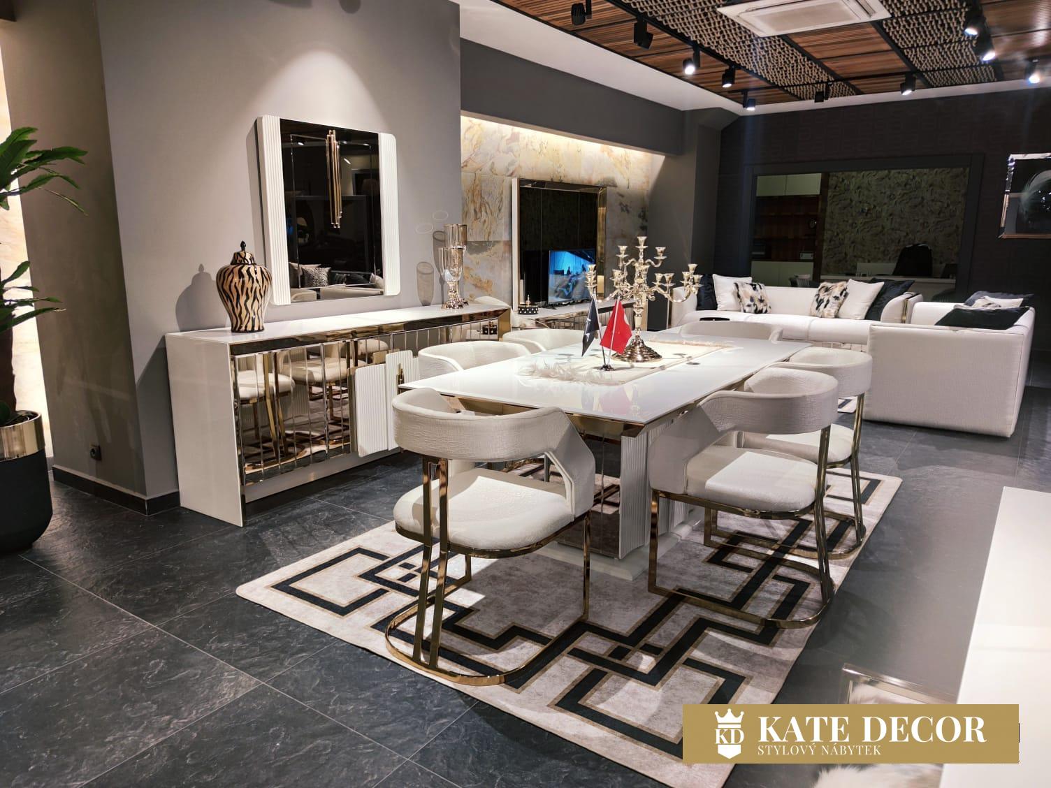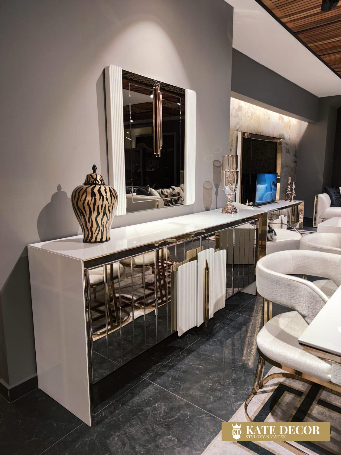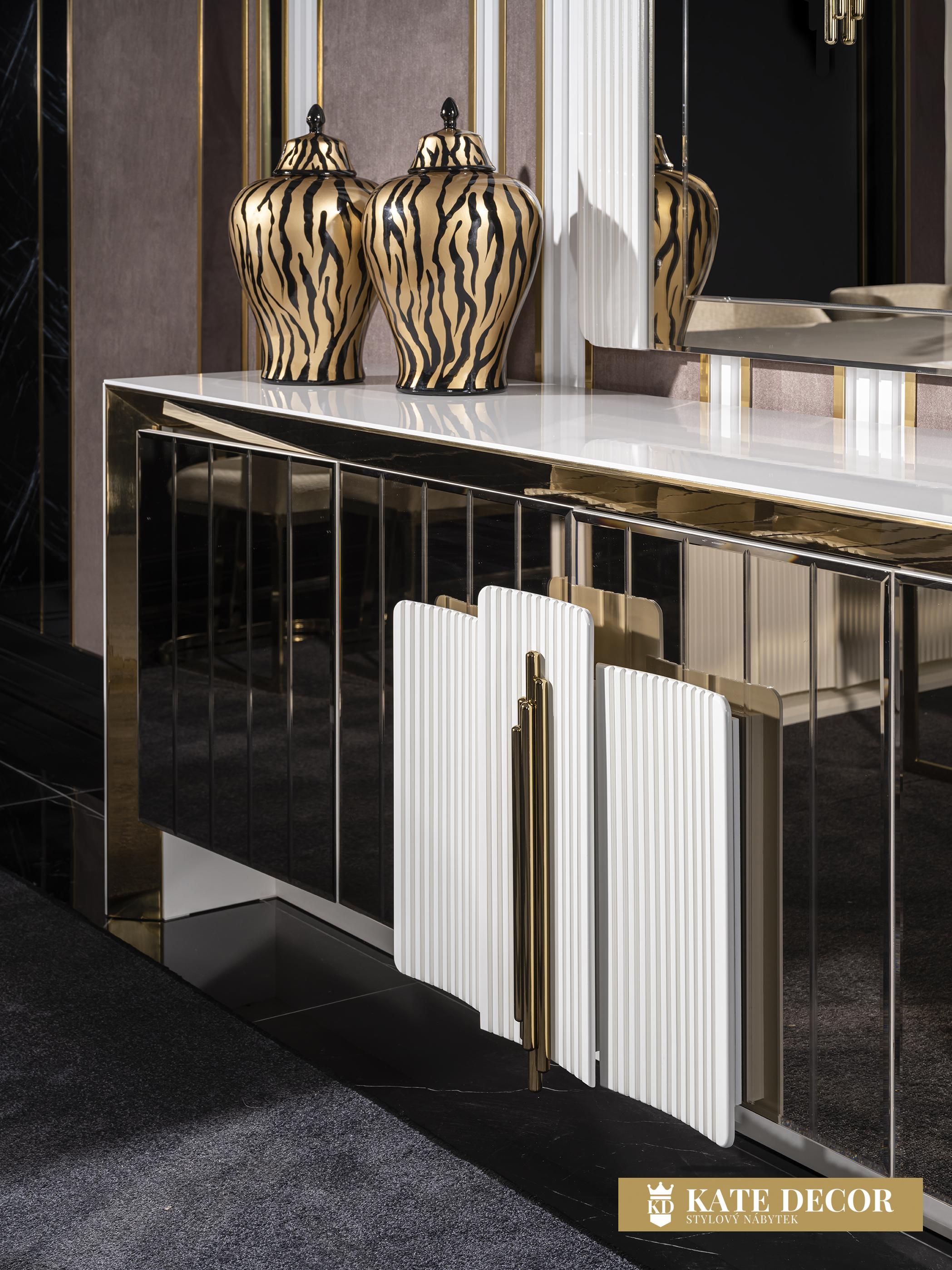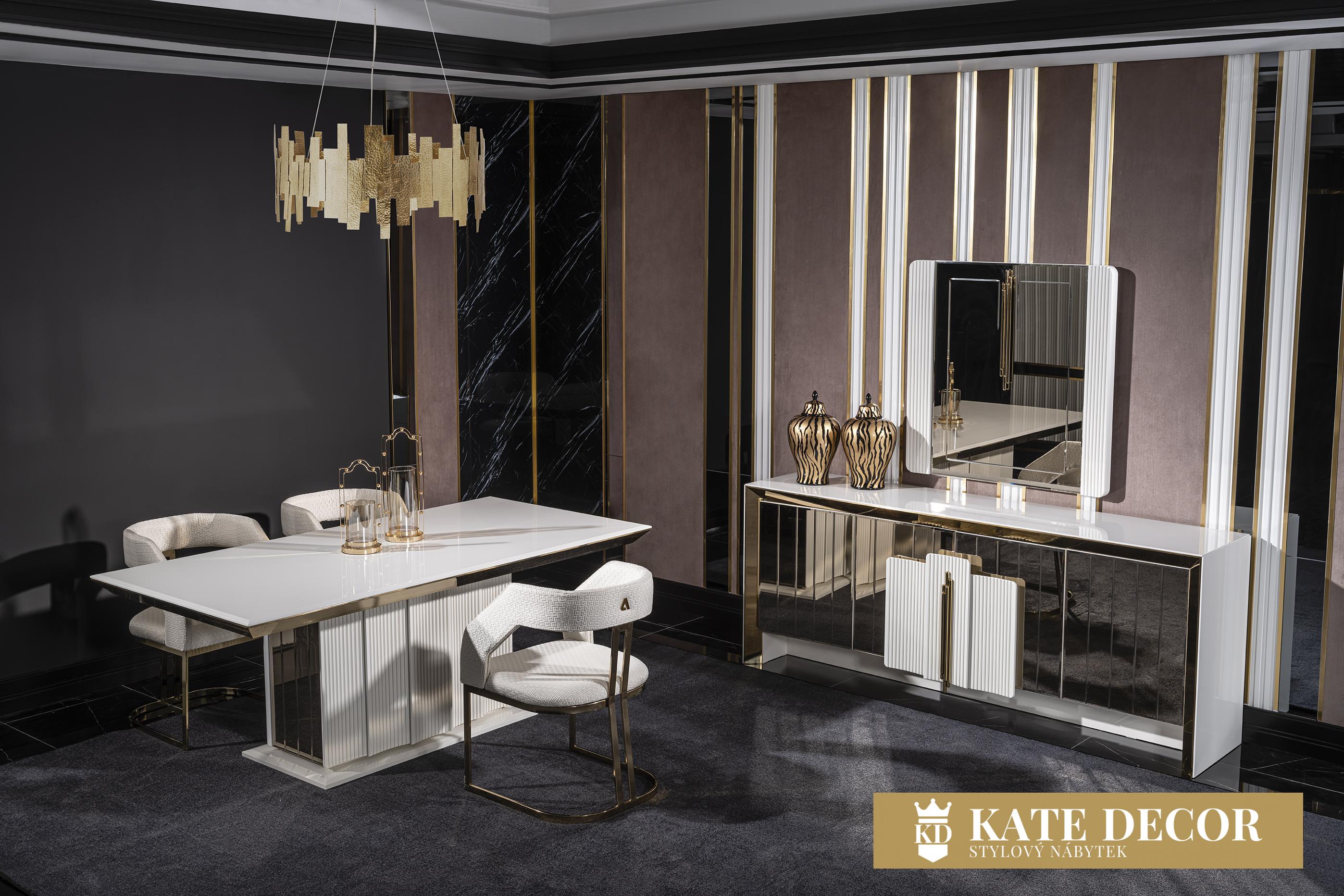 Jídelna VEGAS svou přirozeností dodá Vašemu pokoji jedinečný vzhled a umožní Vám dosáhnout vysněného pohodlí a útulnosti. Při výrobě sady jsou použity materiály a mechanismy MDF prvotřídní kvality, které zaručují dlouhodobé používání výrobku bez deformací. SNábytková sestava VEGAS je vstupem do velkého světa. Atypicky řešené zrcadlo příborníkus vertikálními zdobnými prvky umocňuje zlaté osvětlení. Bílá deska stolku uvedená do vysokého lesku harmonizuje se zlatým výrazným dekorem i přítomnost precizně fasetovaných zrcadlových tabulek tvořících čelo tvoří nádhernou kompozici a pozvedá jej v luxus. Zlacení, antracitové aplikace, netradiční úchytky, zdobená i fasetová zrcadla i pravidelné linie v kombinaci barev evokuje lehkost a úspěšnost Vašich dní s příslibem osobního komfortu. Celý komplet tak odráží a zvětšuje prostor v místnosti, dává mu dynamiku i noblesu v té nejvyšší třídě.ouprava dodá Vašemu pokoji eleganci díky výrazné barevné kombinaci, specifickým nožkám a designovým dekorům a také Vám usnadní život díky funkčním detailům.