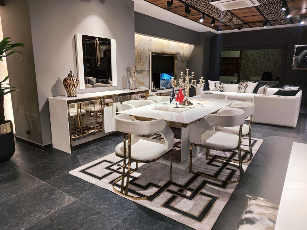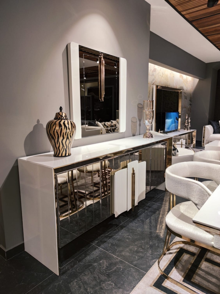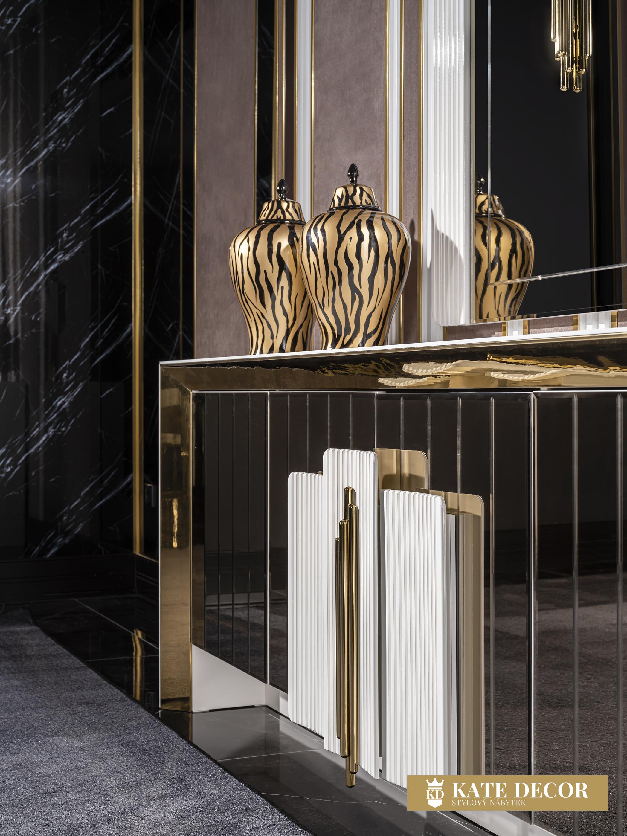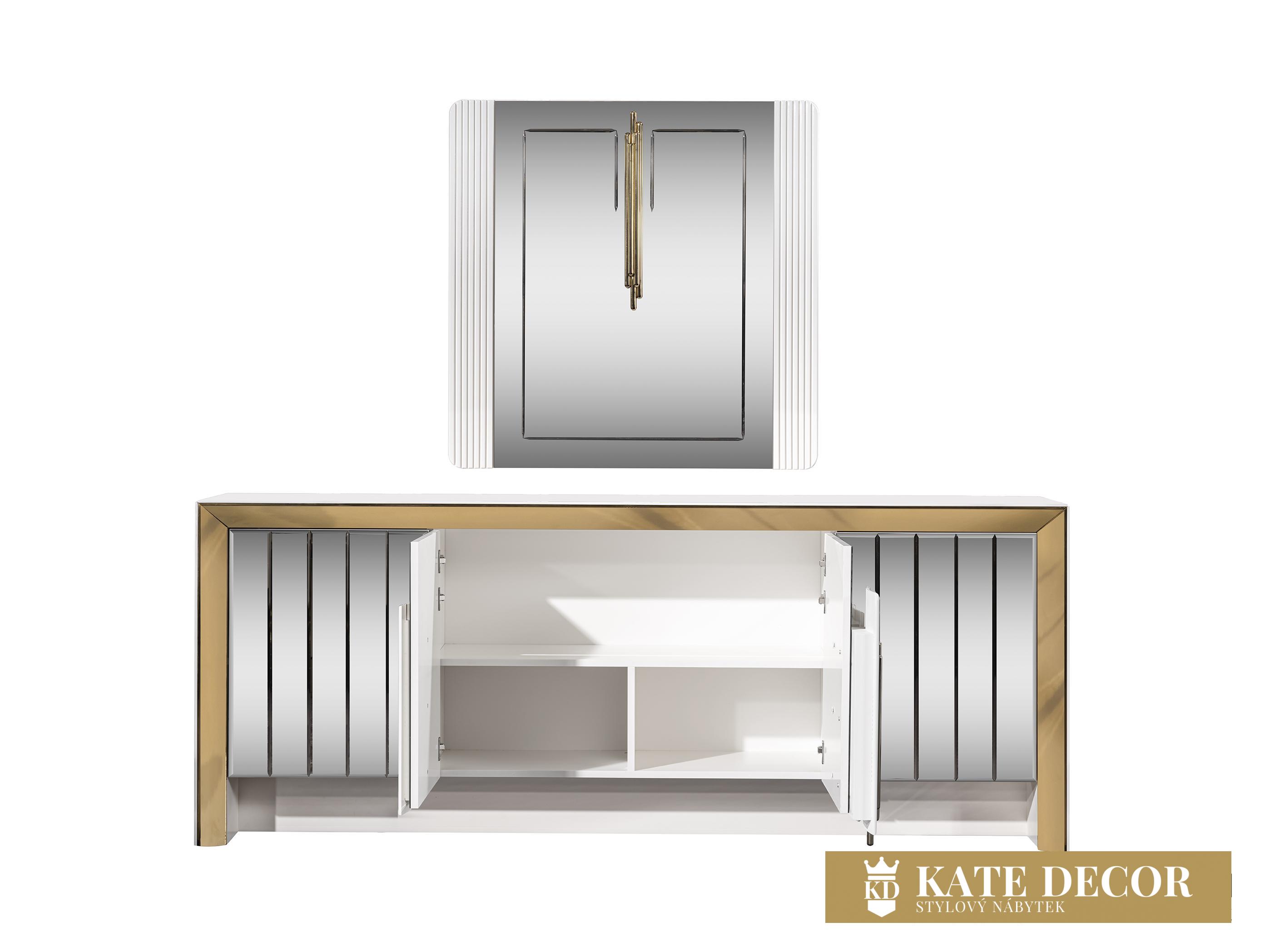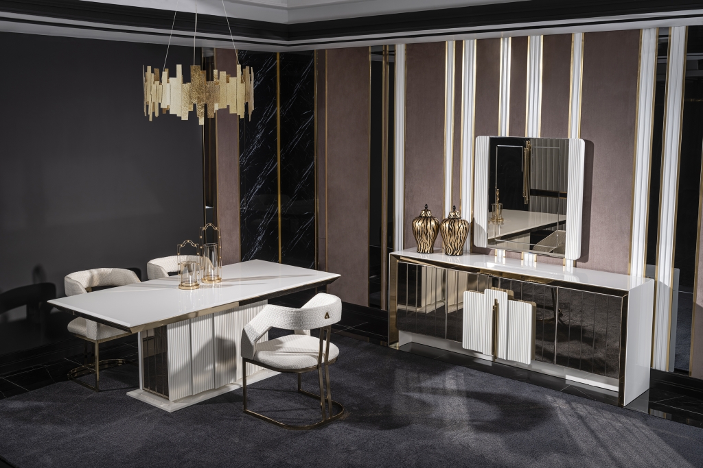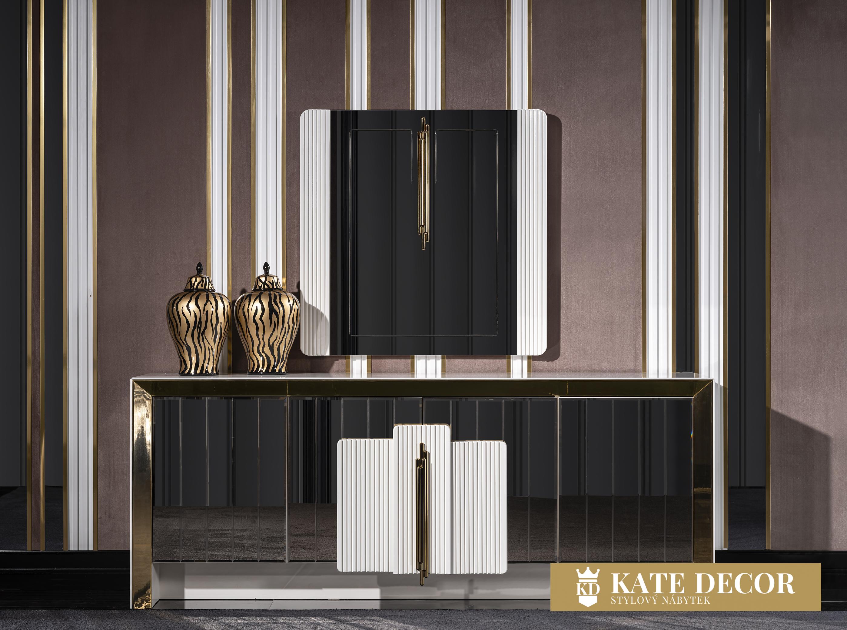 Jídelna VEGAS svou přirozeností dodá Vašemu pokoji jedinečný vzhled a umožní Vám dosáhnout vysněného pohodlí a útulnosti. Při výrobě sady jsou použity materiály a mechanismy MDF prvotřídní kvality, které zaručují dlouhodobé používání výrobku bez deformací. SNábytková sestava VEGAS je vstupem do velkého světa. Atypicky řešené zrcadlo příborníkus vertikálními zdobnými prvky umocňuje zlaté osvětlení. Bílá deska stolku uvedená do vysokého lesku harmonizuje se zlatým výrazným dekorem i přítomnost precizně fasetovaných zrcadlových tabulek tvořících čelo tvoří nádhernou kompozici a pozvedá jej v luxus. Zlacení, antracitové aplikace, netradiční úchytky, zdobená i fasetová zrcadla i pravidelné linie v kombinaci barev evokuje lehkost a úspěšnost Vašich dní s příslibem osobního komfortu. Celý komplet tak odráží a zvětšuje prostor v místnosti, dává mu dynamiku i noblesu v té nejvyšší třídě.ouprava dodá Vašemu pokoji eleganci díky výrazné barevné kombinaci, specifickým nožkám a designovým dekorům a také Vám usnadní život díky funkčním detailům.