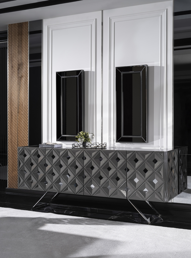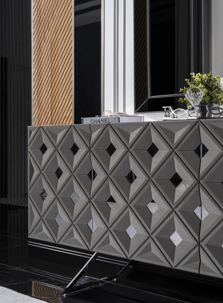 Příborník VIONA se vyznačuje výrazným designem a je připraven stát se nepostradatelnou součástí Vaší domácnosti. Úžasná harmonie ecru a černé barvy vytváří okouzlující atmosféru a umocňuje jejich uklidňující účinek. Kromě útulné atmosféry získá Váš pokoj spolu se zrcadlovými aplikacemi, antracitovými detaily a jedinečným designem stylový a estetický vzhled. Sada je vyrobena z materiálů MDF a zaručuje dlouhodobé používání bez deformací.
