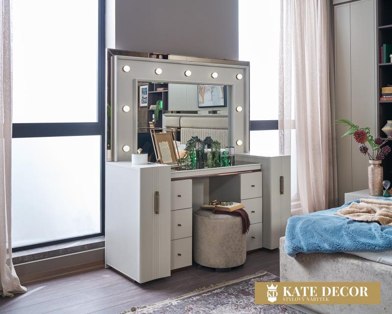Ložnicová sestava CREA je jedním z nejkrásnějších příkladů, který podtrhuje dokonalou harmonii bílé a béžové barvy. Její design září jako hvězda a stává se nejoblíbenější sadou s vysoce uklidňujícím účinkem. Na čalounění je použita měkká tkanina s texturou, která ještě zvyšuje pohodlí. Design čela postele, nočních stolků, moderní komody a bronzových kovových detailů vizuálně doplňuje výrobek a podtrhuje jeho jedinečný styl a půvab.