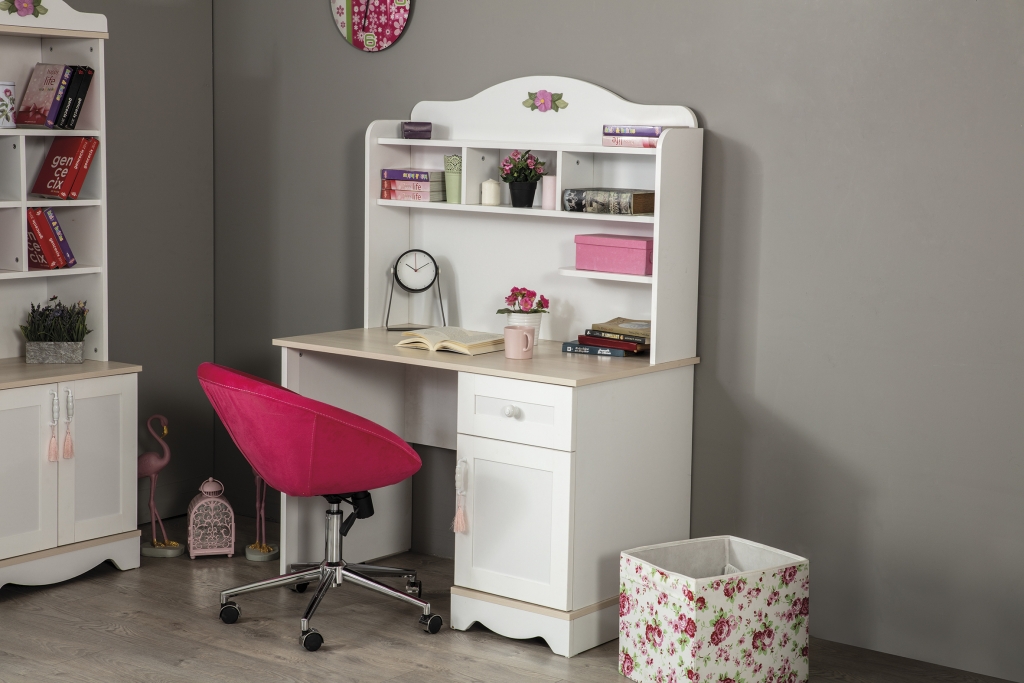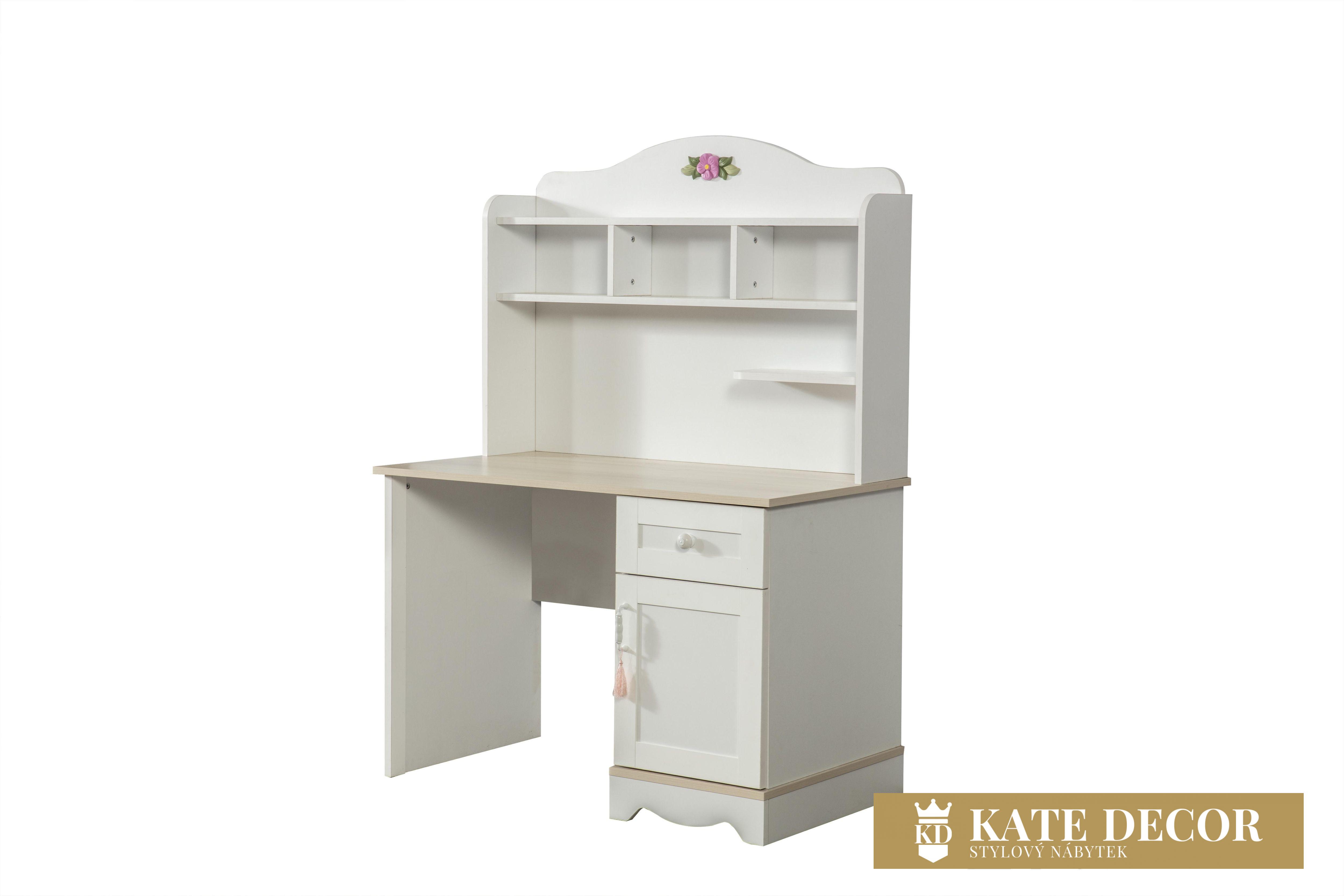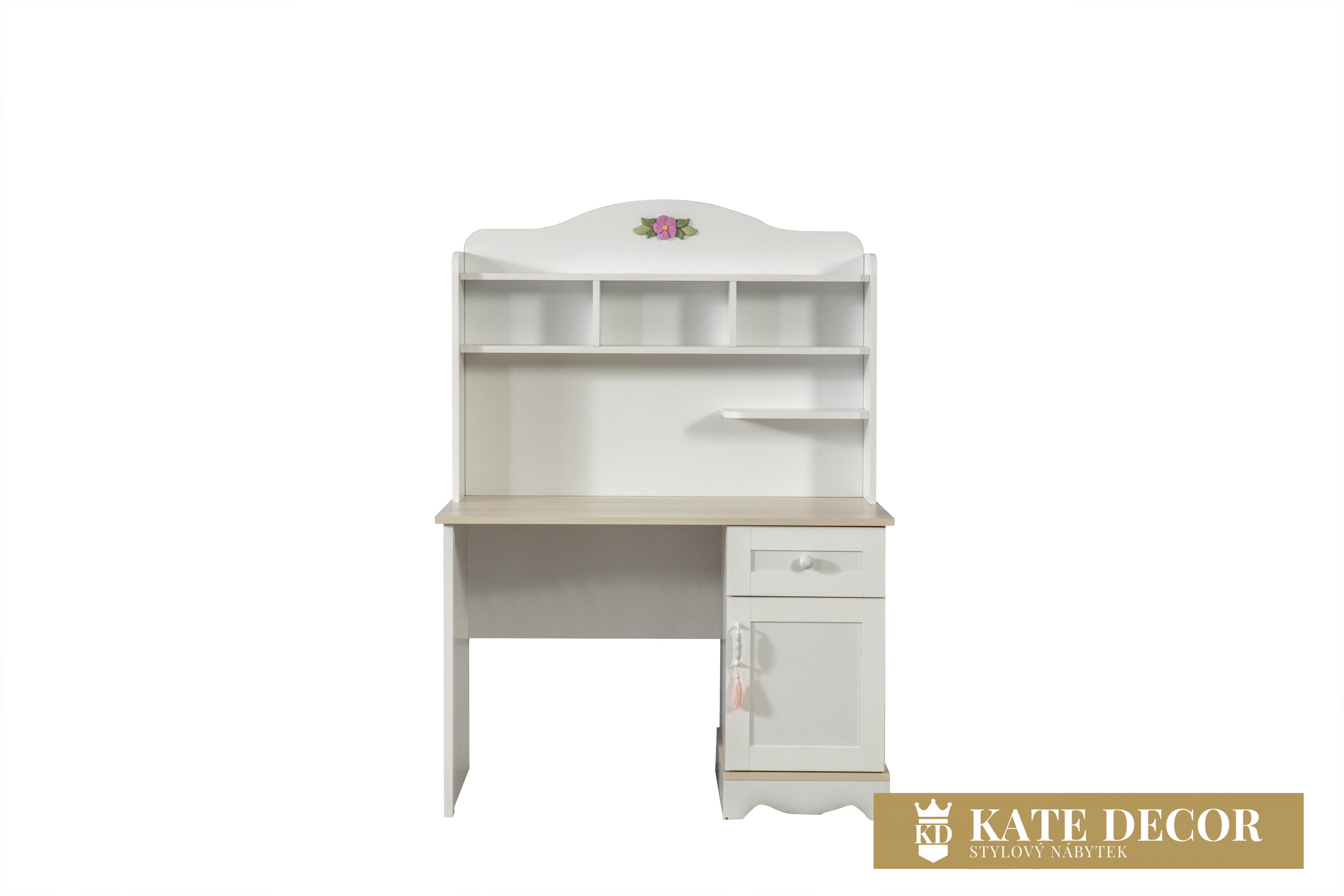 Se sestavou dětského pokoje LINA navrhněte pokoj, ve kterém pocítíte maximální míru pohodlí a klidu. Děti si zaslouží vyrůstat s kvalitním nábytkem, učit se u funkčního psacího stolu a opírat se při čtení knihy o měkké čelo postele. My v KATEDECOR se snažíme toto vše poskytnout pouze jednou sadou. Psací stůl LINA je navržen v romantizujícím stylu pro Vaše malé princezny i dospívající slečny. Příjemná kombinace bílé barvy a přírodního odstínu i dekoru dřeva pracovní desky navozuje harmonii a vzdušnost v celém pokoji. Četnost úložného prostoru umožňuje zpřístupnit objem pomůcek Vašeho školáka a podnítí v něm smysl po organizaci práce a vyváženost mezi pracovními knihami i dekorativními hračkami.