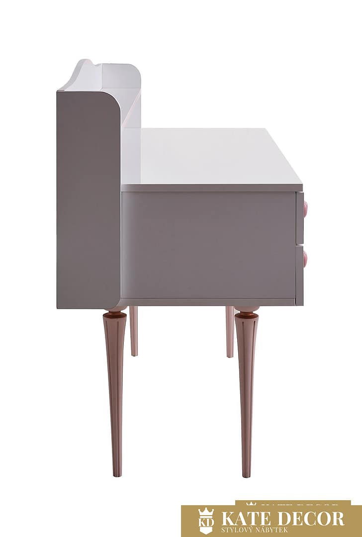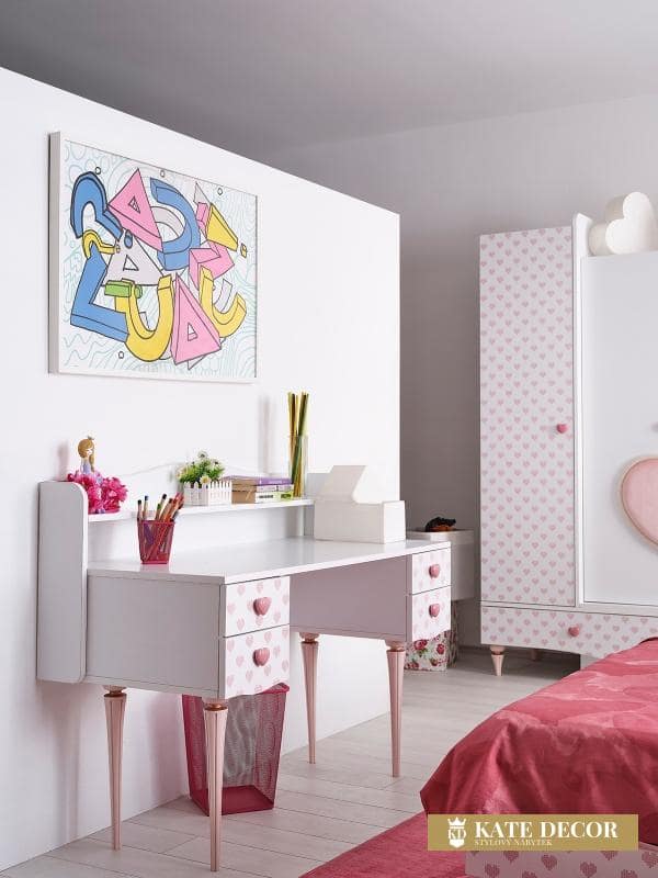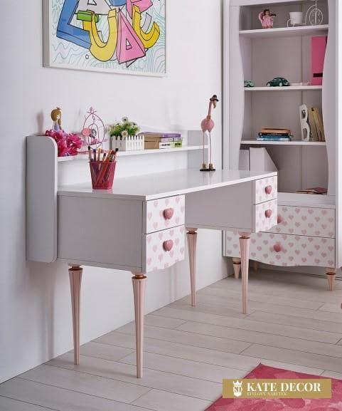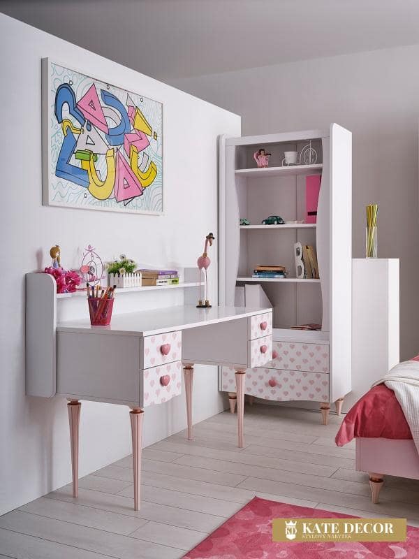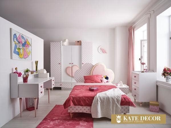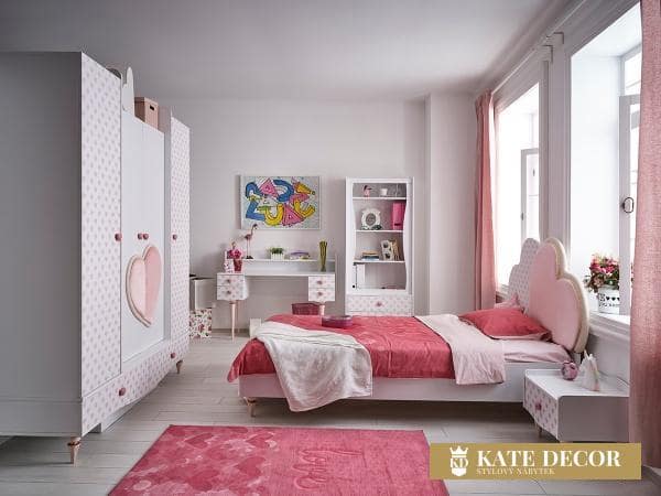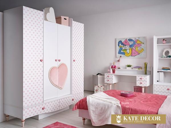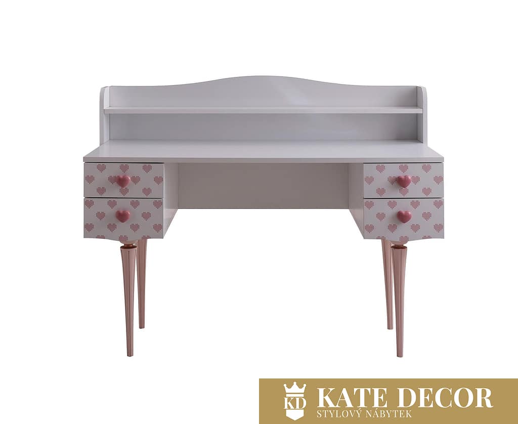 Nábytková sada LOVE vytváří romantickou atmosféru pomocí dekorativních detailů ve tvaru srdíček i designovými zlatorůžovými nohami a je tou správnou volbou pro dívky a malé slečny hledající přirozené, klidné a relaxační prostředí ve svém pokoji. Každým detailem a dekorem tak přináší estetiku do svého pokoje. Díky nádherné růžové barvě působí energicky a podporuje kreativitu. Hladký povrch stolku je bezpečný a příjemný na dotyk. Zvednuté okraje horní desky stolu zabraňují nechtěnému zapadnutí předmětů do hůře dostupných míst. Do psacího stolu ze sady LOVE si tak může každá princezna uschovat všechna svá snění a tajemství.
