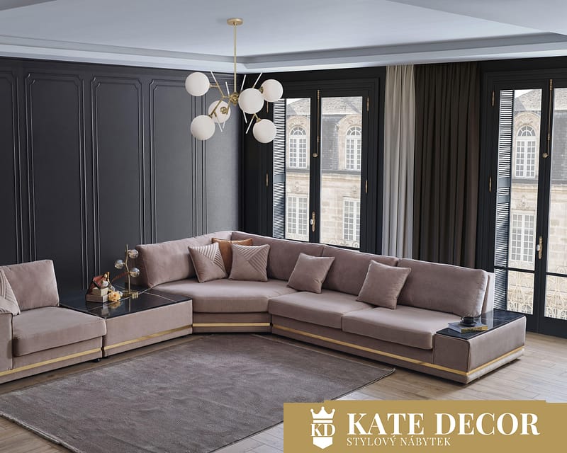 Rozměry: šířka 228 / 295 cm, výška 87 cm, hloubka 87 cm.