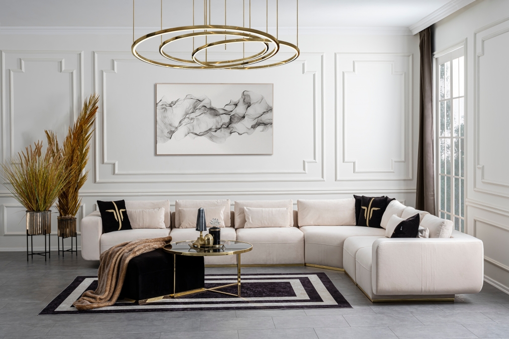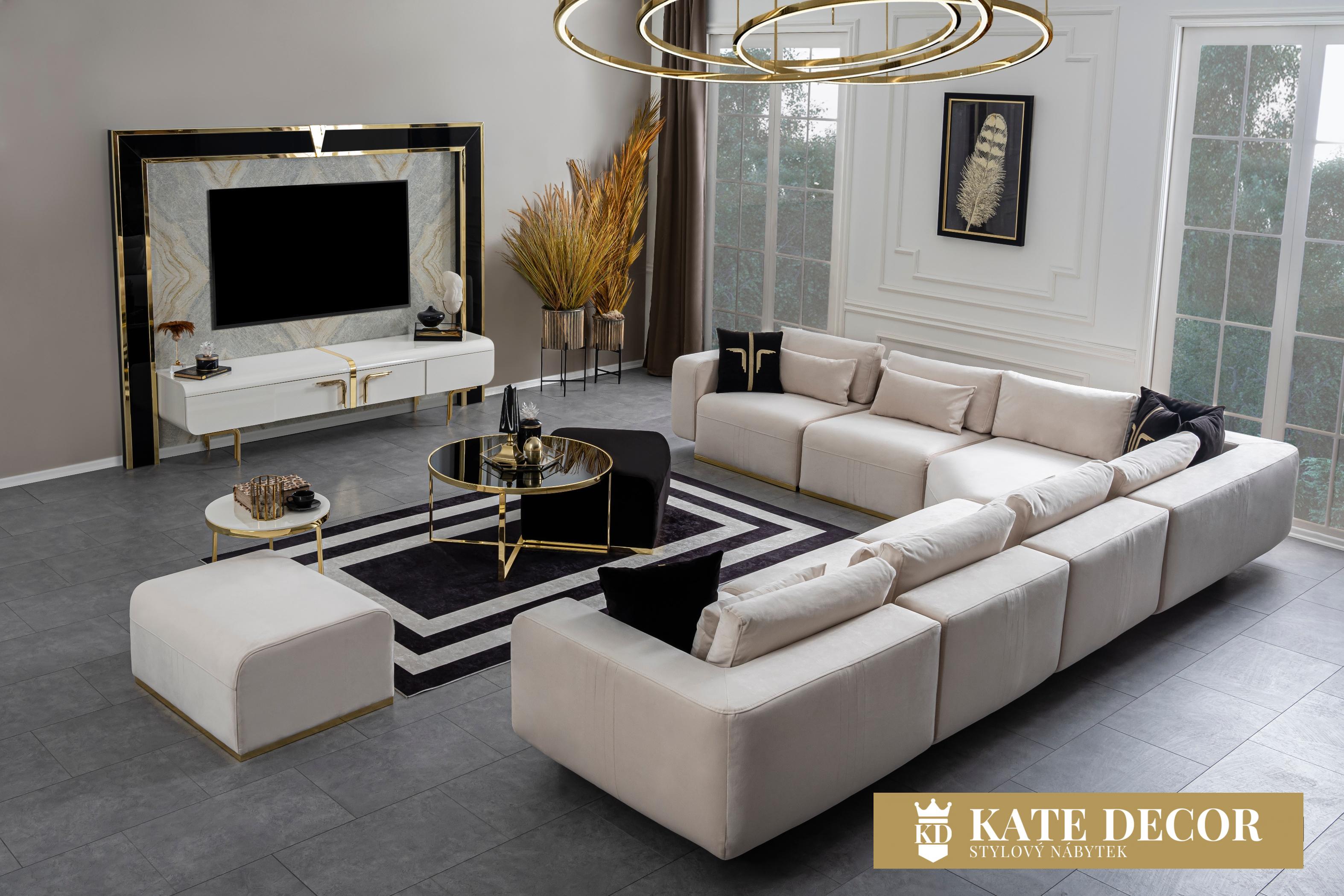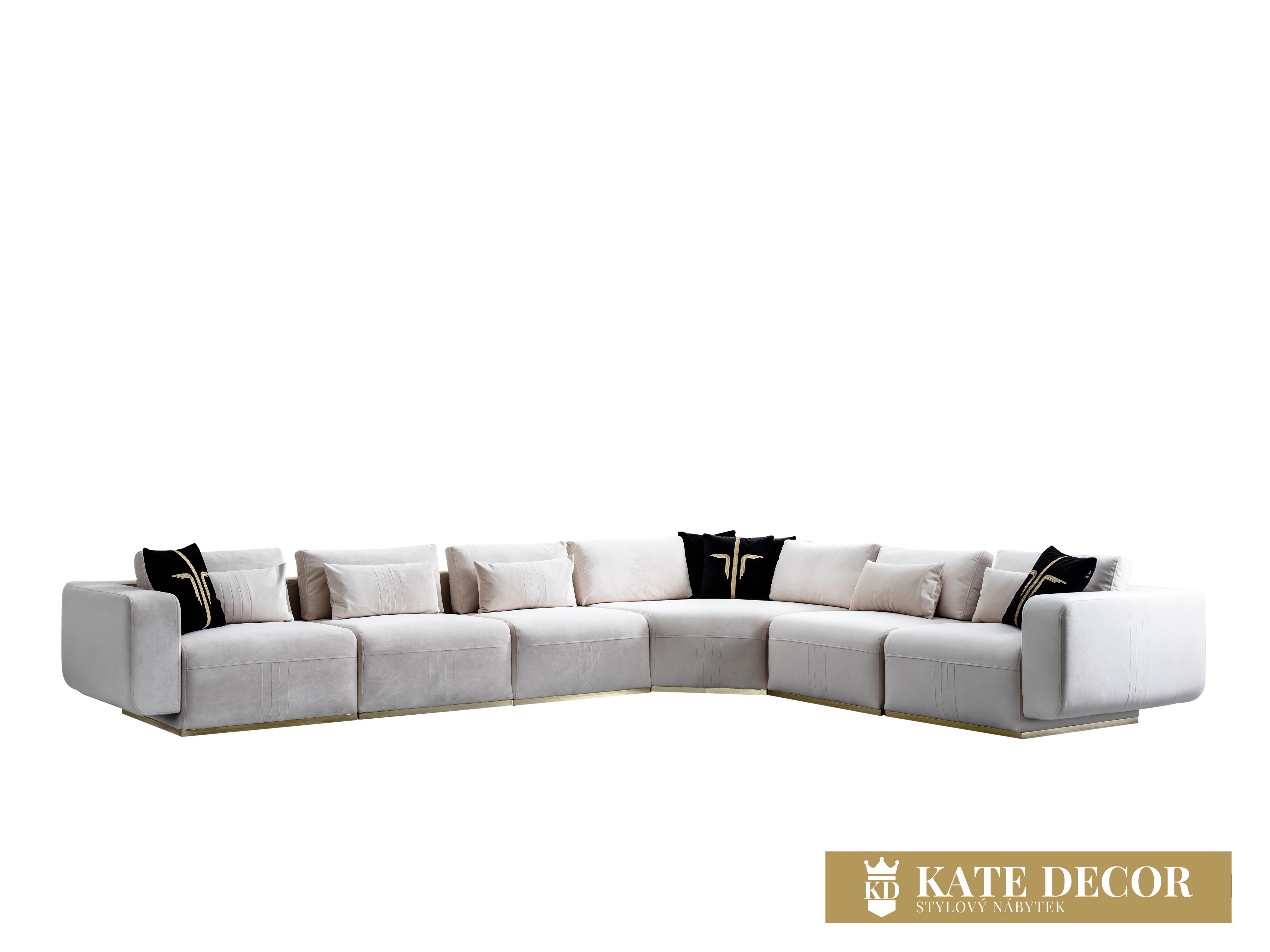 Rohová sedací souprava NEFI svou elegancí a šarmem dodá Vašemu pokoji jedinečný vzhled a umožní vám dosáhnout vysněného pohodlí a útulnosti. Při jeho výrobě byly použity moderní dekory, které spolu s barevnou harmonií a zlacenými kovovými detaily dodávají soupravě působivý vzhled a styl.