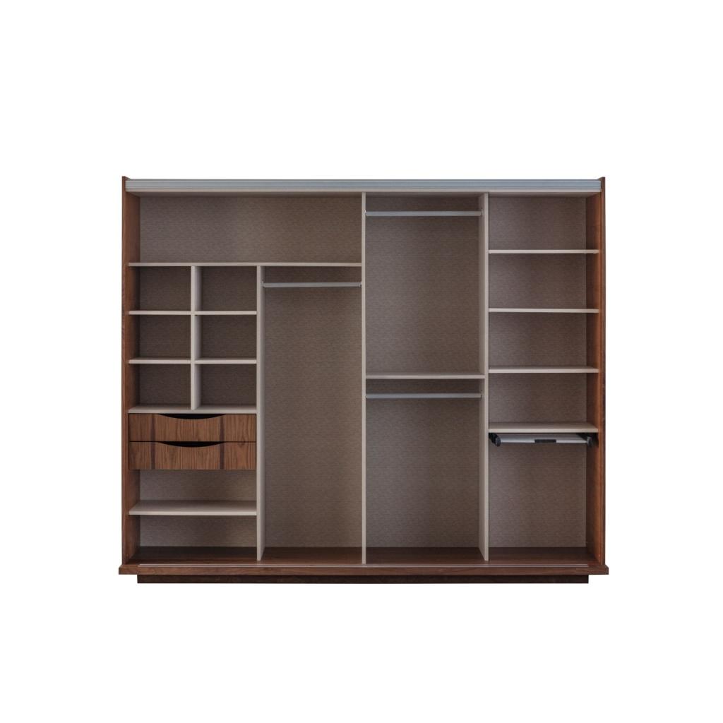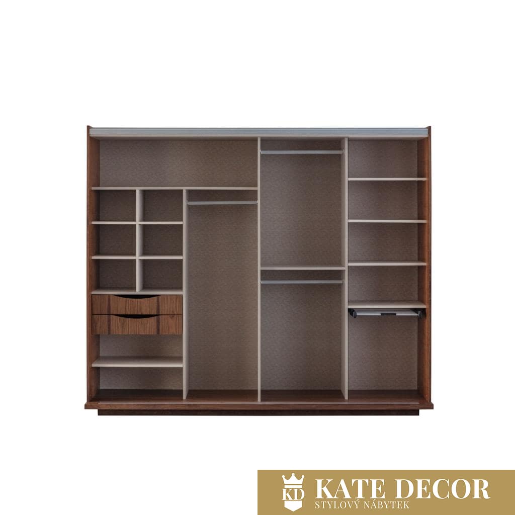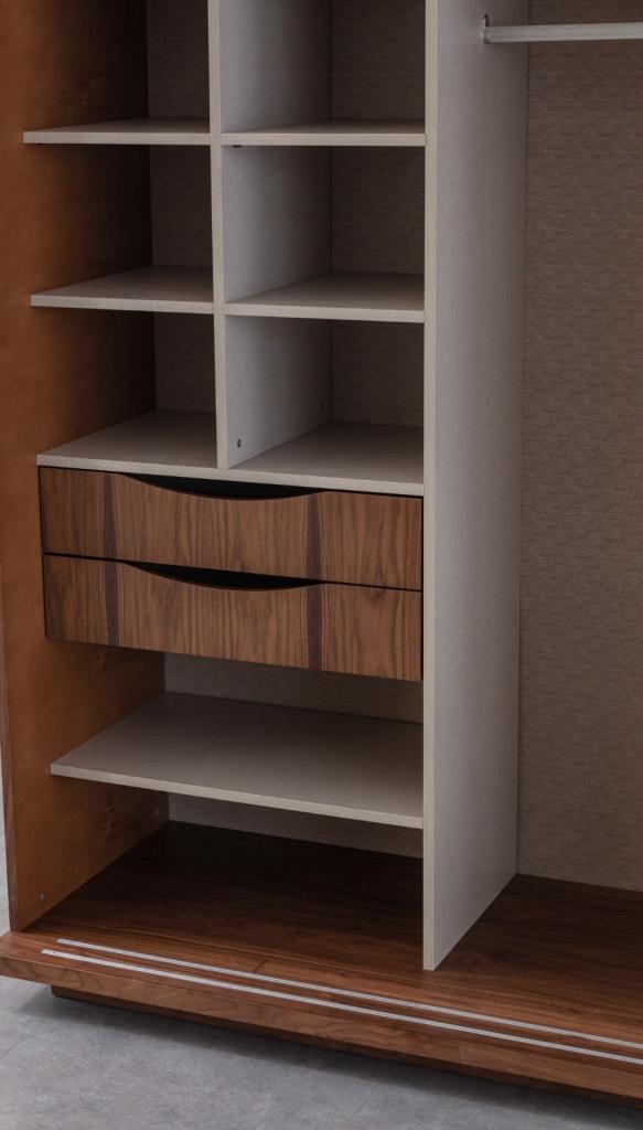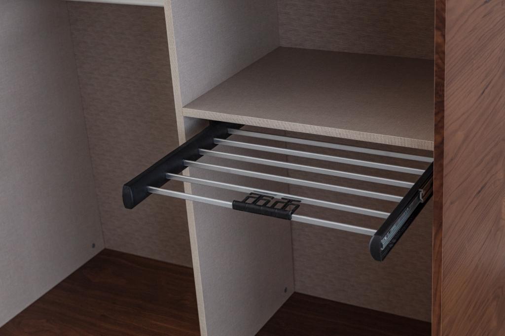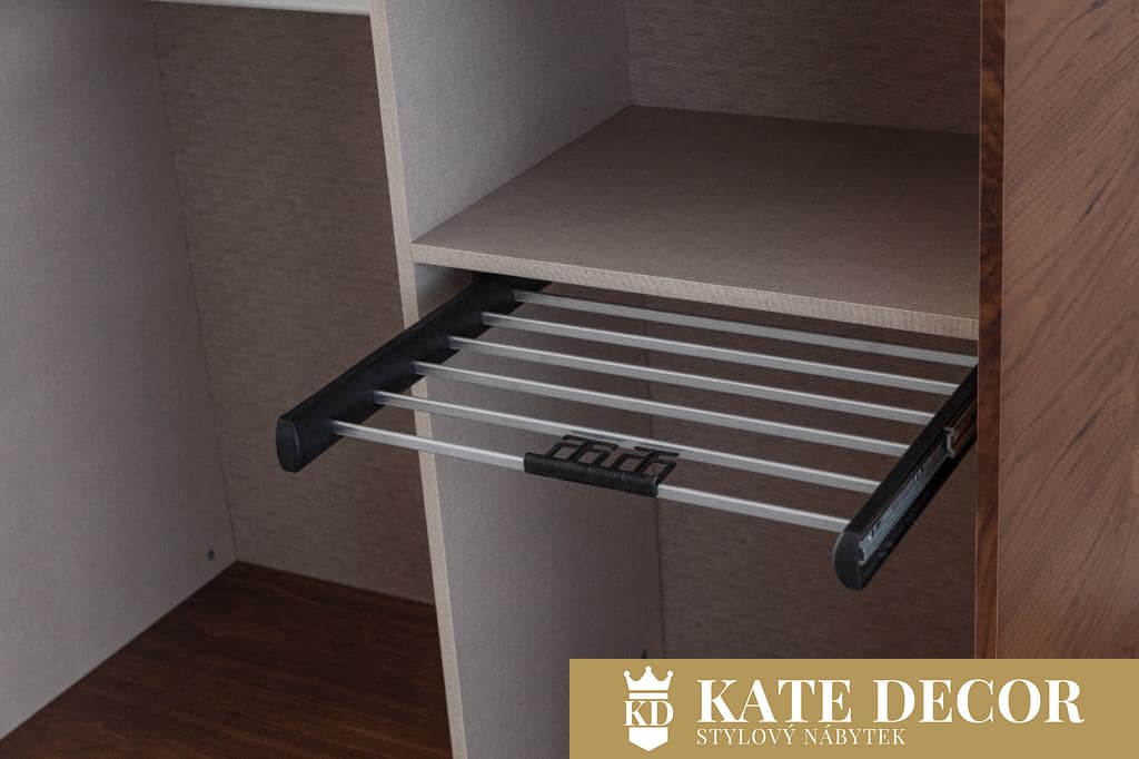 – šatní skříň se 2 skrytými zásuvkami, několika širokými policemi a věšáky;