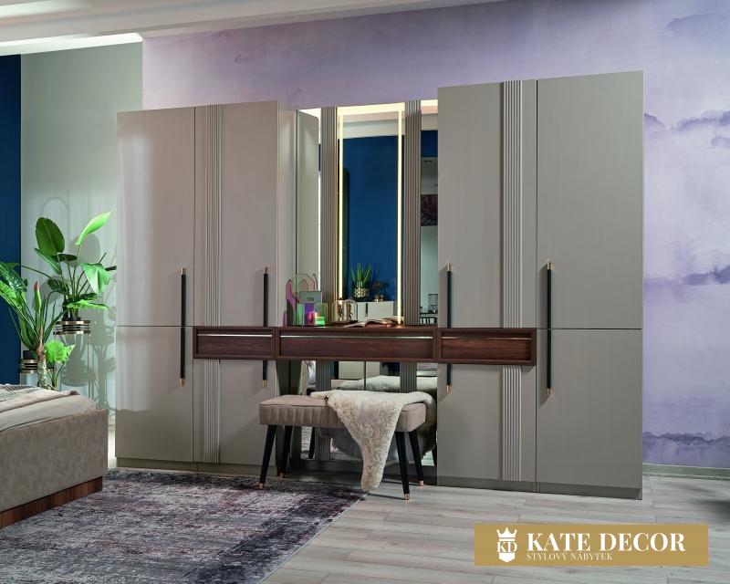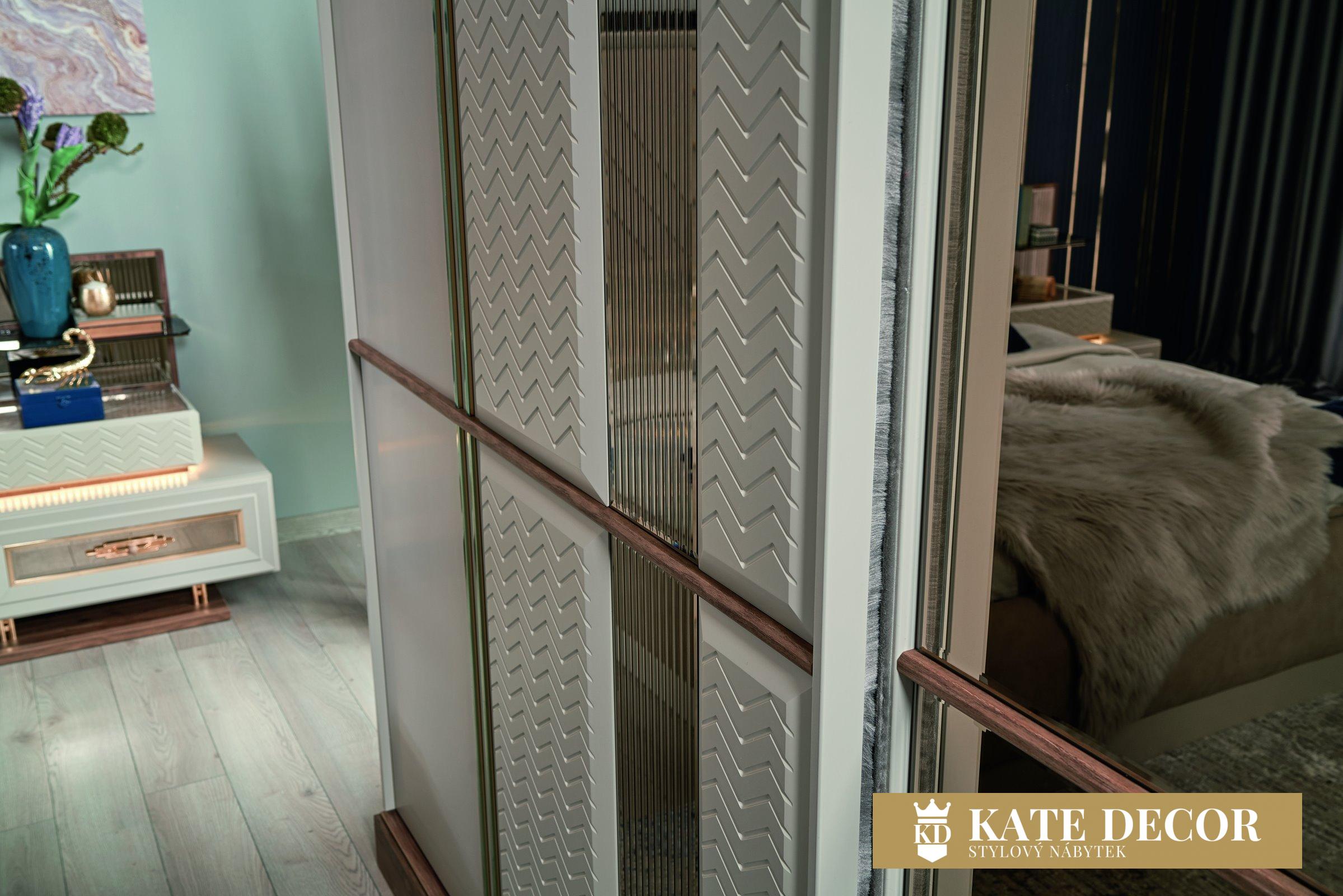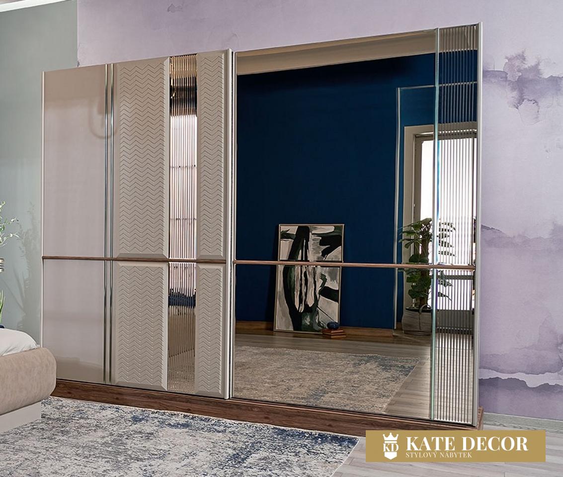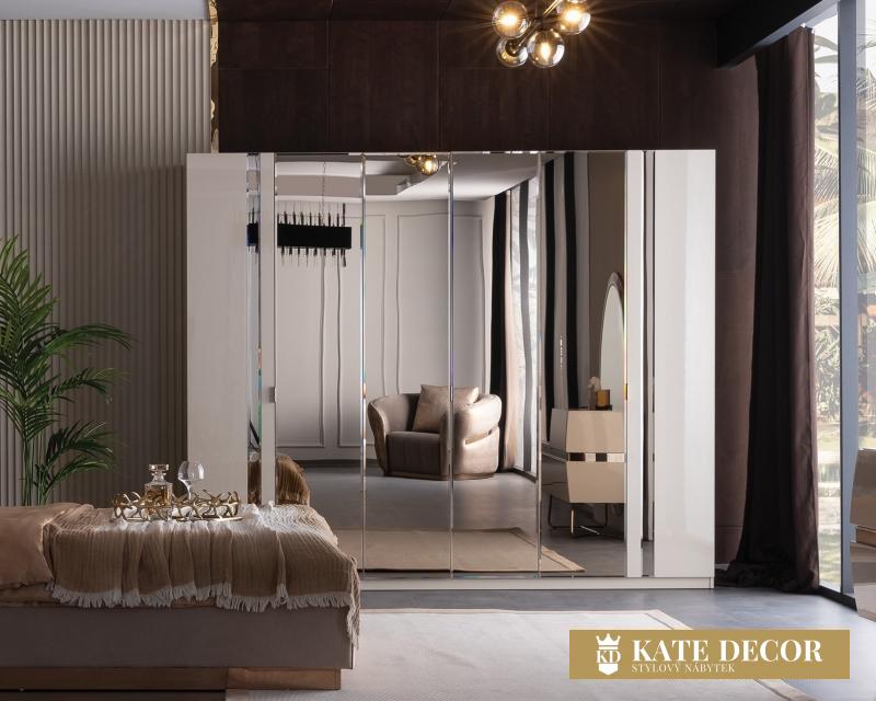 Kombinace béžové a hnědé se zlatými tóny a zrcadlem vytvoří v pokoji jinou atmosféru. Sada dodá Vašemu pokoji eleganci díky zrcadlovým aplikacím, zlaceným kovovým úchytkám, vysokým černým kovovým nohám a modernímu designu a díky funkčním detailům Vám také usnadní život. Použité jemné dřevotřískové desky, materiály a mechanismy odolné proti poškrábání dokazují kvalitu výrobku a zaručují jeho dlouhou životnost.