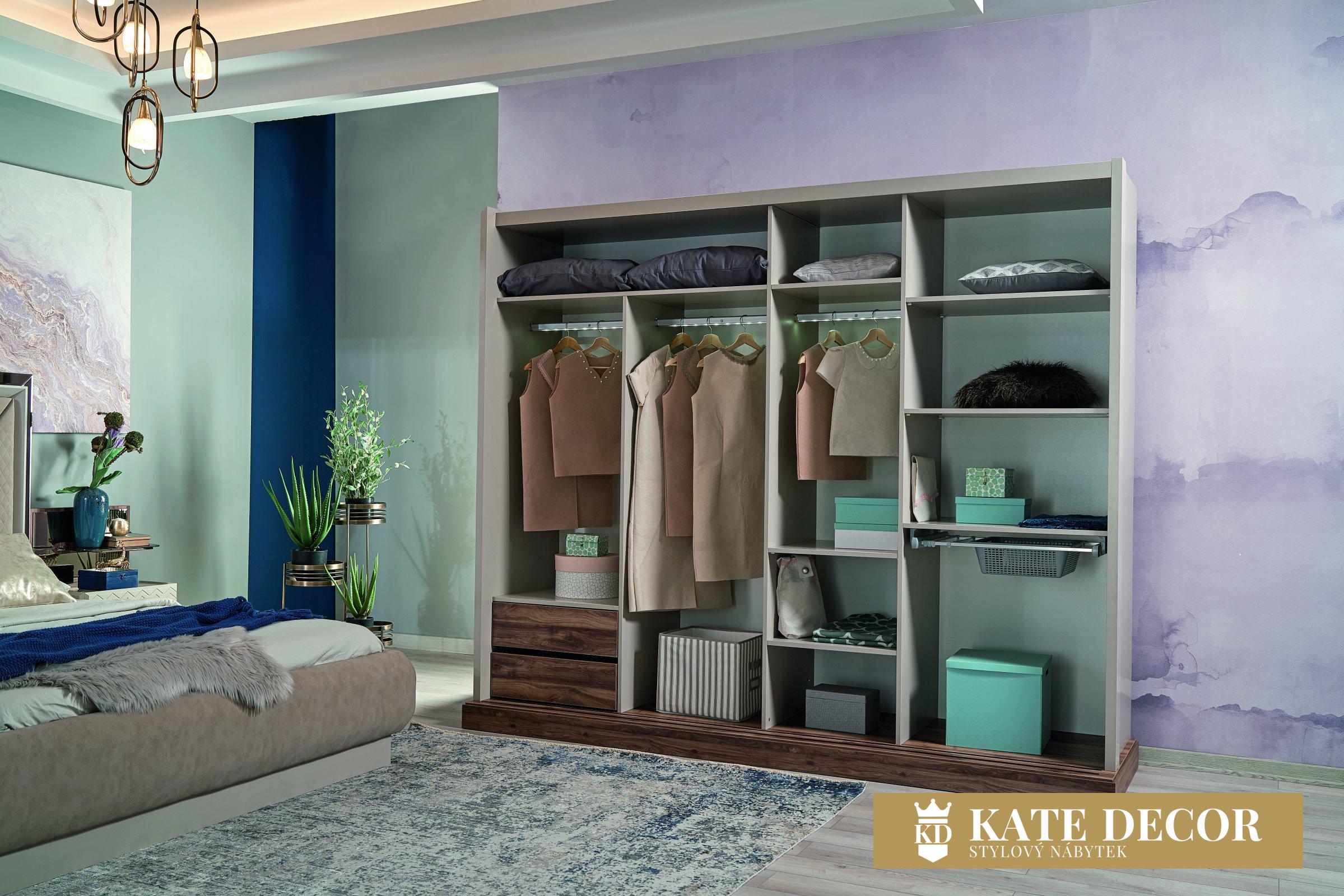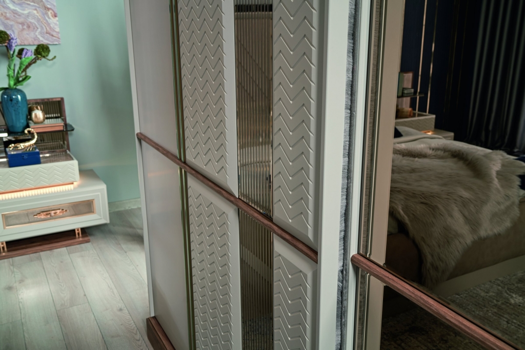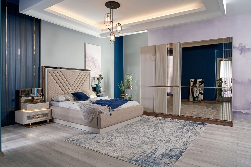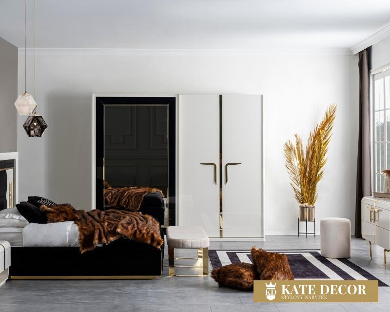 Kombinace béžové a hnědé se zlatými tóny a zrcadlem vytvoří v pokoji jinou atmosféru. Sada dodá Vašemu pokoji eleganci díky zrcadlovým aplikacím, zlaceným kovovým úchytkám, vysokým černým kovovým nohám a modernímu designu a díky funkčním detailům Vám také usnadní život. Použité jemné dřevotřískové desky, materiály a mechanismy odolné proti poškrábání dokazují kvalitu výrobku a zaručují jeho dlouhou životnost.