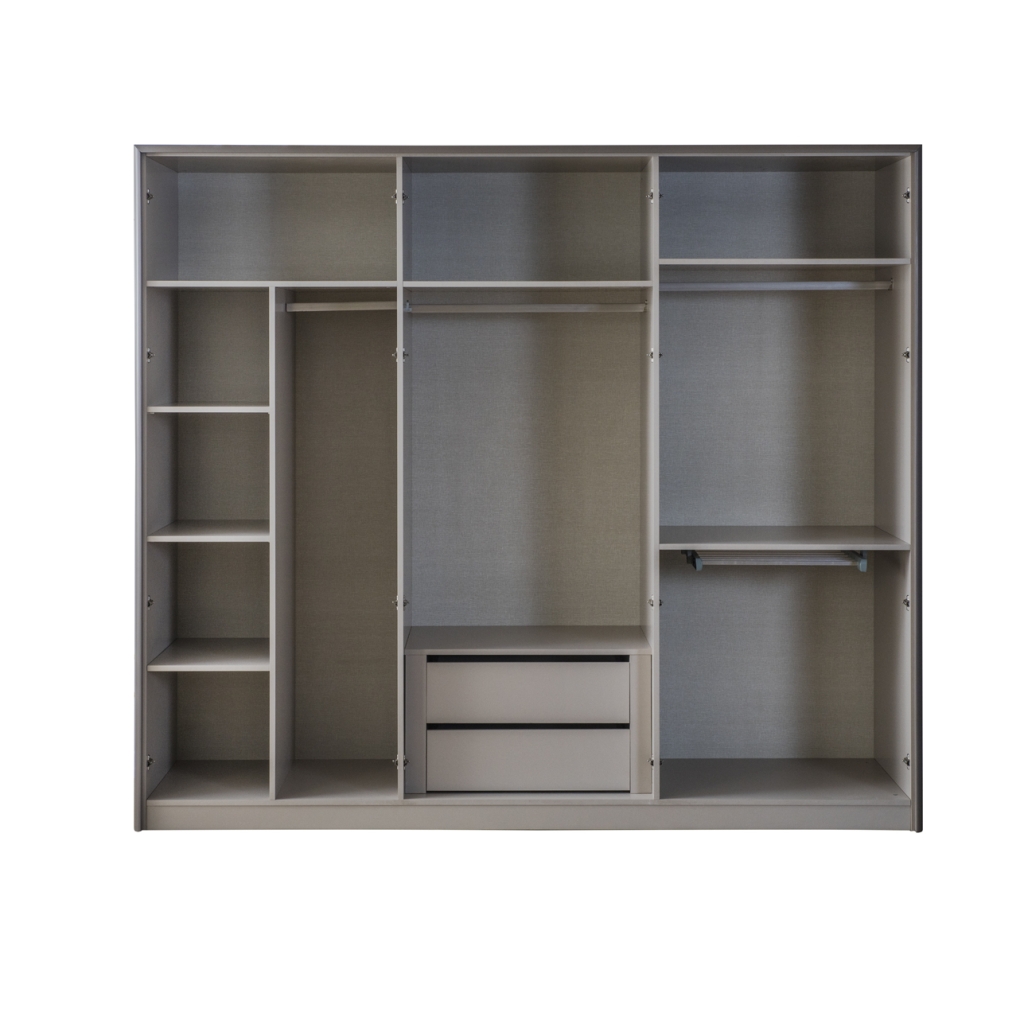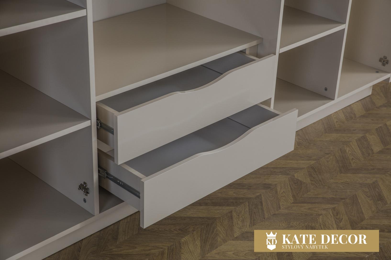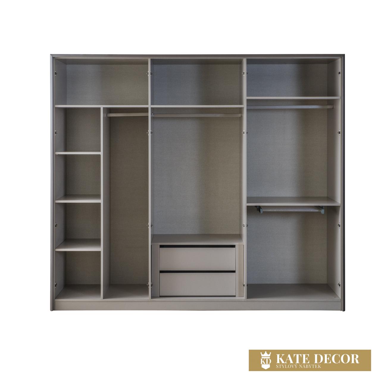 – šatní skříň se 2 skrytými zásuvkami, několika širokými policemi a věšáky;