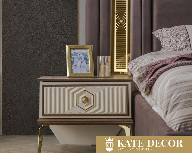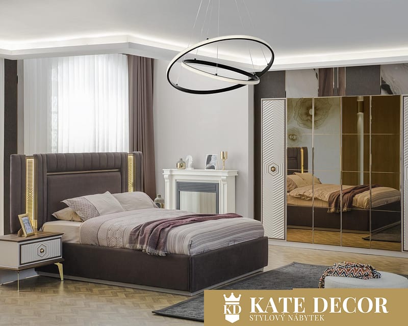 Šatní skříň NORA je výrazem moderních detailů, které jsou ústředním motivem nových přístupů k životu. Geometrický dekor v bílé barvě mile kontrastuje se zlatými úchytkami i zdobnými liniemi zrcadlových tabulí. Svým stylem vnese do Vašeho pokoje moderní atmosféru a působí neuvěřitelně svěže a krásně. Model, který už jen svým vzhledem prozrazuje ruční práci. Detaily, nuance a všechny vlastnosti jsou důkazem této vytříbenosti. Osvětlení LED na čele postele a barevná harmonie zdobí soupravu a činí ji středem pozornosti. Povrchy cedrových dřevotřískových desek jsou opracovány pod úhlem 45 stupňů, což svědčí o jejich třídě, odolnosti a rafinovanosti. Základní mechanismus spolu s velkou šatní skříní poskytují dostatek vnitřního úložného prostoru. V posteli byly plně uplatněny různé metody kapitonování, které z ní činí nepostradatelný model pro spaní.