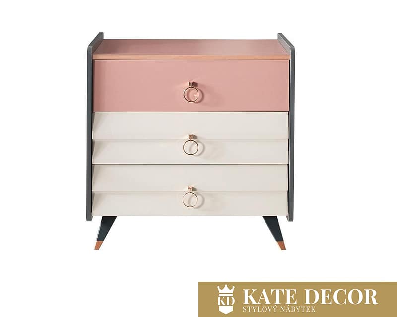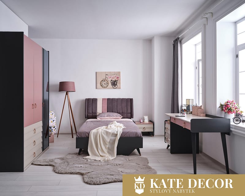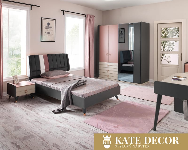 Děláme vše pro to, aby byl svět Vašich malých princezen ještě kouzelnější a zábavnější. Sada má moderní a jedinečný design, je navržena tak, aby byla používána po mnoho let bez jakékoli deformace. Použité materiály a tkaniny dále zvyšují komfortní zónu. Sada s každým detailem a dekorem přináší estetiku do Vašeho pokoje. Toto je místnost, kde se Vaše děti vzdálí od negativních zážitků, zapomenou na potíže, které se staly, a budou jen relaxovat a užívat si pohodlí a klidu. Šatní skříň SETRA oslovuje svou něžnou růžovou barvou a zároveň moderní kombinací šedé a bílé, zlatými detaily úchytek, lamelovým zdobením čela i velkým zrcadlem v antracitovém odstínu. Hladký povrch je příjemný na dotyk. Četnost úložného prostoru skříně umožňuje každé princezně či slečnám uschovat všechna svá přání, sny a tajemství.