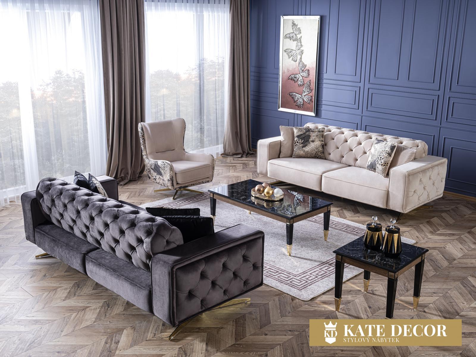 Od speciálně navržené obývací sestavy PARIS neodtrhnete oči. Výrazný design je připraven zaujmout své místo ve Vaší domácnosti a vytvořit relaxační atmosféru. Zatímco zlaté tóny a kapitolové dekory oslňují oči a zdůrazňují exkluzivitu křesel, použité materiály a mechanismy zaručují jejich dlouhou životnost a nenahraditelné pohodlí při sezení. U čalounění se dává přednost měkké strukturované dovážené tkanině, díky níž se zvyšuje odolnost proti skvrnám a výrobky lze používat mnoho let bez deformace.