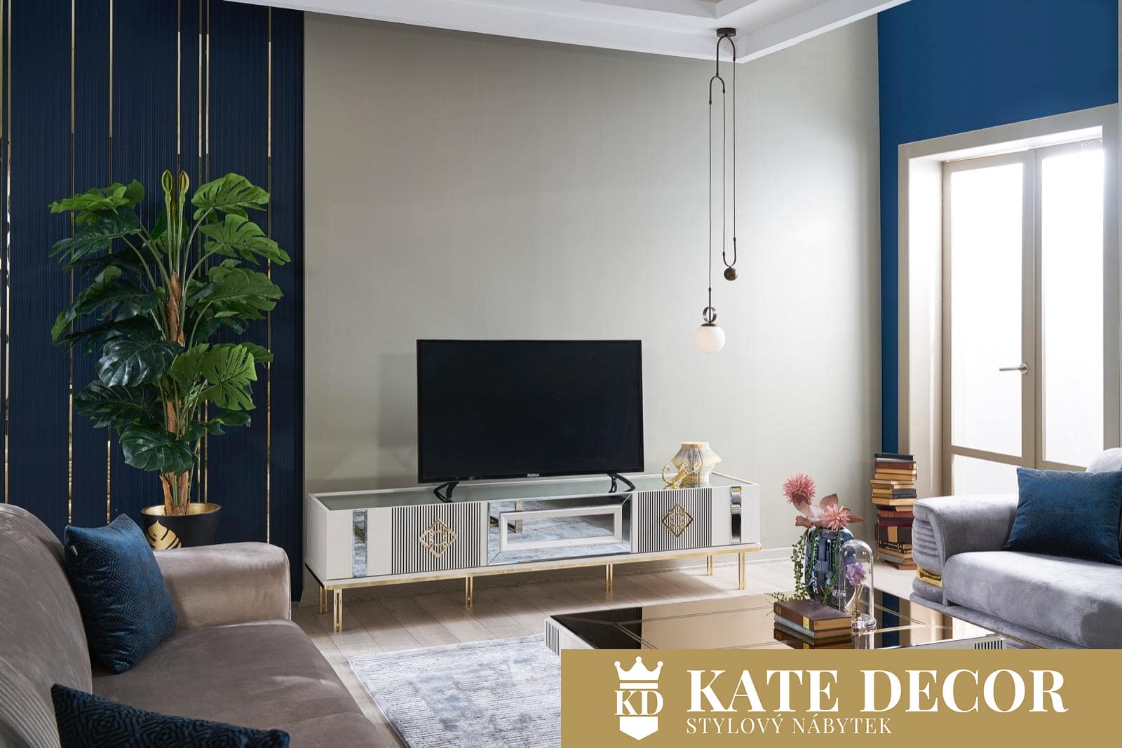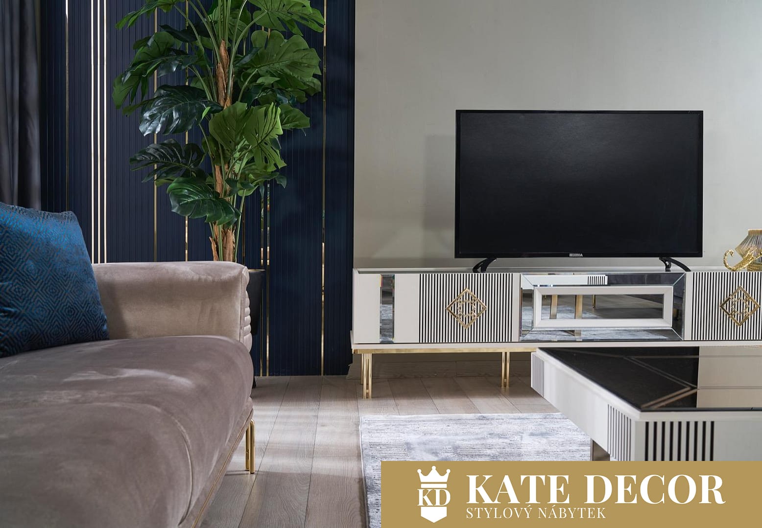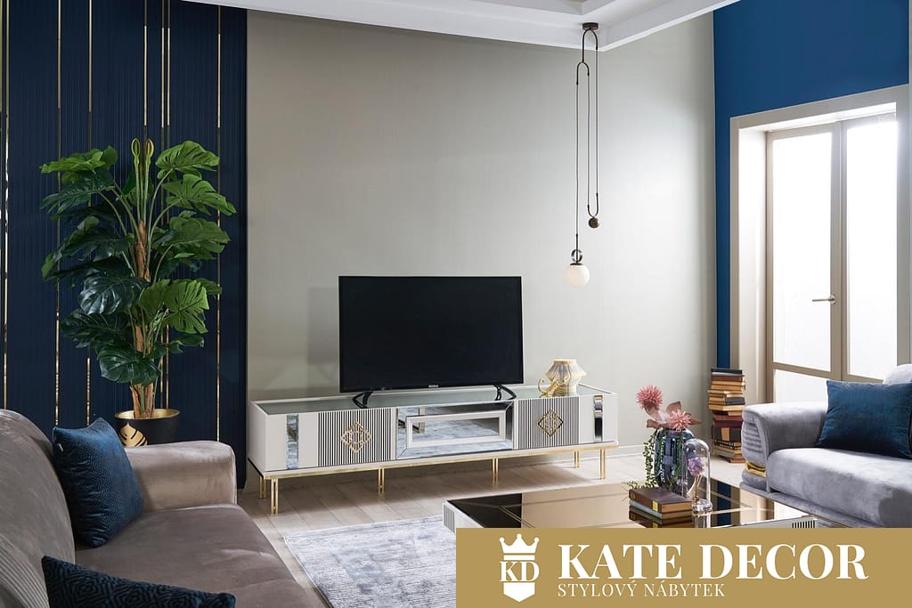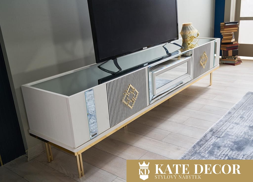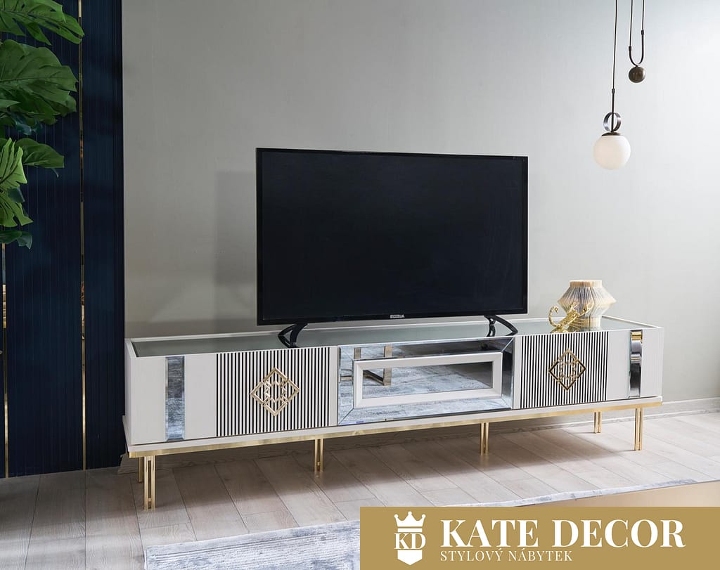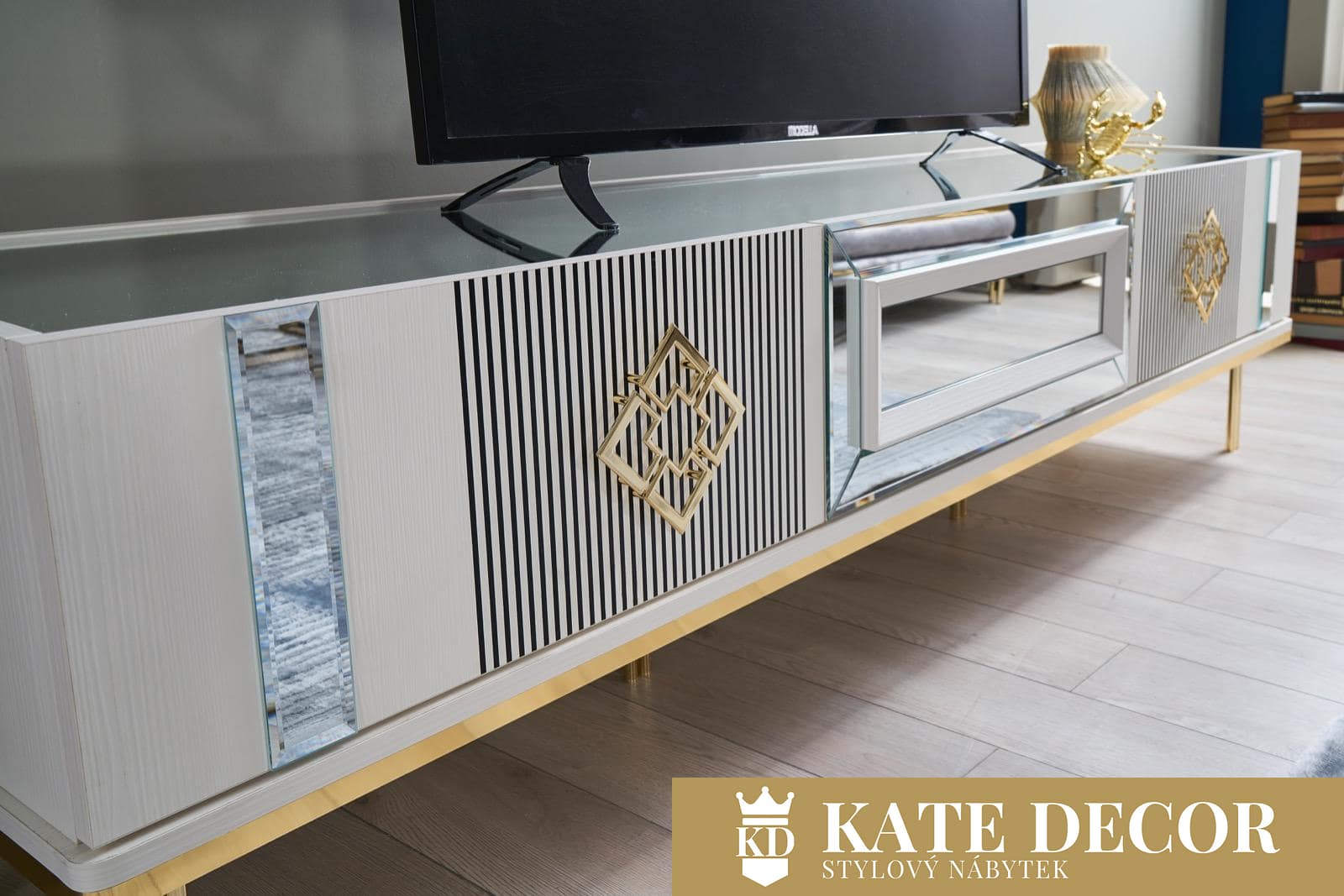 Kombinace šedé a bílé se stříbrnými a zlatými tóny a zrcadlem vytvoří ve Vašem pokoji jinou atmosféru. TV stolek dodá Vašemu pokoji eleganci svými zrcadlovými aplikacemi, kovovými úchytkami a moderním designem, navíc Vám usnadní život díky svým funkčním detailům. Použité jemné dřevotřískové desky odolné proti poškrábání, materiály a mechanismy dokazují kvalitu výrobku a zaručují jeho dlouhodobé používání.