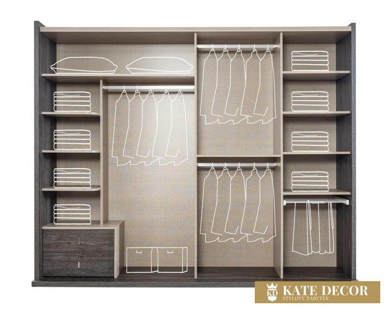 Šatní skříň se 2 posuvnými a jedněmi otevíracími dveřmi.